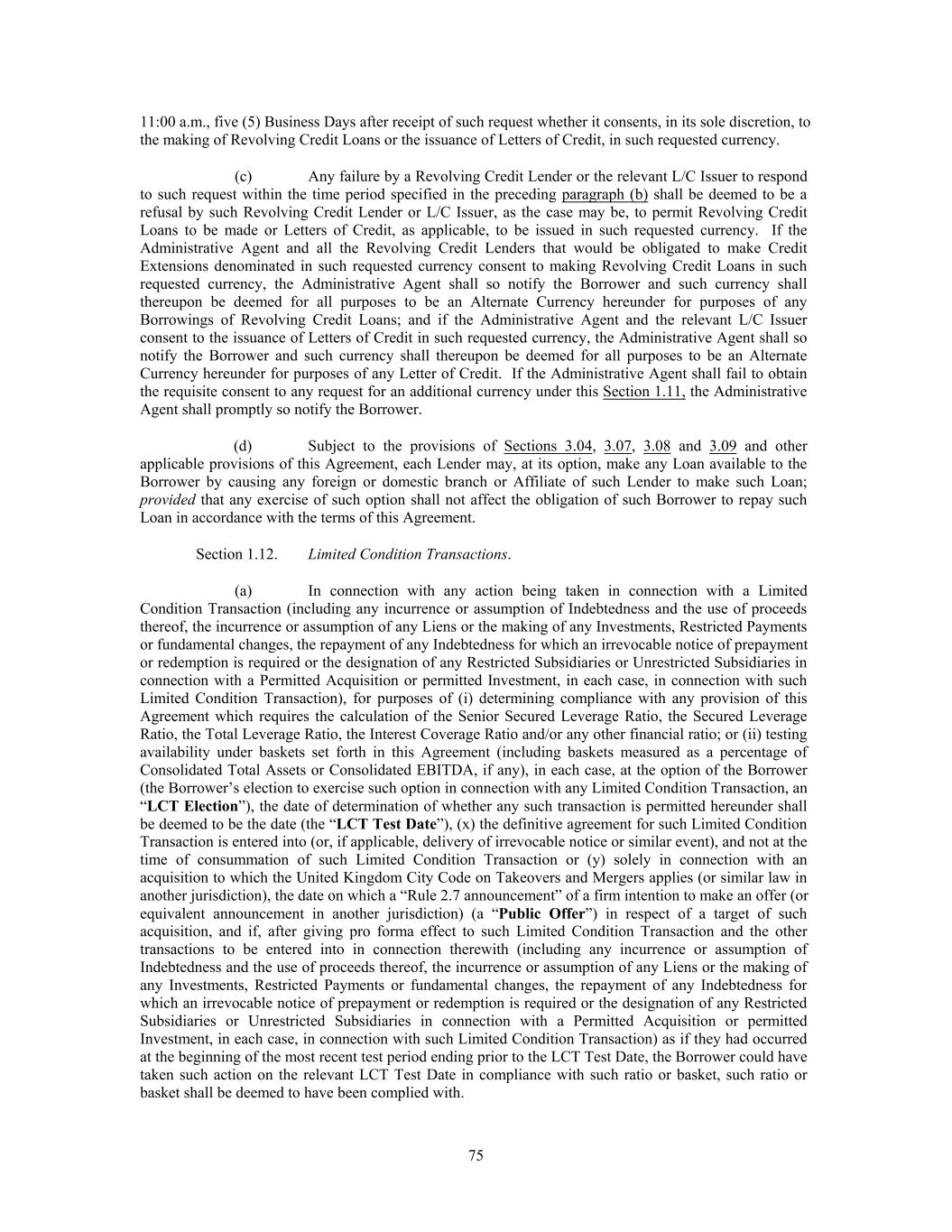 11:00 a.m., five (5) Business Days after receipt of such request whether it consents, in its sole discretion, to the making of Revolving Credit Loans or the issuance of Letters of Credit, in such requested currency. (c) Any failure by a Revolving Credit Lender or the relevant L/C Issuer to respond to such request within the time period specified in the preceding paragraph (b) shall be deemed to be a refusal by such Revolving Credit Lender or L/C Issuer, as the case may be, to permit Revolving Credit Loans to be made or Letters of Credit, as applicable, to be issued in such requested currency. If the Administrative Agent and all the Revolving Credit Lenders that would be obligated to make Credit Extensions denominated in such requested currency consent to making Revolving Credit Loans in such requested currency, the Administrative Agent shall so notify the Borrower and such currency shall thereupon be deemed for all purposes to be an Alternate Currency hereunder for purposes of any Borrowings of Revolving Credit Loans; and if the Administrative Agent and the relevant L/C Issuer consent to the issuance of Letters of Credit in such requested currency, the Administrative Agent shall so notify the Borrower and such currency shall thereupon be deemed for all purposes to be an Alternate Currency hereunder for purposes of any Letter of Credit. If the Administrative Agent shall fail to obtain the requisite consent to any request for an additional currency under this Section 1.11, the Administrative Agent shall promptly so notify the Borrower. (d) Subject to the provisions of Sections 3.04, 3.07, 3.08 and 3.09 and other applicable provisions of this Agreement, each Lender may, at its option, make any Loan available to the Borrower by causing any foreign or domestic branch or Affiliate of such Lender to make such Loan; provided that any exercise of such option shall not affect the obligation of such Borrower to repay such Loan in accordance with the terms of this Agreement. Section 1.12. Limited Condition Transactions. (a) In connection with any action being taken in connection with a Limited Condition Transaction (including any incurrence or assumption of Indebtedness and the use of proceeds thereof, the incurrence or assumption of any Liens or the making of any Investments, Restricted Payments or fundamental changes, the repayment of any Indebtedness for which an irrevocable notice of prepayment or redemption is required or the designation of any Restricted Subsidiaries or Unrestricted Subsidiaries in connection with a Permitted Acquisition or permitted Investment, in each case, in connection with such Limited Condition Transaction), for purposes of (i) determining compliance with any provision of this Agreement which requires the calculation of the Senior Secured Leverage Ratio, the Secured Leverage Ratio, the Total Leverage Ratio, the Interest Coverage Ratio and/or any other financial ratio; or (ii) testing availability under baskets set forth in this Agreement (including baskets measured as a percentage of Consolidated Total Assets or Consolidated EBITDA, if any), in each case, at the option of the Borrower (the Borrower’s election to exercise such option in connection with any Limited Condition Transaction, an “LCT Election”), the date of determination of whether any such transaction is permitted hereunder shall be deemed to be the date (the “LCT Test Date”), (x) the definitive agreement for such Limited Condition Transaction is entered into (or, if applicable, delivery of irrevocable notice or similar event), and not at the time of consummation of such Limited Condition Transaction or (y) solely in connection with an acquisition to which the United Kingdom City Code on Takeovers and Mergers applies (or similar law in another jurisdiction), the date on which a “Rule 2.7 announcement” of a firm intention to make an offer (or equivalent announcement in another jurisdiction) (a “Public Offer”) in respect of a target of such acquisition, and if, after giving pro forma effect to such Limited Condition Transaction and the other transactions to be entered into in connection therewith (including any incurrence or assumption of Indebtedness and the use of proceeds thereof, the incurrence or assumption of any Liens or the making of any Investments, Restricted Payments or fundamental changes, the repayment of any Indebtedness for which an irrevocable notice of prepayment or redemption is required or the designation of any Restricted Subsidiaries or Unrestricted Subsidiaries in connection with a Permitted Acquisition or permitted Investment, in each case, in connection with such Limited Condition Transaction) as if they had occurred at the beginning of the most recent test period ending prior to the LCT Test Date, the Borrower could have taken such action on the relevant LCT Test Date in compliance with such ratio or basket, such ratio or basket shall be deemed to have been complied with. 75