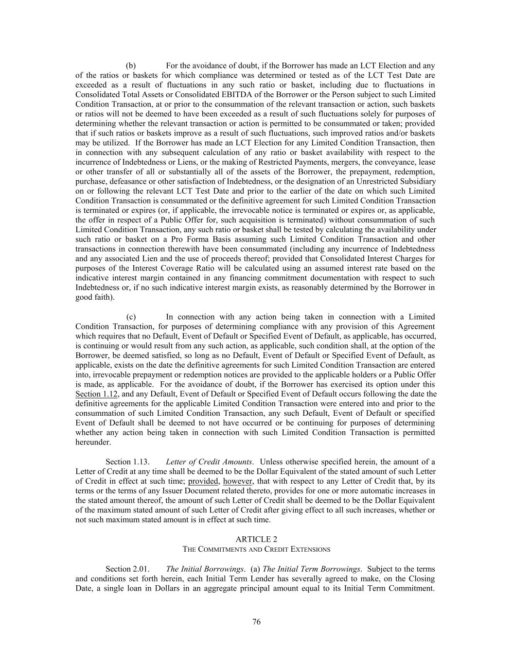 (b) For the avoidance of doubt, if the Borrower has made an LCT Election and any of the ratios or baskets for which compliance was determined or tested as of the LCT Test Date are exceeded as a result of fluctuations in any such ratio or basket, including due to fluctuations in Consolidated Total Assets or Consolidated EBITDA of the Borrower or the Person subject to such Limited Condition Transaction, at or prior to the consummation of the relevant transaction or action, such baskets or ratios will not be deemed to have been exceeded as a result of such fluctuations solely for purposes of determining whether the relevant transaction or action is permitted to be consummated or taken; provided that if such ratios or baskets improve as a result of such fluctuations, such improved ratios and/or baskets may be utilized. If the Borrower has made an LCT Election for any Limited Condition Transaction, then in connection with any subsequent calculation of any ratio or basket availability with respect to the incurrence of Indebtedness or Liens, or the making of Restricted Payments, mergers, the conveyance, lease or other transfer of all or substantially all of the assets of the Borrower, the prepayment, redemption, purchase, defeasance or other satisfaction of Indebtedness, or the designation of an Unrestricted Subsidiary on or following the relevant LCT Test Date and prior to the earlier of the date on which such Limited Condition Transaction is consummated or the definitive agreement for such Limited Condition Transaction is terminated or expires (or, if applicable, the irrevocable notice is terminated or expires or, as applicable, the offer in respect of a Public Offer for, such acquisition is terminated) without consummation of such Limited Condition Transaction, any such ratio or basket shall be tested by calculating the availability under such ratio or basket on a Pro Forma Basis assuming such Limited Condition Transaction and other transactions in connection therewith have been consummated (including any incurrence of Indebtedness and any associated Lien and the use of proceeds thereof; provided that Consolidated Interest Charges for purposes of the Interest Coverage Ratio will be calculated using an assumed interest rate based on the indicative interest margin contained in any financing commitment documentation with respect to such Indebtedness or, if no such indicative interest margin exists, as reasonably determined by the Borrower in good faith). (c) In connection with any action being taken in connection with a Limited Condition Transaction, for purposes of determining compliance with any provision of this Agreement which requires that no Default, Event of Default or Specified Event of Default, as applicable, has occurred, is continuing or would result from any such action, as applicable, such condition shall, at the option of the Borrower, be deemed satisfied, so long as no Default, Event of Default or Specified Event of Default, as applicable, exists on the date the definitive agreements for such Limited Condition Transaction are entered into, irrevocable prepayment or redemption notices are provided to the applicable holders or a Public Offer is made, as applicable. For the avoidance of doubt, if the Borrower has exercised its option under this Section 1.12, and any Default, Event of Default or Specified Event of Default occurs following the date the definitive agreements for the applicable Limited Condition Transaction were entered into and prior to the consummation of such Limited Condition Transaction, any such Default, Event of Default or specified Event of Default shall be deemed to not have occurred or be continuing for purposes of determining whether any action being taken in connection with such Limited Condition Transaction is permitted hereunder. Section 1.13. Letter of Credit Amounts. Unless otherwise specified herein, the amount of a Letter of Credit at any time shall be deemed to be the Dollar Equivalent of the stated amount of such Letter of Credit in effect at such time; provided, however, that with respect to any Letter of Credit that, by its terms or the terms of any Issuer Document related thereto, provides for one or more automatic increases in the stated amount thereof, the amount of such Letter of Credit shall be deemed to be the Dollar Equivalent of the maximum stated amount of such Letter of Credit after giving effect to all such increases, whether or not such maximum stated amount is in effect at such time. ARTICLE 2 THE COMMITMENTS AND CREDIT EXTENSIONS Section 2.01. The Initial Borrowings. (a) The Initial Term Borrowings. Subject to the terms and conditions set forth herein, each Initial Term Lender has severally agreed to make, on the Closing Date, a single loan in Dollars in an aggregate principal amount equal to its Initial Term Commitment. 76