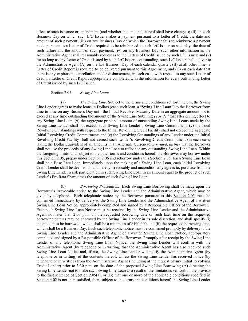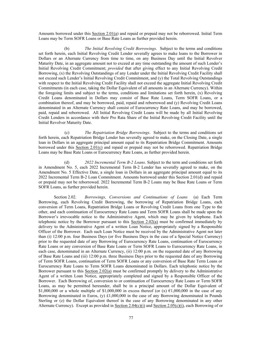 Amounts borrowed under this Section 2.01(a) and repaid or prepaid may not be reborrowed. Initial Term Loans may be Term SOFR Loans or Base Rate Loans as further provided herein. (b) The Initial Revolving Credit Borrowings. Subject to the terms and conditions set forth herein, each Initial Revolving Credit Lender severally agrees to make loans to the Borrower in Dollars or an Alternate Currency from time to time, on any Business Day until the Initial Revolver Maturity Date, in an aggregate amount not to exceed at any time outstanding the amount of such Lender’s Initial Revolving Credit Commitment; provided that after giving effect to any Initial Revolving Credit Borrowing, (x) the Revolving Outstandings of any Lender under the Initial Revolving Credit Facility shall not exceed such Lender’s Initial Revolving Credit Commitment, and (y) the Total Revolving Outstandings with respect to the Initial Revolving Credit Facility shall not exceed the aggregate Initial Revolving Credit Commitments (in each case, taking the Dollar Equivalent of all amounts in an Alternate Currency). Within the foregoing limits and subject to the terms, conditions and limitations set forth herein, (x) Revolving Credit Loans denominated in Dollars may consist of Base Rate Loans, Term SOFR Loans, or a combination thereof, and may be borrowed, paid, repaid and reborrowed and (y) Revolving Credit Loans denominated in an Alternate Currency shall consist of Eurocurrency Rate Loans, and may be borrowed, paid, repaid and reborrowed. All Initial Revolving Credit Loans will be made by all Initial Revolving Credit Lenders in accordance with their Pro Rata Share of the Initial Revolving Credit Facility until the Initial Revolver Maturity Date. (c) The Repatriation Bridge Borrowings. Subject to the terms and conditions set forth herein, each Repatriation Bridge Lender has severally agreed to make, on the Closing Date, a single loan in Dollars in an aggregate principal amount equal to its Repatriation Bridge Commitment. Amounts borrowed under this Section 2.01(c) and repaid or prepaid may not be reborrowed. Repatriation Bridge Loans may be Base Rate Loans or Eurocurrency Rate Loans, as further provided herein. (d) 2022 Incremental Term B-2 Loans. Subject to the term and conditions set forth in Amendment No. 5, each 2022 Incremental Term B-2 Lender has severally agreed to make, on the Amendment No. 5 Effective Date, a single loan in Dollars in an aggregate principal amount equal to its 2022 Incremental Term B-2 Loan Commitment. Amounts borrowed under this Section 2.01(d) and repaid or prepaid may not be reborrowed. 2022 Incremental Term B-2 Loans may be Base Rate Loans or Term SOFR Loans, as further provided herein. Section 2.02. Borrowings, Conversions and Continuations of Loans (a) Each Term Borrowing, each Revolving Credit Borrowing, the borrowing of Repatriation Bridge Loans, each conversion of Term Loans, Repatriation Bridge Loans or Revolving Credit Loans from one Type to the other, and each continuation of Eurocurrency Rate Loans and Term SOFR Loans shall be made upon the Borrower’s irrevocable notice to the Administrative Agent, which may be given by telephone. Each telephonic notice by the Borrower pursuant to this Section 2.02(a) must be confirmed immediately by delivery to the Administrative Agent of a written Loan Notice, appropriately signed by a Responsible Officer of the Borrower. Each such Loan Notice must be received by the Administrative Agent not later than (i) 12:00 p.m. four Business Days (or five Business Days in the case of a Special Notice Currency) prior to the requested date of any Borrowing of Eurocurrency Rate Loans, continuation of Eurocurrency Rate Loans or any conversion of Base Rate Loans or Term SOFR Loans to Eurocurrency Rate Loans, in each case, denominated in an Alternate Currency, (ii) 12:00 p.m. on the requested date of any Borrowing of Base Rate Loans and (iii) 12:00 p.m. three Business Days prior to the requested date of any Borrowing of Term SOFR Loans, continuation of Term SOFR Loans or any conversion of Base Rate Term Loans or Eurocurrency Rate Loans to Term SOFR Loans denominated in Dollars. Each telephonic notice by the Borrower pursuant to this Section 2.02(a) must be confirmed promptly by delivery to the Administrative Agent of a written Loan Notice, appropriately completed and signed by a Responsible Officer of the Borrower. Each Borrowing of, conversion to or continuation of Eurocurrency Rate Loans or Term SOFR Loans, as may be permitted hereunder, shall be in a principal amount of the Dollar Equivalent of $1,000,000 or a whole multiple of $1,000,000 in excess thereof (or (x) €1,000,000 in the case of any Borrowing denominated in Euros, (y) £1,000,000 in the case of any Borrowing denominated in Pounds Sterling or (z) the Dollar Equivalent thereof in the case of any Borrowing denominated in any other Alternate Currency). Except as provided in Section 2.04(c)(i) and Section 2.05(c)(i), each Borrowing of or 77