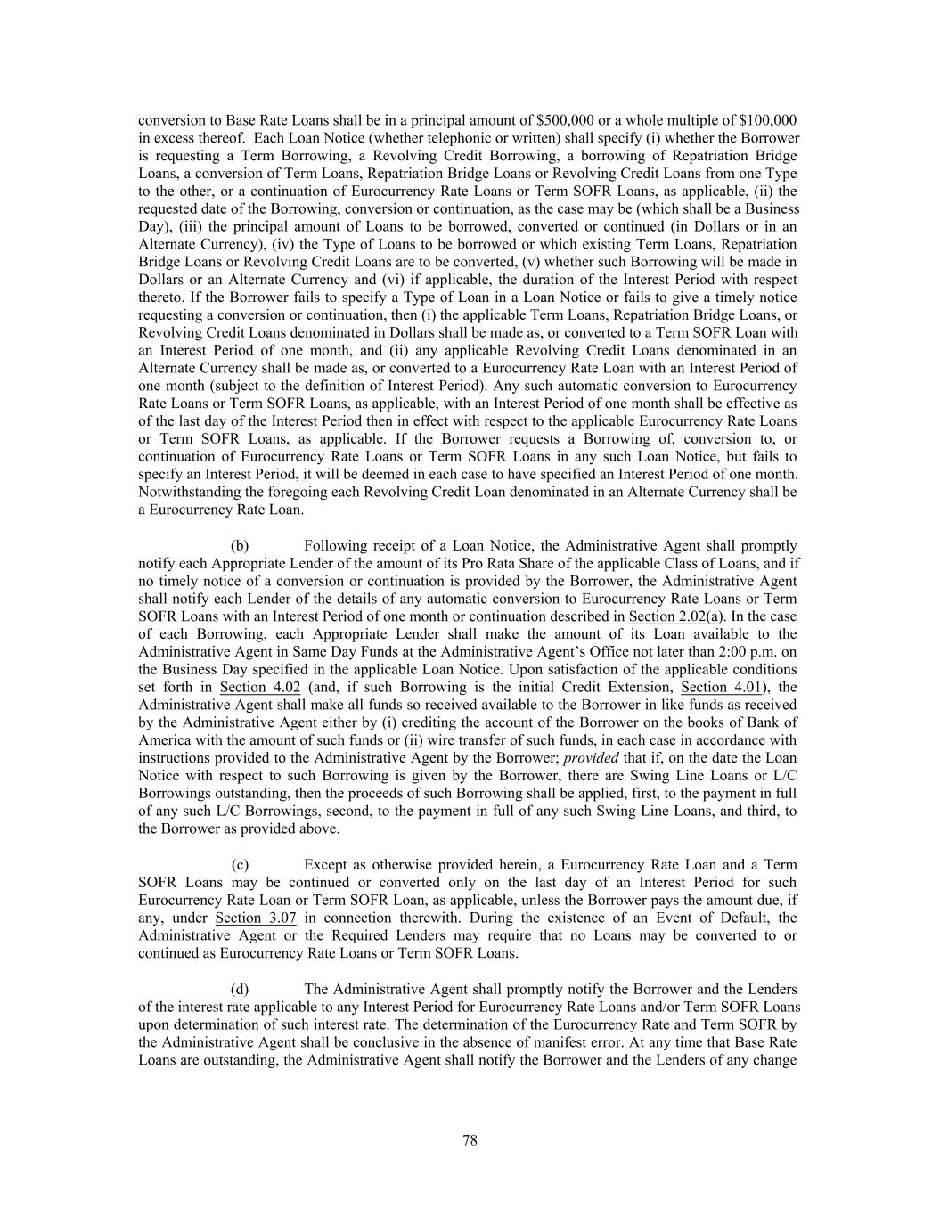 conversion to Base Rate Loans shall be in a principal amount of $500,000 or a whole multiple of $100,000 in excess thereof. Each Loan Notice (whether telephonic or written) shall specify (i) whether the Borrower is requesting a Term Borrowing, a Revolving Credit Borrowing, a borrowing of Repatriation Bridge Loans, a conversion of Term Loans, Repatriation Bridge Loans or Revolving Credit Loans from one Type to the other, or a continuation of Eurocurrency Rate Loans or Term SOFR Loans, as applicable, (ii) the requested date of the Borrowing, conversion or continuation, as the case may be (which shall be a Business Day), (iii) the principal amount of Loans to be borrowed, converted or continued (in Dollars or in an Alternate Currency), (iv) the Type of Loans to be borrowed or which existing Term Loans, Repatriation Bridge Loans or Revolving Credit Loans are to be converted, (v) whether such Borrowing will be made in Dollars or an Alternate Currency and (vi) if applicable, the duration of the Interest Period with respect thereto. If the Borrower fails to specify a Type of Loan in a Loan Notice or fails to give a timely notice requesting a conversion or continuation, then (i) the applicable Term Loans, Repatriation Bridge Loans, or Revolving Credit Loans denominated in Dollars shall be made as, or converted to a Term SOFR Loan with an Interest Period of one month, and (ii) any applicable Revolving Credit Loans denominated in an Alternate Currency shall be made as, or converted to a Eurocurrency Rate Loan with an Interest Period of one month (subject to the definition of Interest Period). Any such automatic conversion to Eurocurrency Rate Loans or Term SOFR Loans, as applicable, with an Interest Period of one month shall be effective as of the last day of the Interest Period then in effect with respect to the applicable Eurocurrency Rate Loans or Term SOFR Loans, as applicable. If the Borrower requests a Borrowing of, conversion to, or continuation of Eurocurrency Rate Loans or Term SOFR Loans in any such Loan Notice, but fails to specify an Interest Period, it will be deemed in each case to have specified an Interest Period of one month. Notwithstanding the foregoing each Revolving Credit Loan denominated in an Alternate Currency shall be a Eurocurrency Rate Loan. (b) Following receipt of a Loan Notice, the Administrative Agent shall promptly notify each Appropriate Lender of the amount of its Pro Rata Share of the applicable Class of Loans, and if no timely notice of a conversion or continuation is provided by the Borrower, the Administrative Agent shall notify each Lender of the details of any automatic conversion to Eurocurrency Rate Loans or Term SOFR Loans with an Interest Period of one month or continuation described in Section 2.02(a). In the case of each Borrowing, each Appropriate Lender shall make the amount of its Loan available to the Administrative Agent in Same Day Funds at the Administrative Agent’s Office not later than 2:00 p.m. on the Business Day specified in the applicable Loan Notice. Upon satisfaction of the applicable conditions set forth in Section 4.02 (and, if such Borrowing is the initial Credit Extension, Section 4.01), the Administrative Agent shall make all funds so received available to the Borrower in like funds as received by the Administrative Agent either by (i) crediting the account of the Borrower on the books of Bank of America with the amount of such funds or (ii) wire transfer of such funds, in each case in accordance with instructions provided to the Administrative Agent by the Borrower; provided that if, on the date the Loan Notice with respect to such Borrowing is given by the Borrower, there are Swing Line Loans or L/C Borrowings outstanding, then the proceeds of such Borrowing shall be applied, first, to the payment in full of any such L/C Borrowings, second, to the payment in full of any such Swing Line Loans, and third, to the Borrower as provided above. (c) Except as otherwise provided herein, a Eurocurrency Rate Loan and a Term SOFR Loans may be continued or converted only on the last day of an Interest Period for such Eurocurrency Rate Loan or Term SOFR Loan, as applicable, unless the Borrower pays the amount due, if any, under Section 3.07 in connection therewith. During the existence of an Event of Default, the Administrative Agent or the Required Lenders may require that no Loans may be converted to or continued as Eurocurrency Rate Loans or Term SOFR Loans. (d) The Administrative Agent shall promptly notify the Borrower and the Lenders of the interest rate applicable to any Interest Period for Eurocurrency Rate Loans and/or Term SOFR Loans upon determination of such interest rate. The determination of the Eurocurrency Rate and Term SOFR by the Administrative Agent shall be conclusive in the absence of manifest error. At any time that Base Rate Loans are outstanding, the Administrative Agent shall notify the Borrower and the Lenders of any change 78