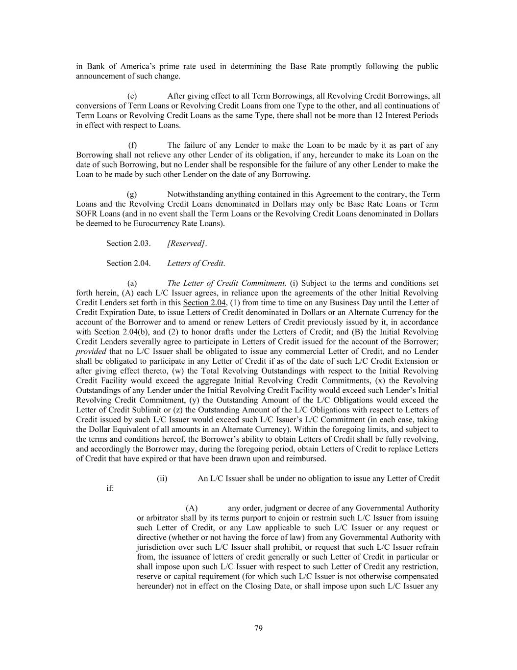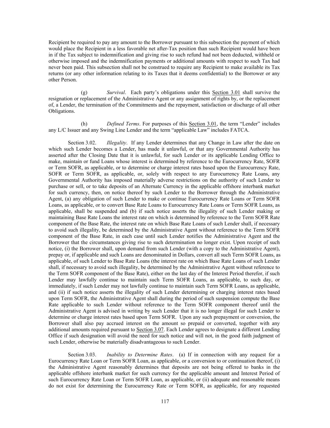 Recipient be required to pay any amount to the Borrower pursuant to this subsection the payment of which would place the Recipient in a less favorable net after-Tax position than such Recipient would have been in if the Tax subject to indemnification and giving rise to such refund had not been deducted, withheld or otherwise imposed and the indemnification payments or additional amounts with respect to such Tax had never been paid. This subsection shall not be construed to require any Recipient to make available its Tax returns (or any other information relating to its Taxes that it deems confidential) to the Borrower or any other Person. (g) Survival. Each party’s obligations under this Section 3.01 shall survive the resignation or replacement of the Administrative Agent or any assignment of rights by, or the replacement of, a Lender, the termination of the Commitments and the repayment, satisfaction or discharge of all other Obligations. (h) Defined Terms. For purposes of this Section 3.01, the term “Lender” includes any L/C Issuer and any Swing Line Lender and the term “applicable Law” includes FATCA. Section 3.02. Illegality. If any Lender determines that any Change in Law after the date on which such Lender becomes a Lender, has made it unlawful, or that any Governmental Authority has asserted after the Closing Date that it is unlawful, for such Lender or its applicable Lending Office to make, maintain or fund Loans whose interest is determined by reference to the Eurocurrency Rate, SOFR or Term SOFR, as applicable, or to determine or charge interest rates based upon the Eurocurrency Rate, SOFR or Term SOFR, as applicable, or, solely with respect to any Eurocurrency Rate Loans, any Governmental Authority has imposed materially adverse restrictions on the authority of such Lender to purchase or sell, or to take deposits of an Alternate Currency in the applicable offshore interbank market for such currency, then, on notice thereof by such Lender to the Borrower through the Administrative Agent, (a) any obligation of such Lender to make or continue Eurocurrency Rate Loans or Term SOFR Loans, as applicable, or to convert Base Rate Loans to Eurocurrency Rate Loans or Term SOFR Loans, as applicable, shall be suspended and (b) if such notice asserts the illegality of such Lender making or maintaining Base Rate Loans the interest rate on which is determined by reference to the Term SOFR Rate component of the Base Rate, the interest rate on which Base Rate Loans of such Lender shall, if necessary to avoid such illegality, be determined by the Administrative Agent without reference to the Term SOFR component of the Base Rate, in each case until such Lender notifies the Administrative Agent and the Borrower that the circumstances giving rise to such determination no longer exist. Upon receipt of such notice, (i) the Borrower shall, upon demand from such Lender (with a copy to the Administrative Agent), prepay or, if applicable and such Loans are denominated in Dollars, convert all such Term SOFR Loans, as applicable, of such Lender to Base Rate Loans (the interest rate on which Base Rate Loans of such Lender shall, if necessary to avoid such illegality, be determined by the Administrative Agent without reference to the Term SOFR component of the Base Rate), either on the last day of the Interest Period therefor, if such Lender may lawfully continue to maintain such Term SOFR Loans, as applicable, to such day, or immediately, if such Lender may not lawfully continue to maintain such Term SOFR Loans, as applicable, and (ii) if such notice asserts the illegality of such Lender determining or charging interest rates based upon Term SOFR, the Administrative Agent shall during the period of such suspension compute the Base Rate applicable to such Lender without reference to the Term SOFR component thereof until the Administrative Agent is advised in writing by such Lender that it is no longer illegal for such Lender to determine or charge interest rates based upon Term SOFR. Upon any such prepayment or conversion, the Borrower shall also pay accrued interest on the amount so prepaid or converted, together with any additional amounts required pursuant to Section 3.07. Each Lender agrees to designate a different Lending Office if such designation will avoid the need for such notice and will not, in the good faith judgment of such Lender, otherwise be materially disadvantageous to such Lender. Section 3.03. Inability to Determine Rates. (a) If in connection with any request for a Eurocurrency Rate Loan or Term SOFR Loan, as applicable, or a conversion to or continuation thereof, (i) the Administrative Agent reasonably determines that deposits are not being offered to banks in the applicable offshore interbank market for such currency for the applicable amount and Interest Period of such Eurocurrency Rate Loan or Term SOFR Loan, as applicable, or (ii) adequate and reasonable means do not exist for determining the Eurocurrency Rate or Term SOFR, as applicable, for any requested 117