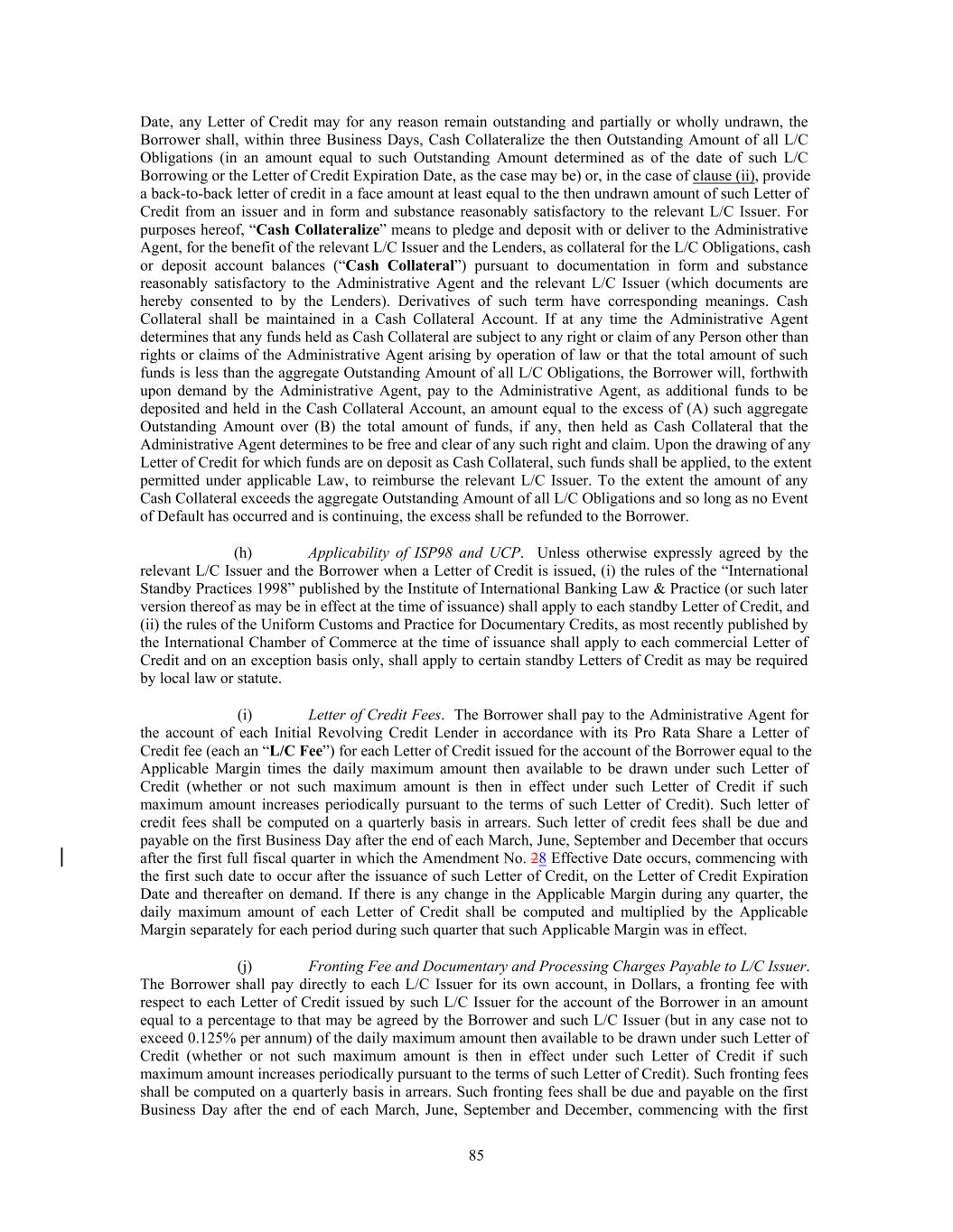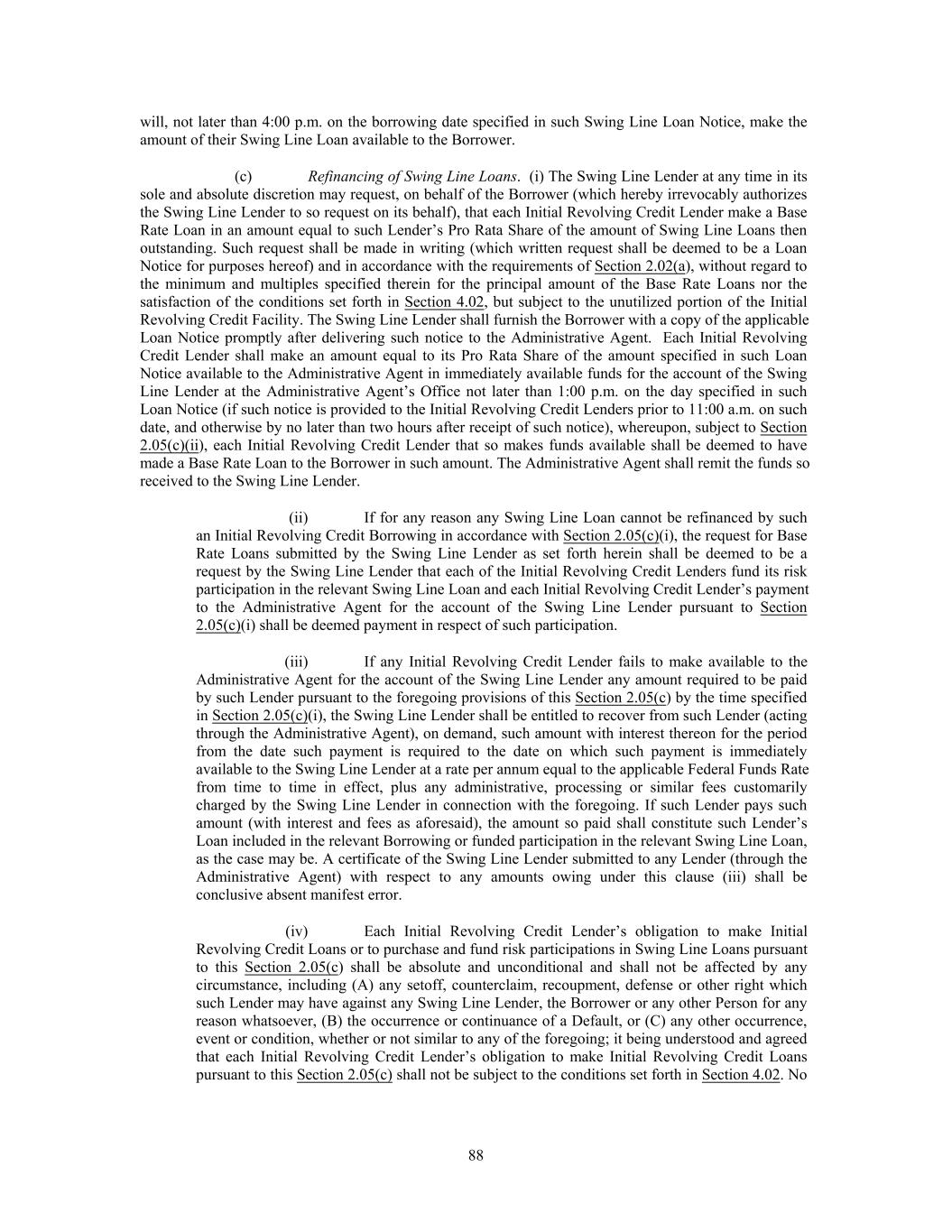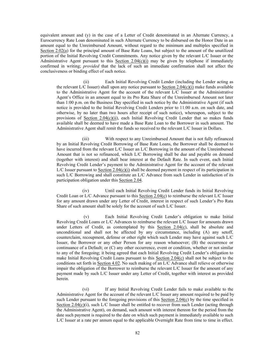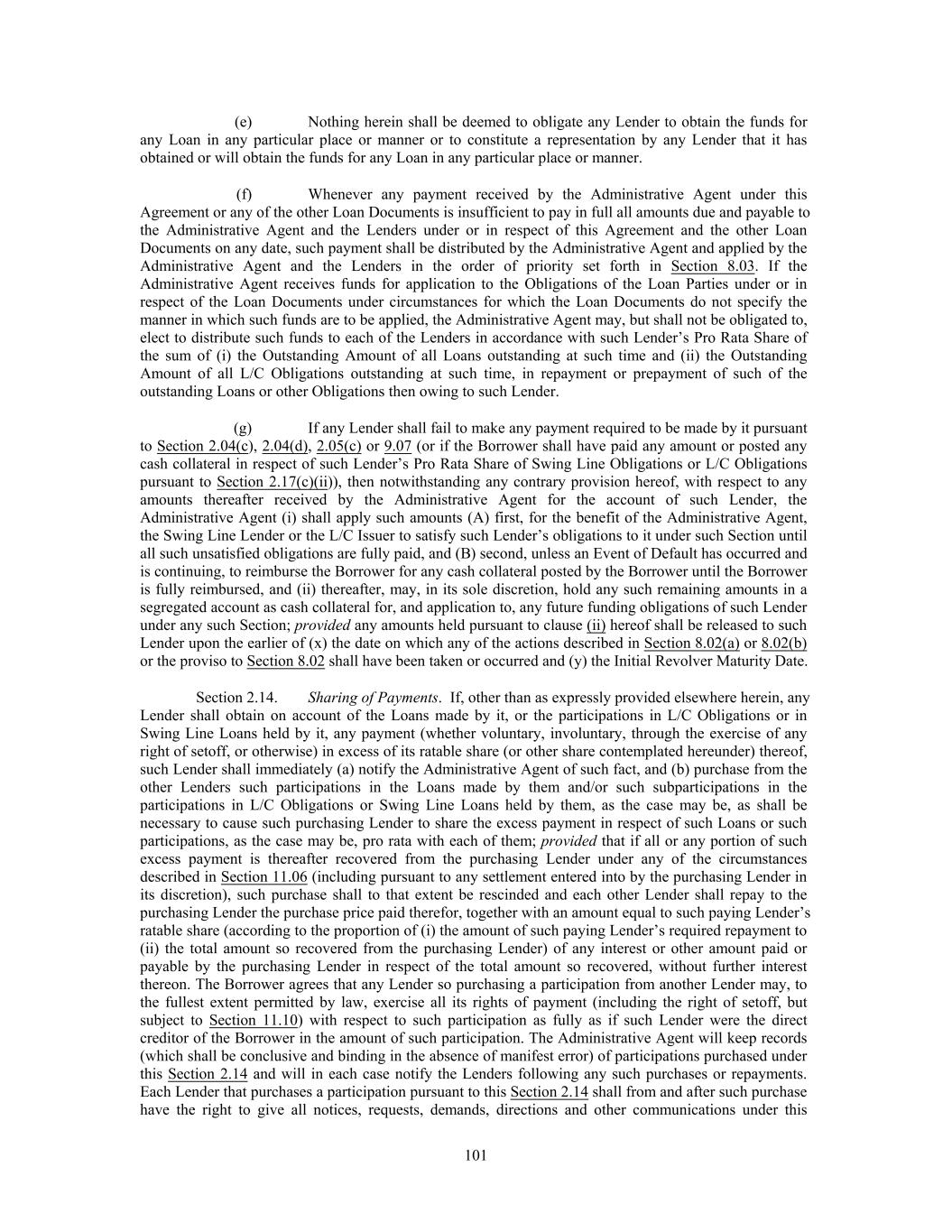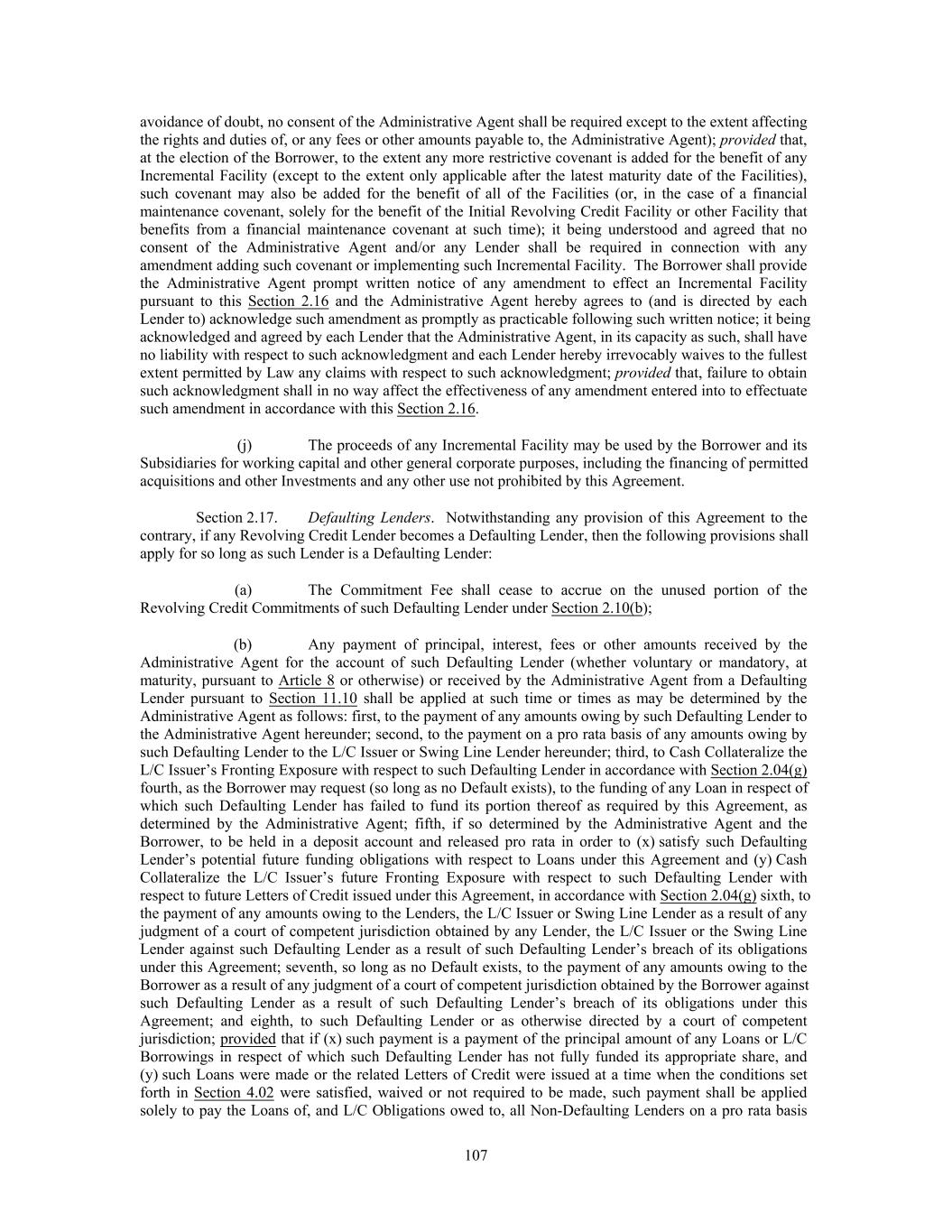 avoidance of doubt, no consent of the Administrative Agent shall be required except to the extent affecting the rights and duties of, or any fees or other amounts payable to, the Administrative Agent); provided that, at the election of the Borrower, to the extent any more restrictive covenant is added for the benefit of any Incremental Facility (except to the extent only applicable after the latest maturity date of the Facilities), such covenant may also be added for the benefit of all of the Facilities (or, in the case of a financial maintenance covenant, solely for the benefit of the Initial Revolving Credit Facility or other Facility that benefits from a financial maintenance covenant at such time); it being understood and agreed that no consent of the Administrative Agent and/or any Lender shall be required in connection with any amendment adding such covenant or implementing such Incremental Facility. The Borrower shall provide the Administrative Agent prompt written notice of any amendment to effect an Incremental Facility pursuant to this Section 2.16 and the Administrative Agent hereby agrees to (and is directed by each Lender to) acknowledge such amendment as promptly as practicable following such written notice; it being acknowledged and agreed by each Lender that the Administrative Agent, in its capacity as such, shall have no liability with respect to such acknowledgment and each Lender hereby irrevocably waives to the fullest extent permitted by Law any claims with respect to such acknowledgment; provided that, failure to obtain such acknowledgment shall in no way affect the effectiveness of any amendment entered into to effectuate such amendment in accordance with this Section 2.16. (j) The proceeds of any Incremental Facility may be used by the Borrower and its Subsidiaries for working capital and other general corporate purposes, including the financing of permitted acquisitions and other Investments and any other use not prohibited by this Agreement. Section 2.17. Defaulting Lenders. Notwithstanding any provision of this Agreement to the contrary, if any Revolving Credit Lender becomes a Defaulting Lender, then the following provisions shall apply for so long as such Lender is a Defaulting Lender: (a) The Commitment Fee shall cease to accrue on the unused portion of the Revolving Credit Commitments of such Defaulting Lender under Section 2.10(b); (b) Any payment of principal, interest, fees or other amounts received by the Administrative Agent for the account of such Defaulting Lender (whether voluntary or mandatory, at maturity, pursuant to Article 8 or otherwise) or received by the Administrative Agent from a Defaulting Lender pursuant to Section 11.10 shall be applied at such time or times as may be determined by the Administrative Agent as follows: first, to the payment of any amounts owing by such Defaulting Lender to the Administrative Agent hereunder; second, to the payment on a pro rata basis of any amounts owing by such Defaulting Lender to the L/C Issuer or Swing Line Lender hereunder; third, to Cash Collateralize the L/C Issuer’s Fronting Exposure with respect to such Defaulting Lender in accordance with Section 2.04(g) fourth, as the Borrower may request (so long as no Default exists), to the funding of any Loan in respect of which such Defaulting Lender has failed to fund its portion thereof as required by this Agreement, as determined by the Administrative Agent; fifth, if so determined by the Administrative Agent and the Borrower, to be held in a deposit account and released pro rata in order to (x) satisfy such Defaulting Lender’s potential future funding obligations with respect to Loans under this Agreement and (y) Cash Collateralize the L/C Issuer’s future Fronting Exposure with respect to such Defaulting Lender with respect to future Letters of Credit issued under this Agreement, in accordance with Section 2.04(g) sixth, to the payment of any amounts owing to the Lenders, the L/C Issuer or Swing Line Lender as a result of any judgment of a court of competent jurisdiction obtained by any Lender, the L/C Issuer or the Swing Line Lender against such Defaulting Lender as a result of such Defaulting Lender’s breach of its obligations under this Agreement; seventh, so long as no Default exists, to the payment of any amounts owing to the Borrower as a result of any judgment of a court of competent jurisdiction obtained by the Borrower against such Defaulting Lender as a result of such Defaulting Lender’s breach of its obligations under this Agreement; and eighth, to such Defaulting Lender or as otherwise directed by a court of competent jurisdiction; provided that if (x) such payment is a payment of the principal amount of any Loans or L/C Borrowings in respect of which such Defaulting Lender has not fully funded its appropriate share, and (y) such Loans were made or the related Letters of Credit were issued at a time when the conditions set forth in Section 4.02 were satisfied, waived or not required to be made, such payment shall be applied solely to pay the Loans of, and L/C Obligations owed to, all Non-Defaulting Lenders on a pro rata basis 107