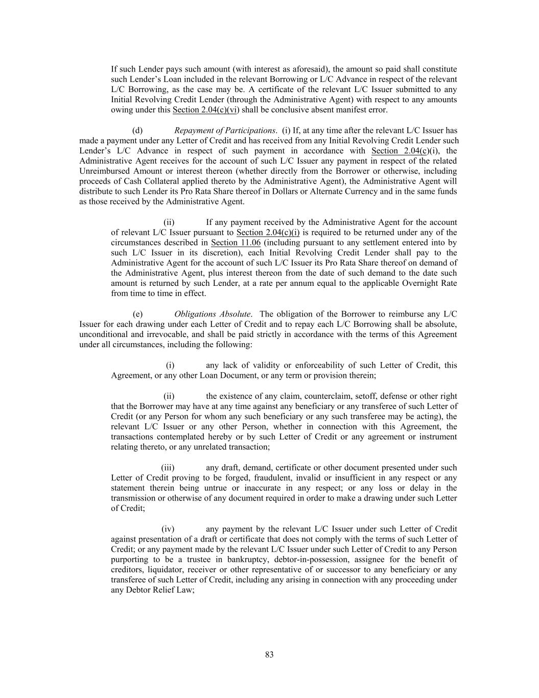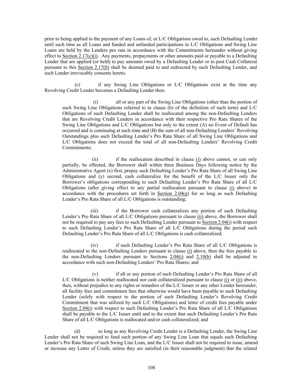 prior to being applied to the payment of any Loans of, or L/C Obligations owed to, such Defaulting Lender until such time as all Loans and funded and unfunded participations in L/C Obligations and Swing Line Loans are held by the Lenders pro rata in accordance with the Commitments hereunder without giving effect to Section 2.17(c)(i). Any payments, prepayments or other amounts paid or payable to a Defaulting Lender that are applied (or held) to pay amounts owed by a Defaulting Lender or to post Cash Collateral pursuant to this Section 2.17(b) shall be deemed paid to and redirected by such Defaulting Lender, and each Lender irrevocably consents hereto. (c) if any Swing Line Obligations or L/C Obligations exist at the time any Revolving Credit Lender becomes a Defaulting Lender then: (i) all or any part of the Swing Line Obligations (other than the portion of such Swing Line Obligations referred to in clause (b) of the definition of such term) and L/C Obligations of such Defaulting Lender shall be reallocated among the non-Defaulting Lenders that are Revolving Credit Lenders in accordance with their respective Pro Rata Shares of the Swing Line Obligations and L/C Obligations but only to the extent (A) no Event of Default has occurred and is continuing at such time and (B) the sum of all non-Defaulting Lenders’ Revolving Outstandings plus such Defaulting Lender’s Pro Rata Share of all Swing Line Obligations and L/C Obligations does not exceed the total of all non-Defaulting Lenders’ Revolving Credit Commitments; (ii) if the reallocation described in clause (i) above cannot, or can only partially, be effected, the Borrower shall within three Business Days following notice by the Administrative Agent (x) first, prepay such Defaulting Lender’s Pro Rata Share of all Swing Line Obligations and (y) second, cash collateralize for the benefit of the L/C Issuer only the Borrower’s obligations corresponding to such Defaulting Lender’s Pro Rata Share of all L/C Obligations (after giving effect to any partial reallocation pursuant to clause (i) above) in accordance with the procedures set forth in Section 2.04(g) for so long as such Defaulting Lender’s Pro Rata Share of all L/C Obligations is outstanding; (iii) if the Borrower cash collateralizes any portion of such Defaulting Lender’s Pro Rata Share of all L/C Obligations pursuant to clause (ii) above, the Borrower shall not be required to pay any fees to such Defaulting Lender pursuant to Section 2.04(i) with respect to such Defaulting Lender’s Pro Rata Share of all L/C Obligations during the period such Defaulting Lender’s Pro Rata Share of all L/C Obligations is cash collateralized; (iv) if such Defaulting Lender’s Pro Rata Share of all L/C Obligations is reallocated to the non-Defaulting Lenders pursuant to clause (i) above, then the fees payable to the non-Defaulting Lenders pursuant to Sections 2.04(i) and 2.10(b) shall be adjusted in accordance with such non-Defaulting Lenders’ Pro Rata Shares; and (v) if all or any portion of such Defaulting Lender’s Pro Rata Share of all L/C Obligations is neither reallocated nor cash collateralized pursuant to clause (i) or (ii) above, then, without prejudice to any rights or remedies of the L/C Issuer or any other Lender hereunder, all facility fees and commitment fees that otherwise would have been payable to such Defaulting Lender (solely with respect to the portion of such Defaulting Lender’s Revolving Credit Commitment that was utilized by such L/C Obligations) and letter of credit fees payable under Section 2.04(i) with respect to such Defaulting Lender’s Pro Rata Share of all L/C Obligations shall be payable to the L/C Issuer until and to the extent that such Defaulting Lender’s Pro Rata Share of all L/C Obligations is reallocated and/or cash collateralized; and (d) so long as any Revolving Credit Lender is a Defaulting Lender, the Swing Line Lender shall not be required to fund such portion of any Swing Line Loan that equals such Defaulting Lender’s Pro Rata Share of such Swing Line Loan, and the L/C Issuer shall not be required to issue, amend or increase any Letter of Credit, unless they are satisfied (in their reasonable judgment) that the related 108