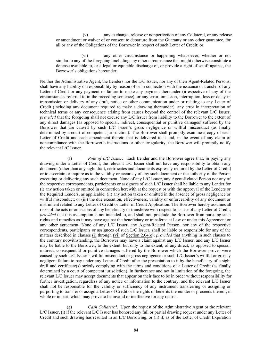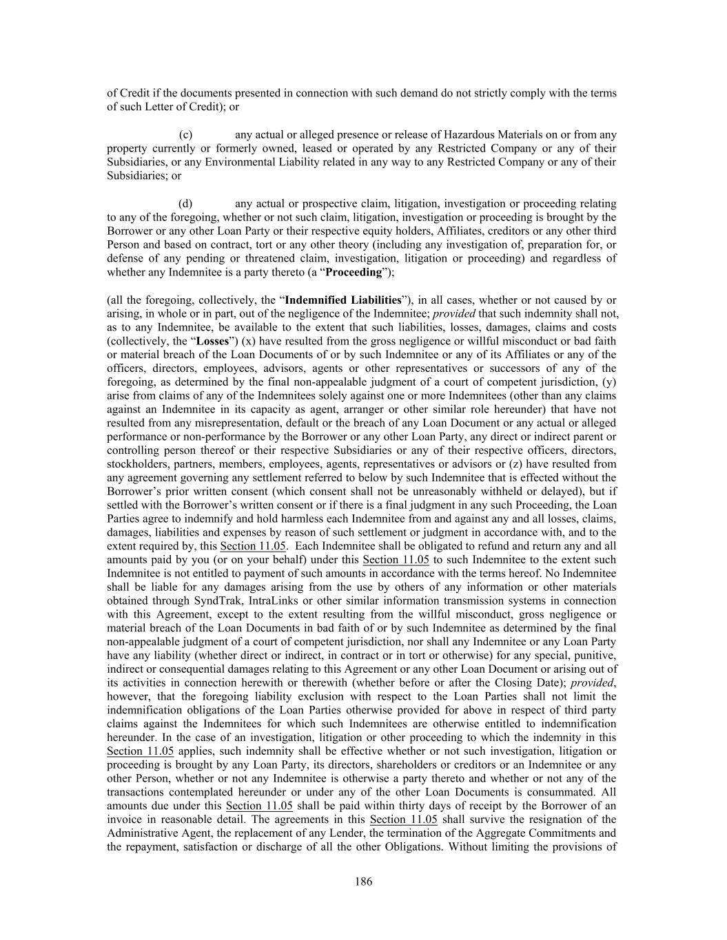 of Credit if the documents presented in connection with such demand do not strictly comply with the terms of such Letter of Credit); or (c) any actual or alleged presence or release of Hazardous Materials on or from any property currently or formerly owned, leased or operated by any Restricted Company or any of their Subsidiaries, or any Environmental Liability related in any way to any Restricted Company or any of their Subsidiaries; or (d) any actual or prospective claim, litigation, investigation or proceeding relating to any of the foregoing, whether or not such claim, litigation, investigation or proceeding is brought by the Borrower or any other Loan Party or their respective equity holders, Affiliates, creditors or any other third Person and based on contract, tort or any other theory (including any investigation of, preparation for, or defense of any pending or threatened claim, investigation, litigation or proceeding) and regardless of whether any Indemnitee is a party thereto (a “Proceeding”); (all the foregoing, collectively, the “Indemnified Liabilities”), in all cases, whether or not caused by or arising, in whole or in part, out of the negligence of the Indemnitee; provided that such indemnity shall not, as to any Indemnitee, be available to the extent that such liabilities, losses, damages, claims and costs (collectively, the “Losses”) (x) have resulted from the gross negligence or willful misconduct or bad faith or material breach of the Loan Documents of or by such Indemnitee or any of its Affiliates or any of the officers, directors, employees, advisors, agents or other representatives or successors of any of the foregoing, as determined by the final non-appealable judgment of a court of competent jurisdiction, (y) arise from claims of any of the Indemnitees solely against one or more Indemnitees (other than any claims against an Indemnitee in its capacity as agent, arranger or other similar role hereunder) that have not resulted from any misrepresentation, default or the breach of any Loan Document or any actual or alleged performance or non-performance by the Borrower or any other Loan Party, any direct or indirect parent or controlling person thereof or their respective Subsidiaries or any of their respective officers, directors, stockholders, partners, members, employees, agents, representatives or advisors or (z) have resulted from any agreement governing any settlement referred to below by such Indemnitee that is effected without the Borrower’s prior written consent (which consent shall not be unreasonably withheld or delayed), but if settled with the Borrower’s written consent or if there is a final judgment in any such Proceeding, the Loan Parties agree to indemnify and hold harmless each Indemnitee from and against any and all losses, claims, damages, liabilities and expenses by reason of such settlement or judgment in accordance with, and to the extent required by, this Section 11.05. Each Indemnitee shall be obligated to refund and return any and all amounts paid by you (or on your behalf) under this Section 11.05 to such Indemnitee to the extent such Indemnitee is not entitled to payment of such amounts in accordance with the terms hereof. No Indemnitee shall be liable for any damages arising from the use by others of any information or other materials obtained through SyndTrak, IntraLinks or other similar information transmission systems in connection with this Agreement, except to the extent resulting from the willful misconduct, gross negligence or material breach of the Loan Documents in bad faith of or by such Indemnitee as determined by the final non-appealable judgment of a court of competent jurisdiction, nor shall any Indemnitee or any Loan Party have any liability (whether direct or indirect, in contract or in tort or otherwise) for any special, punitive, indirect or consequential damages relating to this Agreement or any other Loan Document or arising out of its activities in connection herewith or therewith (whether before or after the Closing Date); provided, however, that the foregoing liability exclusion with respect to the Loan Parties shall not limit the indemnification obligations of the Loan Parties otherwise provided for above in respect of third party claims against the Indemnitees for which such Indemnitees are otherwise entitled to indemnification hereunder. In the case of an investigation, litigation or other proceeding to which the indemnity in this Section 11.05 applies, such indemnity shall be effective whether or not such investigation, litigation or proceeding is brought by any Loan Party, its directors, shareholders or creditors or an Indemnitee or any other Person, whether or not any Indemnitee is otherwise a party thereto and whether or not any of the transactions contemplated hereunder or under any of the other Loan Documents is consummated. All amounts due under this Section 11.05 shall be paid within thirty days of receipt by the Borrower of an invoice in reasonable detail. The agreements in this Section 11.05 shall survive the resignation of the Administrative Agent, the replacement of any Lender, the termination of the Aggregate Commitments and the repayment, satisfaction or discharge of all the other Obligations. Without limiting the provisions of 186