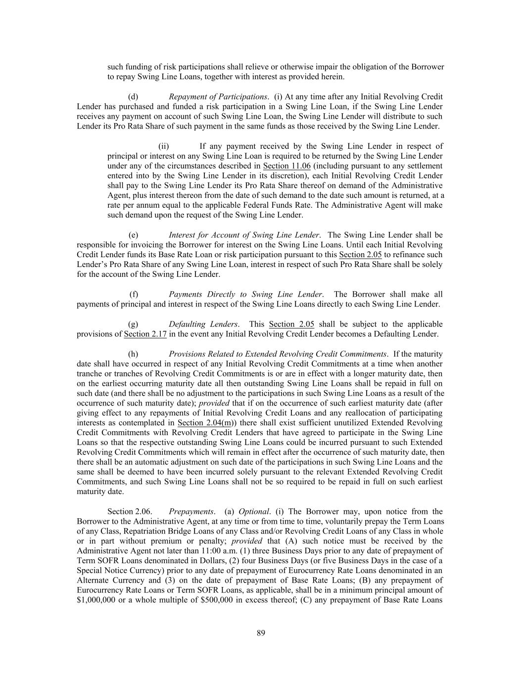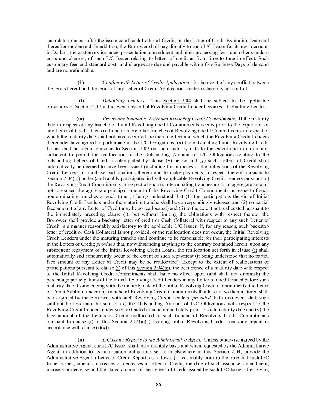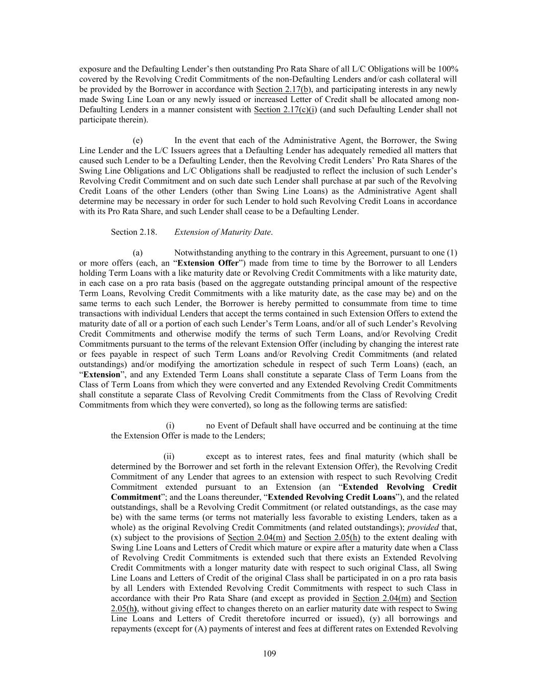 exposure and the Defaulting Lender’s then outstanding Pro Rata Share of all L/C Obligations will be 100% covered by the Revolving Credit Commitments of the non-Defaulting Lenders and/or cash collateral will be provided by the Borrower in accordance with Section 2.17(b), and participating interests in any newly made Swing Line Loan or any newly issued or increased Letter of Credit shall be allocated among non- Defaulting Lenders in a manner consistent with Section 2.17(c)(i) (and such Defaulting Lender shall not participate therein). (e) In the event that each of the Administrative Agent, the Borrower, the Swing Line Lender and the L/C Issuers agrees that a Defaulting Lender has adequately remedied all matters that caused such Lender to be a Defaulting Lender, then the Revolving Credit Lenders’ Pro Rata Shares of the Swing Line Obligations and L/C Obligations shall be readjusted to reflect the inclusion of such Lender’s Revolving Credit Commitment and on such date such Lender shall purchase at par such of the Revolving Credit Loans of the other Lenders (other than Swing Line Loans) as the Administrative Agent shall determine may be necessary in order for such Lender to hold such Revolving Credit Loans in accordance with its Pro Rata Share, and such Lender shall cease to be a Defaulting Lender. Section 2.18. Extension of Maturity Date. (a) Notwithstanding anything to the contrary in this Agreement, pursuant to one (1) or more offers (each, an “Extension Offer”) made from time to time by the Borrower to all Lenders holding Term Loans with a like maturity date or Revolving Credit Commitments with a like maturity date, in each case on a pro rata basis (based on the aggregate outstanding principal amount of the respective Term Loans, Revolving Credit Commitments with a like maturity date, as the case may be) and on the same terms to each such Lender, the Borrower is hereby permitted to consummate from time to time transactions with individual Lenders that accept the terms contained in such Extension Offers to extend the maturity date of all or a portion of each such Lender’s Term Loans, and/or all of such Lender’s Revolving Credit Commitments and otherwise modify the terms of such Term Loans, and/or Revolving Credit Commitments pursuant to the terms of the relevant Extension Offer (including by changing the interest rate or fees payable in respect of such Term Loans and/or Revolving Credit Commitments (and related outstandings) and/or modifying the amortization schedule in respect of such Term Loans) (each, an “Extension”, and any Extended Term Loans shall constitute a separate Class of Term Loans from the Class of Term Loans from which they were converted and any Extended Revolving Credit Commitments shall constitute a separate Class of Revolving Credit Commitments from the Class of Revolving Credit Commitments from which they were converted), so long as the following terms are satisfied: (i) no Event of Default shall have occurred and be continuing at the time the Extension Offer is made to the Lenders; (ii) except as to interest rates, fees and final maturity (which shall be determined by the Borrower and set forth in the relevant Extension Offer), the Revolving Credit Commitment of any Lender that agrees to an extension with respect to such Revolving Credit Commitment extended pursuant to an Extension (an “Extended Revolving Credit Commitment”; and the Loans thereunder, “Extended Revolving Credit Loans”), and the related outstandings, shall be a Revolving Credit Commitment (or related outstandings, as the case may be) with the same terms (or terms not materially less favorable to existing Lenders, taken as a whole) as the original Revolving Credit Commitments (and related outstandings); provided that, (x) subject to the provisions of Section 2.04(m) and Section 2.05(h) to the extent dealing with Swing Line Loans and Letters of Credit which mature or expire after a maturity date when a Class of Revolving Credit Commitments is extended such that there exists an Extended Revolving Credit Commitments with a longer maturity date with respect to such original Class, all Swing Line Loans and Letters of Credit of the original Class shall be participated in on a pro rata basis by all Lenders with Extended Revolving Credit Commitments with respect to such Class in accordance with their Pro Rata Share (and except as provided in Section 2.04(m) and Section 2.05(h), without giving effect to changes thereto on an earlier maturity date with respect to Swing Line Loans and Letters of Credit theretofore incurred or issued), (y) all borrowings and repayments (except for (A) payments of interest and fees at different rates on Extended Revolving 109