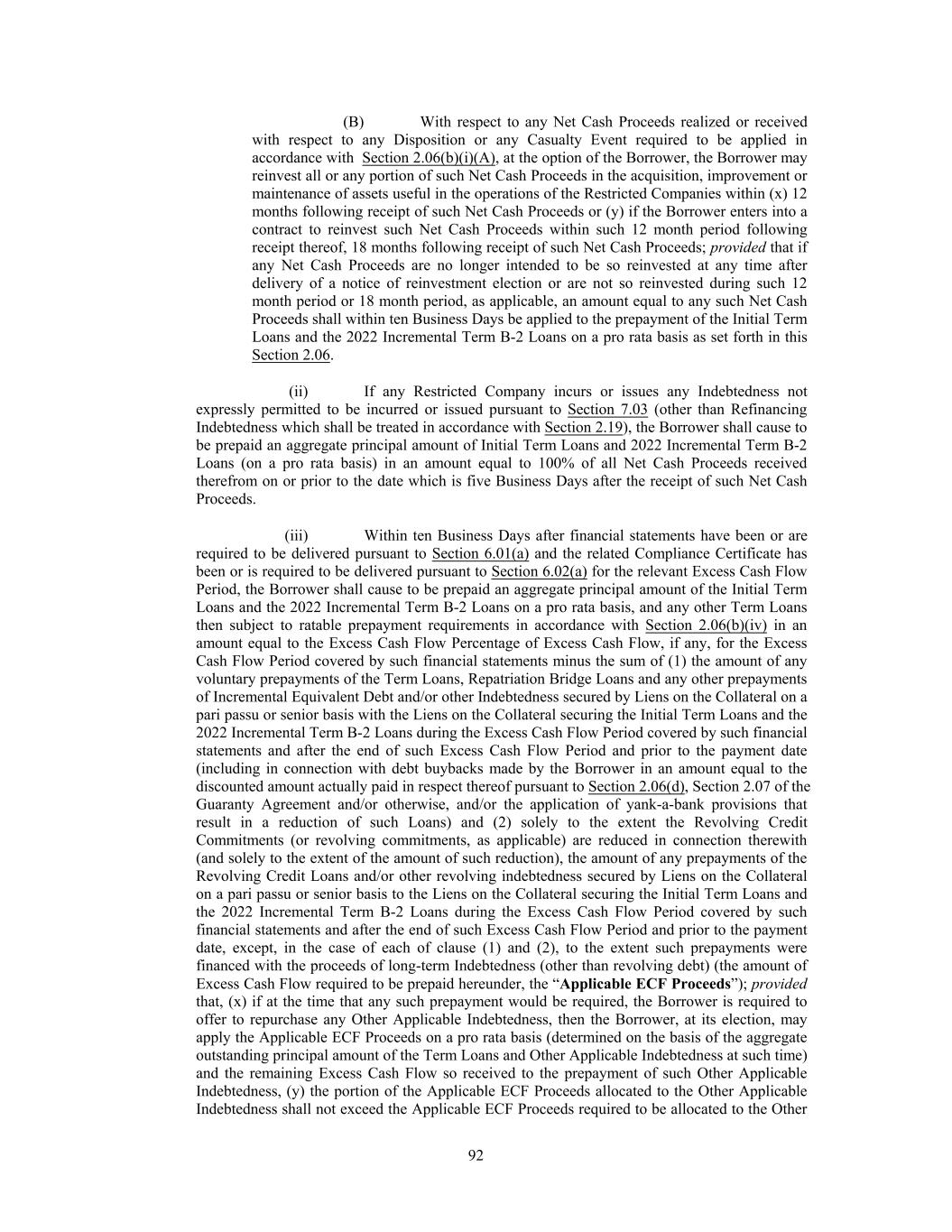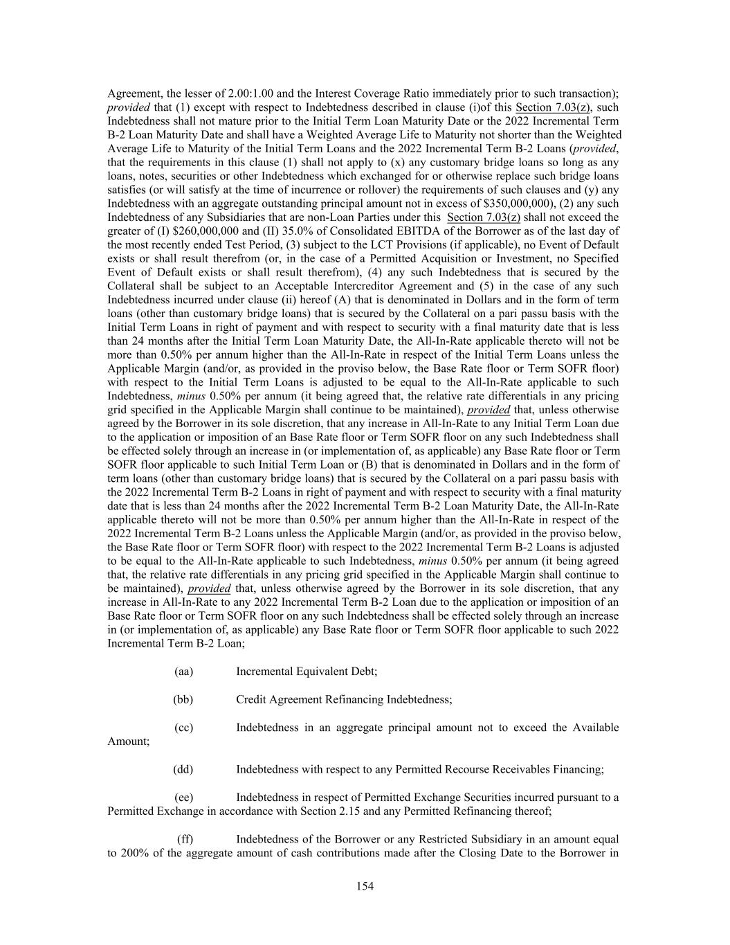 Agreement, the lesser of 2.00:1.00 and the Interest Coverage Ratio immediately prior to such transaction); provided that (1) except with respect to Indebtedness described in clause (i)of this Section 7.03(z), such Indebtedness shall not mature prior to the Initial Term Loan Maturity Date or the 2022 Incremental Term B-2 Loan Maturity Date and shall have a Weighted Average Life to Maturity not shorter than the Weighted Average Life to Maturity of the Initial Term Loans and the 2022 Incremental Term B-2 Loans (provided, that the requirements in this clause (1) shall not apply to (x) any customary bridge loans so long as any loans, notes, securities or other Indebtedness which exchanged for or otherwise replace such bridge loans satisfies (or will satisfy at the time of incurrence or rollover) the requirements of such clauses and (y) any Indebtedness with an aggregate outstanding principal amount not in excess of $350,000,000), (2) any such Indebtedness of any Subsidiaries that are non-Loan Parties under this Section 7.03(z) shall not exceed the greater of (I) $260,000,000 and (II) 35.0% of Consolidated EBITDA of the Borrower as of the last day of the most recently ended Test Period, (3) subject to the LCT Provisions (if applicable), no Event of Default exists or shall result therefrom (or, in the case of a Permitted Acquisition or Investment, no Specified Event of Default exists or shall result therefrom), (4) any such Indebtedness that is secured by the Collateral shall be subject to an Acceptable Intercreditor Agreement and (5) in the case of any such Indebtedness incurred under clause (ii) hereof (A) that is denominated in Dollars and in the form of term loans (other than customary bridge loans) that is secured by the Collateral on a pari passu basis with the Initial Term Loans in right of payment and with respect to security with a final maturity date that is less than 24 months after the Initial Term Loan Maturity Date, the All-In-Rate applicable thereto will not be more than 0.50% per annum higher than the All-In-Rate in respect of the Initial Term Loans unless the Applicable Margin (and/or, as provided in the proviso below, the Base Rate floor or Term SOFR floor) with respect to the Initial Term Loans is adjusted to be equal to the All-In-Rate applicable to such Indebtedness, minus 0.50% per annum (it being agreed that, the relative rate differentials in any pricing grid specified in the Applicable Margin shall continue to be maintained), provided that, unless otherwise agreed by the Borrower in its sole discretion, that any increase in All-In-Rate to any Initial Term Loan due to the application or imposition of an Base Rate floor or Term SOFR floor on any such Indebtedness shall be effected solely through an increase in (or implementation of, as applicable) any Base Rate floor or Term SOFR floor applicable to such Initial Term Loan or (B) that is denominated in Dollars and in the form of term loans (other than customary bridge loans) that is secured by the Collateral on a pari passu basis with the 2022 Incremental Term B-2 Loans in right of payment and with respect to security with a final maturity date that is less than 24 months after the 2022 Incremental Term B-2 Loan Maturity Date, the All-In-Rate applicable thereto will not be more than 0.50% per annum higher than the All-In-Rate in respect of the 2022 Incremental Term B-2 Loans unless the Applicable Margin (and/or, as provided in the proviso below, the Base Rate floor or Term SOFR floor) with respect to the 2022 Incremental Term B-2 Loans is adjusted to be equal to the All-In-Rate applicable to such Indebtedness, minus 0.50% per annum (it being agreed that, the relative rate differentials in any pricing grid specified in the Applicable Margin shall continue to be maintained), provided that, unless otherwise agreed by the Borrower in its sole discretion, that any increase in All-In-Rate to any 2022 Incremental Term B-2 Loan due to the application or imposition of an Base Rate floor or Term SOFR floor on any such Indebtedness shall be effected solely through an increase in (or implementation of, as applicable) any Base Rate floor or Term SOFR floor applicable to such 2022 Incremental Term B-2 Loan; (aa) Incremental Equivalent Debt; (bb) Credit Agreement Refinancing Indebtedness; (cc) Indebtedness in an aggregate principal amount not to exceed the Available Amount; (dd) Indebtedness with respect to any Permitted Recourse Receivables Financing; (ee) Indebtedness in respect of Permitted Exchange Securities incurred pursuant to a Permitted Exchange in accordance with Section 2.15 and any Permitted Refinancing thereof; (ff) Indebtedness of the Borrower or any Restricted Subsidiary in an amount equal to 200% of the aggregate amount of cash contributions made after the Closing Date to the Borrower in 154