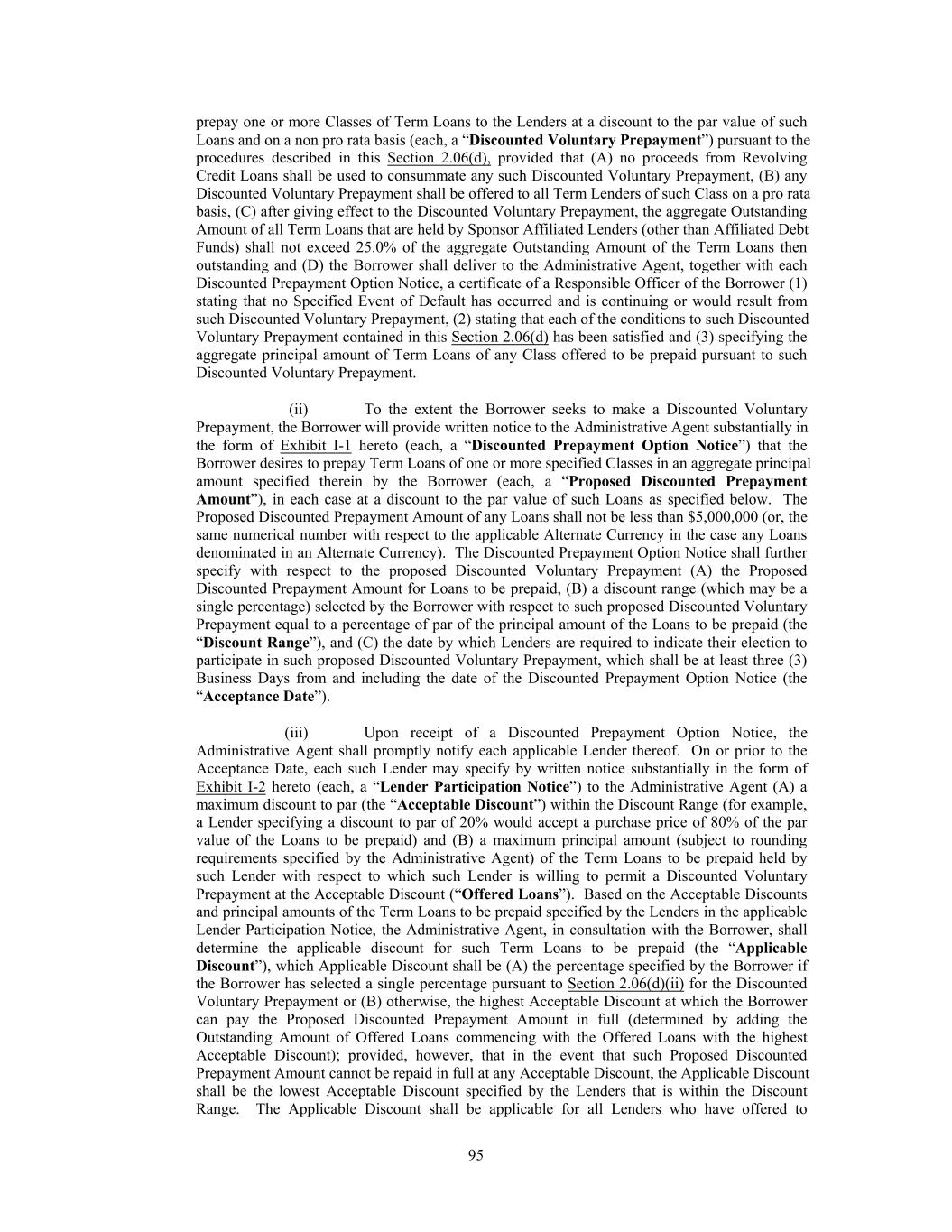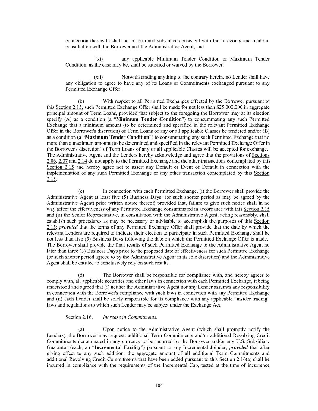 connection therewith shall be in form and substance consistent with the foregoing and made in consultation with the Borrower and the Administrative Agent; and (xi) any applicable Minimum Tender Condition or Maximum Tender Condition, as the case may be, shall be satisfied or waived by the Borrower. (xii) Notwithstanding anything to the contrary herein, no Lender shall have any obligation to agree to have any of its Loans or Commitments exchanged pursuant to any Permitted Exchange Offer. (b) With respect to all Permitted Exchanges effected by the Borrower pursuant to this Section 2.15, such Permitted Exchange Offer shall be made for not less than $25,000,000 in aggregate principal amount of Term Loans, provided that subject to the foregoing the Borrower may at its election specify (A) as a condition (a “Minimum Tender Condition”) to consummating any such Permitted Exchange that a minimum amount (to be determined and specified in the relevant Permitted Exchange Offer in the Borrower's discretion) of Term Loans of any or all applicable Classes be tendered and/or (B) as a condition (a “Maximum Tender Condition”) to consummating any such Permitted Exchange that no more than a maximum amount (to be determined and specified in the relevant Permitted Exchange Offer in the Borrower's discretion) of Term Loans of any or all applicable Classes will be accepted for exchange. The Administrative Agent and the Lenders hereby acknowledge and agree that the provisions of Sections 2.06, 2.07 and 2.14 do not apply to the Permitted Exchange and the other transactions contemplated by this Section 2.15 and hereby agree not to assert any Default or Event of Default in connection with the implementation of any such Permitted Exchange or any other transaction contemplated by this Section 2.15. (c) In connection with each Permitted Exchange, (i) the Borrower shall provide the Administrative Agent at least five (5) Business Days’ (or such shorter period as may be agreed by the Administrative Agent) prior written notice thereof; provided that, failure to give such notice shall in no way affect the effectiveness of any Permitted Exchange consummated in accordance with this Section 2.15 and (ii) the Senior Representative, in consultation with the Administrative Agent, acting reasonably, shall establish such procedures as may be necessary or advisable to accomplish the purposes of this Section 2.15; provided that the terms of any Permitted Exchange Offer shall provide that the date by which the relevant Lenders are required to indicate their election to participate in such Permitted Exchange shall be not less than five (5) Business Days following the date on which the Permitted Exchange Offer is made. The Borrower shall provide the final results of such Permitted Exchange to the Administrative Agent no later than three (3) Business Days prior to the proposed date of effectiveness for such Permitted Exchange (or such shorter period agreed to by the Administrative Agent in its sole discretion) and the Administrative Agent shall be entitled to conclusively rely on such results. (d) The Borrower shall be responsible for compliance with, and hereby agrees to comply with, all applicable securities and other laws in connection with each Permitted Exchange, it being understood and agreed that (i) neither the Administrative Agent nor any Lender assumes any responsibility in connection with the Borrower's compliance with such laws in connection with any Permitted Exchange and (ii) each Lender shall be solely responsible for its compliance with any applicable “insider trading” laws and regulations to which such Lender may be subject under the Exchange Act. Section 2.16. Increase in Commitments. (a) Upon notice to the Administrative Agent (which shall promptly notify the Lenders), the Borrower may request: additional Term Commitments and/or additional Revolving Credit Commitments denominated in any currency to be incurred by the Borrower and/or any U.S. Subsidiary Guarantor (each, an “Incremental Facility”) pursuant to any Incremental Joinder; provided that after giving effect to any such addition, the aggregate amount of all additional Term Commitments and additional Revolving Credit Commitments that have been added pursuant to this Section 2.16(a) shall be incurred in compliance with the requirements of the Incremental Cap, tested at the time of incurrence 104