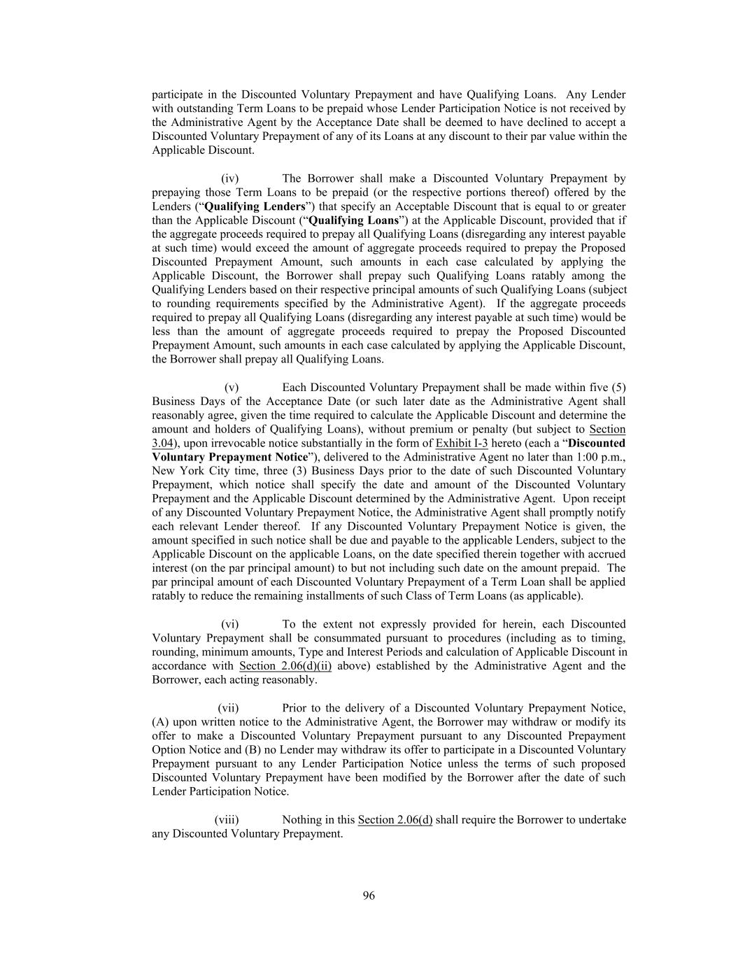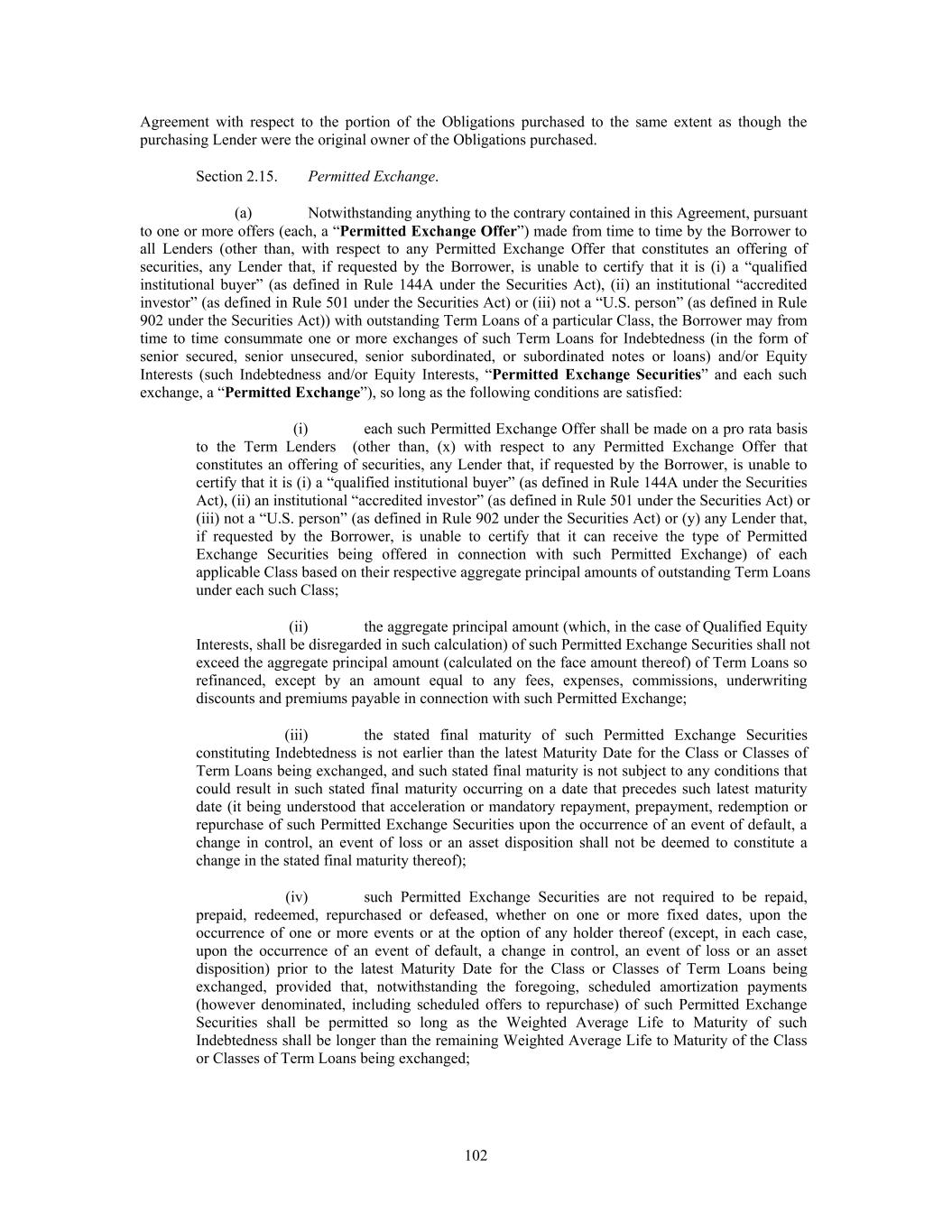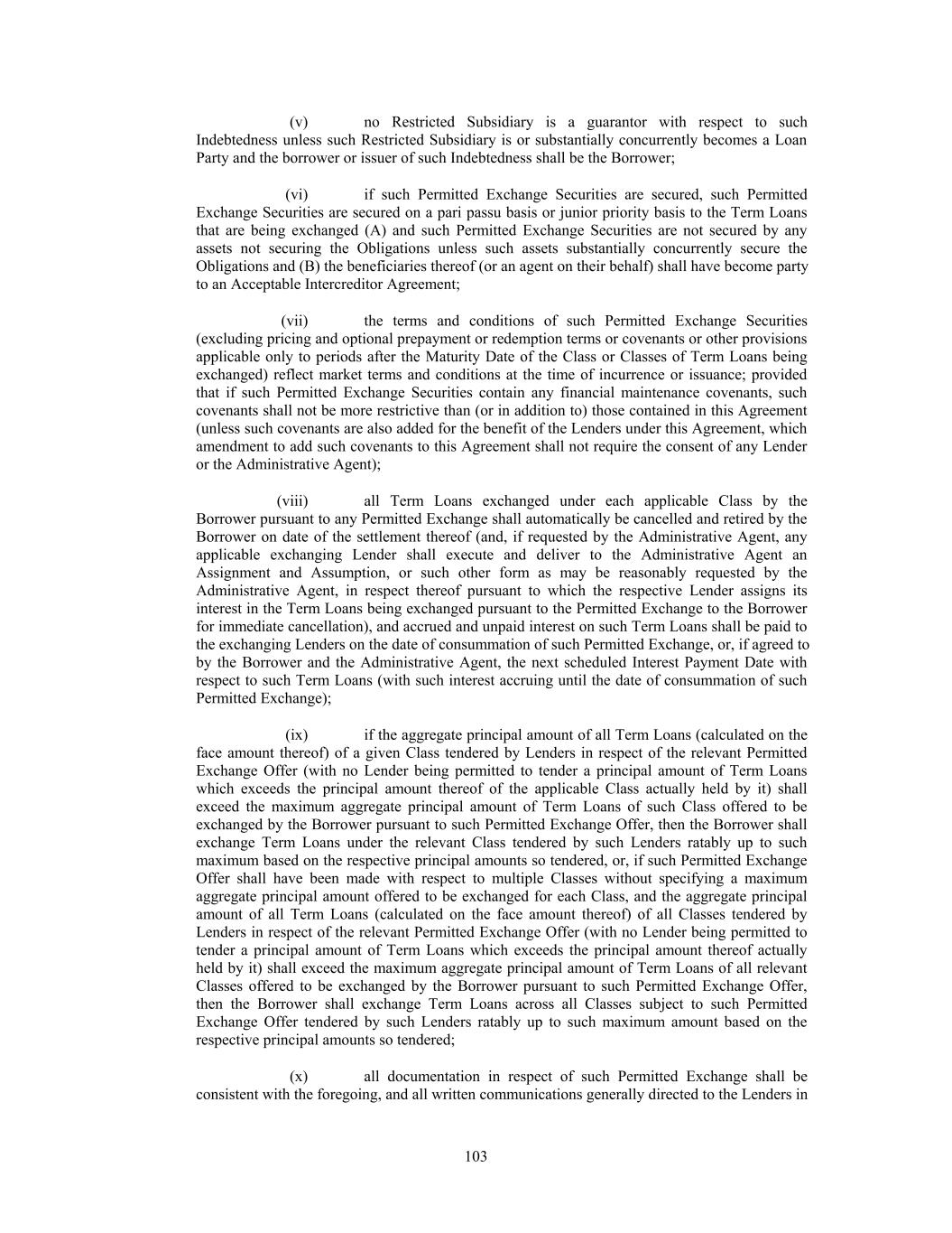 (v) no Restricted Subsidiary is a guarantor with respect to such Indebtedness unless such Restricted Subsidiary is or substantially concurrently becomes a Loan Party and the borrower or issuer of such Indebtedness shall be the Borrower; (vi) if such Permitted Exchange Securities are secured, such Permitted Exchange Securities are secured on a pari passu basis or junior priority basis to the Term Loans that are being exchanged (A) and such Permitted Exchange Securities are not secured by any assets not securing the Obligations unless such assets substantially concurrently secure the Obligations and (B) the beneficiaries thereof (or an agent on their behalf) shall have become party to an Acceptable Intercreditor Agreement; (vii) the terms and conditions of such Permitted Exchange Securities (excluding pricing and optional prepayment or redemption terms or covenants or other provisions applicable only to periods after the Maturity Date of the Class or Classes of Term Loans being exchanged) reflect market terms and conditions at the time of incurrence or issuance; provided that if such Permitted Exchange Securities contain any financial maintenance covenants, such covenants shall not be more restrictive than (or in addition to) those contained in this Agreement (unless such covenants are also added for the benefit of the Lenders under this Agreement, which amendment to add such covenants to this Agreement shall not require the consent of any Lender or the Administrative Agent); (viii) all Term Loans exchanged under each applicable Class by the Borrower pursuant to any Permitted Exchange shall automatically be cancelled and retired by the Borrower on date of the settlement thereof (and, if requested by the Administrative Agent, any applicable exchanging Lender shall execute and deliver to the Administrative Agent an Assignment and Assumption, or such other form as may be reasonably requested by the Administrative Agent, in respect thereof pursuant to which the respective Lender assigns its interest in the Term Loans being exchanged pursuant to the Permitted Exchange to the Borrower for immediate cancellation), and accrued and unpaid interest on such Term Loans shall be paid to the exchanging Lenders on the date of consummation of such Permitted Exchange, or, if agreed to by the Borrower and the Administrative Agent, the next scheduled Interest Payment Date with respect to such Term Loans (with such interest accruing until the date of consummation of such Permitted Exchange); (ix) if the aggregate principal amount of all Term Loans (calculated on the face amount thereof) of a given Class tendered by Lenders in respect of the relevant Permitted Exchange Offer (with no Lender being permitted to tender a principal amount of Term Loans which exceeds the principal amount thereof of the applicable Class actually held by it) shall exceed the maximum aggregate principal amount of Term Loans of such Class offered to be exchanged by the Borrower pursuant to such Permitted Exchange Offer, then the Borrower shall exchange Term Loans under the relevant Class tendered by such Lenders ratably up to such maximum based on the respective principal amounts so tendered, or, if such Permitted Exchange Offer shall have been made with respect to multiple Classes without specifying a maximum aggregate principal amount offered to be exchanged for each Class, and the aggregate principal amount of all Term Loans (calculated on the face amount thereof) of all Classes tendered by Lenders in respect of the relevant Permitted Exchange Offer (with no Lender being permitted to tender a principal amount of Term Loans which exceeds the principal amount thereof actually held by it) shall exceed the maximum aggregate principal amount of Term Loans of all relevant Classes offered to be exchanged by the Borrower pursuant to such Permitted Exchange Offer, then the Borrower shall exchange Term Loans across all Classes subject to such Permitted Exchange Offer tendered by such Lenders ratably up to such maximum amount based on the respective principal amounts so tendered; (x) all documentation in respect of such Permitted Exchange shall be consistent with the foregoing, and all written communications generally directed to the Lenders in 103