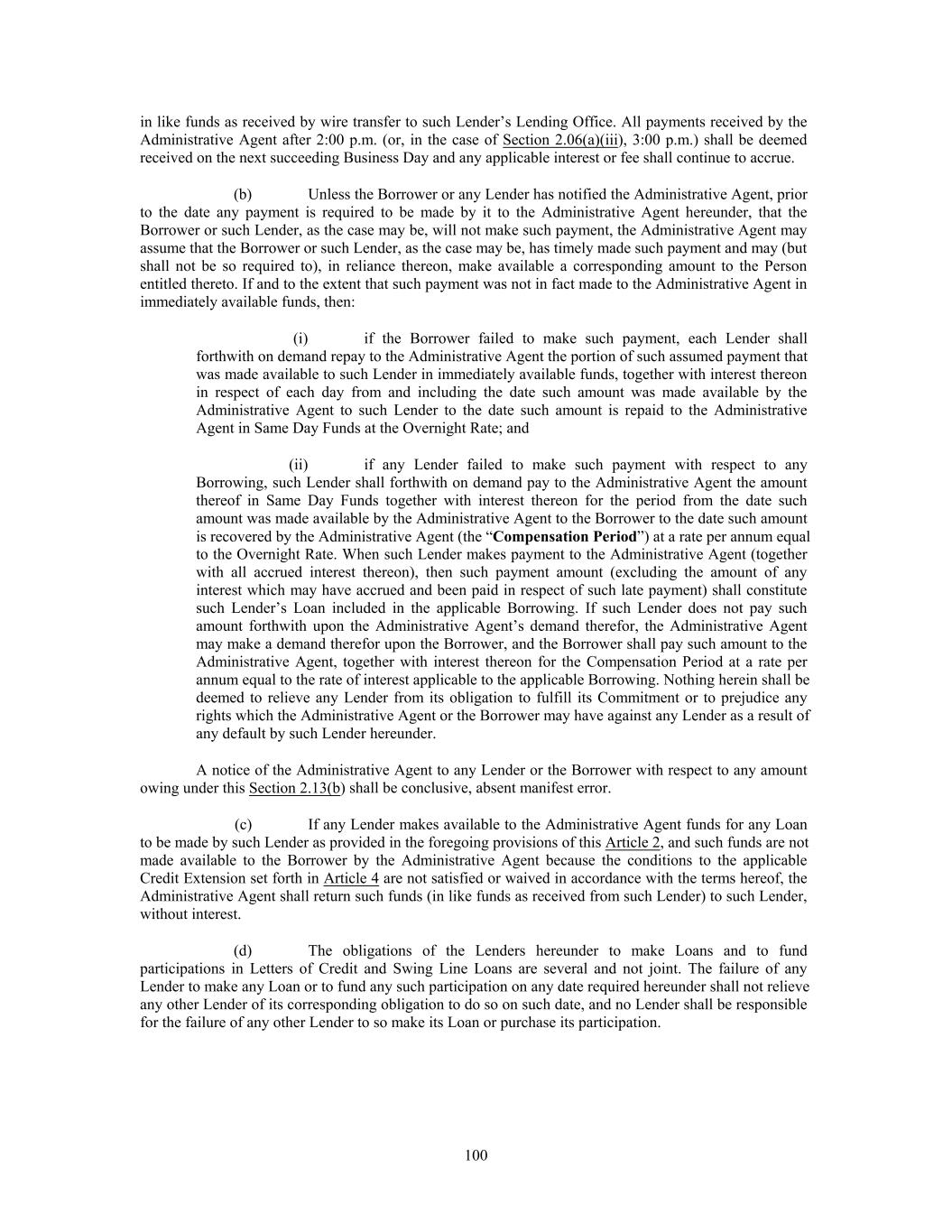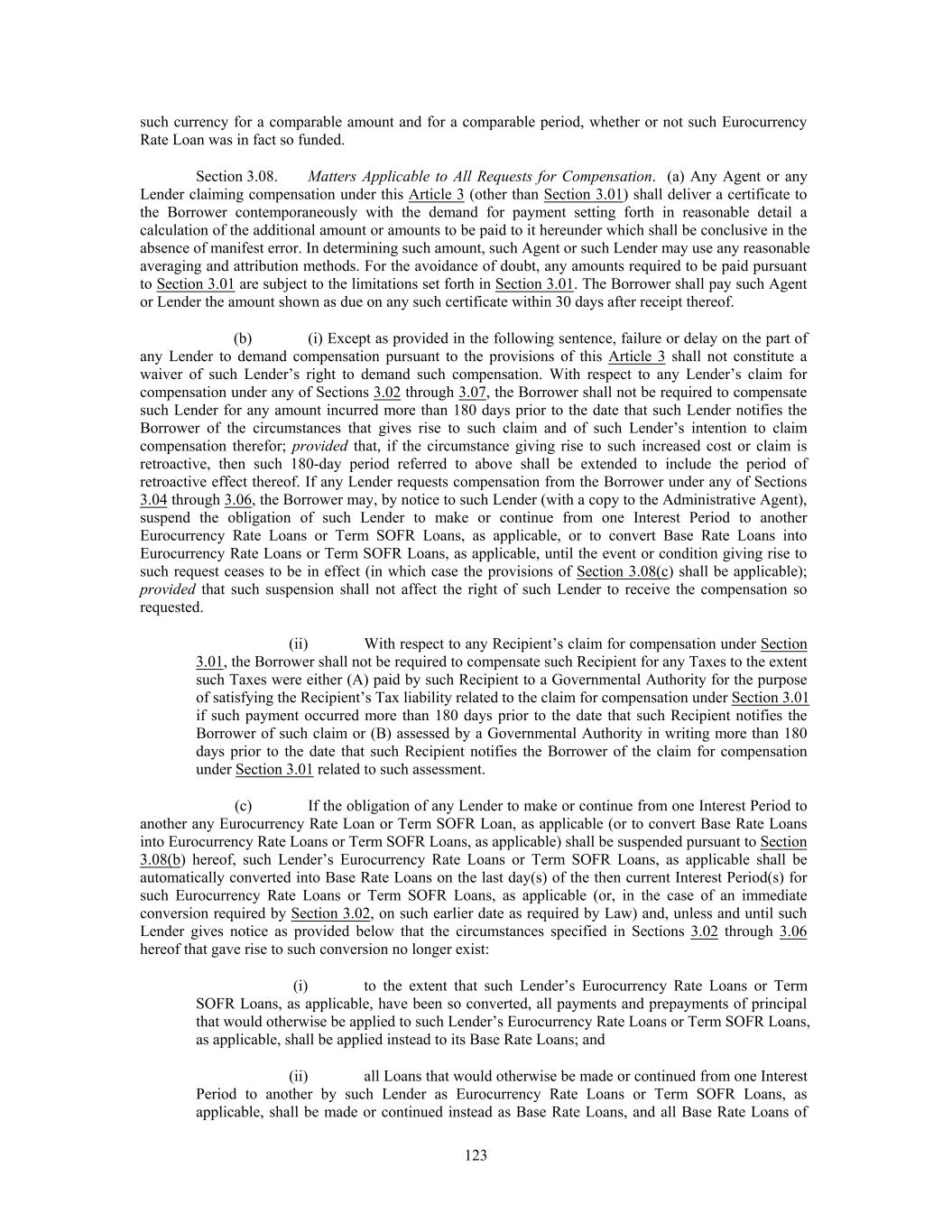 such currency for a comparable amount and for a comparable period, whether or not such Eurocurrency Rate Loan was in fact so funded. Section 3.08. Matters Applicable to All Requests for Compensation. (a) Any Agent or any Lender claiming compensation under this Article 3 (other than Section 3.01) shall deliver a certificate to the Borrower contemporaneously with the demand for payment setting forth in reasonable detail a calculation of the additional amount or amounts to be paid to it hereunder which shall be conclusive in the absence of manifest error. In determining such amount, such Agent or such Lender may use any reasonable averaging and attribution methods. For the avoidance of doubt, any amounts required to be paid pursuant to Section 3.01 are subject to the limitations set forth in Section 3.01. The Borrower shall pay such Agent or Lender the amount shown as due on any such certificate within 30 days after receipt thereof. (b) (i) Except as provided in the following sentence, failure or delay on the part of any Lender to demand compensation pursuant to the provisions of this Article 3 shall not constitute a waiver of such Lender’s right to demand such compensation. With respect to any Lender’s claim for compensation under any of Sections 3.02 through 3.07, the Borrower shall not be required to compensate such Lender for any amount incurred more than 180 days prior to the date that such Lender notifies the Borrower of the circumstances that gives rise to such claim and of such Lender’s intention to claim compensation therefor; provided that, if the circumstance giving rise to such increased cost or claim is retroactive, then such 180-day period referred to above shall be extended to include the period of retroactive effect thereof. If any Lender requests compensation from the Borrower under any of Sections 3.04 through 3.06, the Borrower may, by notice to such Lender (with a copy to the Administrative Agent), suspend the obligation of such Lender to make or continue from one Interest Period to another Eurocurrency Rate Loans or Term SOFR Loans, as applicable, or to convert Base Rate Loans into Eurocurrency Rate Loans or Term SOFR Loans, as applicable, until the event or condition giving rise to such request ceases to be in effect (in which case the provisions of Section 3.08(c) shall be applicable); provided that such suspension shall not affect the right of such Lender to receive the compensation so requested. (ii) With respect to any Recipient’s claim for compensation under Section 3.01, the Borrower shall not be required to compensate such Recipient for any Taxes to the extent such Taxes were either (A) paid by such Recipient to a Governmental Authority for the purpose of satisfying the Recipient’s Tax liability related to the claim for compensation under Section 3.01 if such payment occurred more than 180 days prior to the date that such Recipient notifies the Borrower of such claim or (B) assessed by a Governmental Authority in writing more than 180 days prior to the date that such Recipient notifies the Borrower of the claim for compensation under Section 3.01 related to such assessment. (c) If the obligation of any Lender to make or continue from one Interest Period to another any Eurocurrency Rate Loan or Term SOFR Loan, as applicable (or to convert Base Rate Loans into Eurocurrency Rate Loans or Term SOFR Loans, as applicable) shall be suspended pursuant to Section 3.08(b) hereof, such Lender’s Eurocurrency Rate Loans or Term SOFR Loans, as applicable shall be automatically converted into Base Rate Loans on the last day(s) of the then current Interest Period(s) for such Eurocurrency Rate Loans or Term SOFR Loans, as applicable (or, in the case of an immediate conversion required by Section 3.02, on such earlier date as required by Law) and, unless and until such Lender gives notice as provided below that the circumstances specified in Sections 3.02 through 3.06 hereof that gave rise to such conversion no longer exist: (i) to the extent that such Lender’s Eurocurrency Rate Loans or Term SOFR Loans, as applicable, have been so converted, all payments and prepayments of principal that would otherwise be applied to such Lender’s Eurocurrency Rate Loans or Term SOFR Loans, as applicable, shall be applied instead to its Base Rate Loans; and (ii) all Loans that would otherwise be made or continued from one Interest Period to another by such Lender as Eurocurrency Rate Loans or Term SOFR Loans, as applicable, shall be made or continued instead as Base Rate Loans, and all Base Rate Loans of 123