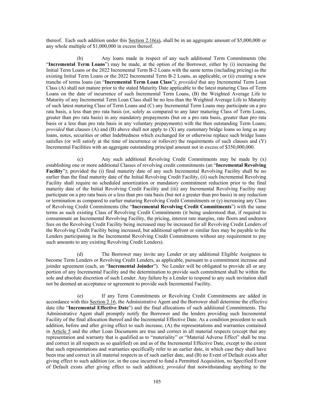 thereof. Each such addition under this Section 2.16(a). shall be in an aggregate amount of $5,000,000 or any whole multiple of $1,000,000 in excess thereof. (b) Any loans made in respect of any such additional Term Commitments (the “Incremental Term Loans”) may be made, at the option of the Borrower, either by (i) increasing the Initial Term Loans or the 2022 Incremental Term B-2 Loans with the same terms (including pricing) as the existing Initial Term Loans or the 2022 Incremental Term B-2 Loans, as applicable, or (ii) creating a new tranche of terms loans (an “Incremental Term Loan Class”); provided that any Incremental Term Loan Class (A) shall not mature prior to the stated Maturity Date applicable to the latest maturing Class of Term Loans on the date of incurrence of such Incremental Term Loans, (B) the Weighted Average Life to Maturity of any Incremental Term Loan Class shall be no less than the Weighted Average Life to Maturity of such latest maturing Class of Term Loans and (C) any Incremental Term Loans may participate on a pro rata basis, a less than pro rata basis (or, solely as compared to any later maturing Class of Term Loans, greater than pro rata basis) in any mandatory prepayments (but on a pro rata basis, greater than pro rata basis or a less than pro rata basis in any voluntary prepayments) with the then outstanding Term Loans; provided that clauses (A) and (B) above shall not apply to (X) any customary bridge loans so long as any loans, notes, securities or other Indebtedness which exchanged for or otherwise replace such bridge loans satisfies (or will satisfy at the time of incurrence or rollover) the requirements of such clauses and (Y) Incremental Facilities with an aggregate outstanding principal amount not in excess of $350,000,000. (c) Any such additional Revolving Credit Commitments may be made by (x) establishing one or more additional Classes of revolving credit commitments (an “Incremental Revolving Facility”); provided the (i) final maturity date of any such Incremental Revolving Facility shall be no earlier than the final maturity date of the Initial Revolving Credit Facility, (ii) such Incremental Revolving Facility shall require no scheduled amortization or mandatory commitment reduction prior to the final maturity date of the Initial Revolving Credit Facility and (iii) any Incremental Revolving Facility may participate on a pro rata basis or a less than pro rata basis (but not a greater than pro basis) in any reduction or termination as compared to earlier maturing Revolving Credit Commitments or (y) increasing any Class of Revolving Credit Commitments (the “Incremental Revolving Credit Commitments”) with the same terms as such existing Class of Revolving Credit Commitments (it being understood that, if required to consummate an Incremental Revolving Facility, the pricing, interest rate margins, rate floors and undrawn fees on the Revolving Credit Facility being increased may be increased for all Revolving Credit Lenders of the Revolving Credit Facility being increased, but additional upfront or similar fees may be payable to the Lenders participating in the Incremental Revolving Credit Commitments without any requirement to pay such amounts to any existing Revolving Credit Lenders). (d) The Borrower may invite any Lender or any additional Eligible Assignees to become Term Lenders or Revolving Credit Lenders, as applicable, pursuant to a commitment increase and joinder agreement (each, an “Incremental Joinder”). No Lender will be obligated to provide all or any portion of any Incremental Facility and the determination to provide such commitment shall be within the sole and absolute discretion of such Lender. Any failure by a Lender to respond to any such invitation shall not be deemed an acceptance or agreement to provide such Incremental Facility. (e) If any Term Commitments or Revolving Credit Commitments are added in accordance with this Section 2.16, the Administrative Agent and the Borrower shall determine the effective date (the “Incremental Effective Date”) and the final allocations of such additional Commitments. The Administrative Agent shall promptly notify the Borrower and the lenders providing such Incremental Facility of the final allocation thereof and the Incremental Effective Date. As a condition precedent to such addition, before and after giving effect to such increase, (A) the representations and warranties contained in Article 5 and the other Loan Documents are true and correct in all material respects (except that any representation and warranty that is qualified as to “materiality” or “Material Adverse Effect” shall be true and correct in all respects as so qualified) on and as of the Incremental Effective Date, except to the extent that such representations and warranties specifically refer to an earlier date, in which case they shall have been true and correct in all material respects as of such earlier date, and (B) no Event of Default exists after giving effect to such addition (or, in the case incurred to fund a Permitted Acquisition, no Specified Event of Default exists after giving effect to such addition); provided that notwithstanding anything to the 105