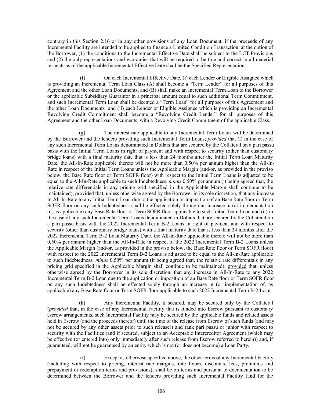 contrary in this Section 2.16 or in any other provisions of any Loan Document, if the proceeds of any Incremental Facility are intended to be applied to finance a Limited Condition Transaction, at the option of the Borrower, (1) the conditions to the Incremental Effective Date shall be subject to the LCT Provisions and (2) the only representations and warranties that will be required to be true and correct in all material respects as of the applicable Incremental Effective Date shall be the Specified Representations. (f) On each Incremental Effective Date, (i) each Lender or Eligible Assignee which is providing an Incremental Term Loan Class (A) shall become a “Term Lender” for all purposes of this Agreement and the other Loan Documents, and (B) shall make an Incremental Term Loan to the Borrower or the applicable Subsidiary Guarantor in a principal amount equal to such additional Term Commitment, and such Incremental Term Loan shall be deemed a “Term Loan” for all purposes of this Agreement and the other Loan Documents and (ii) each Lender or Eligible Assignee which is providing an Incremental Revolving Credit Commitment shall become a “Revolving Credit Lender” for all purposes of this Agreement and the other Loan Documents, with a Revolving Credit Commitment of the applicable Class. (g) The interest rate applicable to any Incremental Term Loans will be determined by the Borrower and the lenders providing such Incremental Term Loans; provided that (i) in the case of any such Incremental Term Loans denominated in Dollars that are secured by the Collateral on a pari passu basis with the Initial Term Loans in right of payment and with respect to security (other than customary bridge loans) with a final maturity date that is less than 24 months after the Initial Term Loan Maturity Date, the All-In-Rate applicable thereto will not be more than 0.50% per annum higher than the All-In- Rate in respect of the Initial Term Loans unless the Applicable Margin (and/or, as provided in the proviso below, the Base Rate floor or Term SOFR floor) with respect to the Initial Term Loans is adjusted to be equal to the All-In-Rate applicable to such Indebtedness, minus 0.50% per annum (it being agreed that, the relative rate differentials in any pricing grid specified in the Applicable Margin shall continue to be maintained), provided that, unless otherwise agreed by the Borrower in its sole discretion, that any increase in All-In-Rate to any Initial Term Loan due to the application or imposition of an Base Rate floor or Term SOFR floor on any such Indebtedness shall be effected solely through an increase in (or implementation of, as applicable) any Base Rate floor or Term SOFR floor applicable to such Initial Term Loan and (ii) in the case of any such Incremental Term Loans denominated in Dollars that are secured by the Collateral on a pari passu basis with the 2022 Incremental Term B-2 Loans in right of payment and with respect to security (other than customary bridge loans) with a final maturity date that is less than 24 months after the 2022 Incremental Term B-2 Loan Maturity Date, the All-In-Rate applicable thereto will not be more than 0.50% per annum higher than the All-In-Rate in respect of the 2022 Incremental Term B-2 Loans unless the Applicable Margin (and/or, as provided in the proviso below, the Base Rate floor or Term SOFR floor) with respect to the 2022 Incremental Term B-2 Loans is adjusted to be equal to the All-In-Rate applicable to such Indebtedness, minus 0.50% per annum (it being agreed that, the relative rate differentials in any pricing grid specified in the Applicable Margin shall continue to be maintained), provided that, unless otherwise agreed by the Borrower in its sole discretion, that any increase in All-In-Rate to any 2022 Incremental Term B-2 Loan due to the application or imposition of an Base Rate floor or Term SOFR floor on any such Indebtedness shall be effected solely through an increase in (or implementation of, as applicable) any Base Rate floor or Term SOFR floor applicable to such 2022 Incremental Term B-2 Loan. (h) Any Incremental Facility, if secured, may be secured only by the Collateral (provided that, in the case of any Incremental Facility that is funded into Escrow pursuant to customary escrow arrangements, such Incremental Facility may be secured by the applicable funds and related assets held in Escrow (and the proceeds thereof) until the time of the release from Escrow of such funds (and may not be secured by any other assets prior to such release)) and rank pari passu or junior with respect to security with the Facilities (and if secured, subject to an Acceptable Intercreditor Agreement (which may be effective (or entered into) only immediately after such release from Escrow referred to herein)) and, if guaranteed, will not be guaranteed by an entity which is not (or does not become) a Loan Party. (i) Except as otherwise specified above, the other terms of any Incremental Facility (including with respect to pricing, interest rate margins, rate floors, discounts, fees, premiums and prepayment or redemption terms and provisions), shall be on terms and pursuant to documentation to be determined between the Borrower and the lenders providing such Incremental Facility (and for the 106
