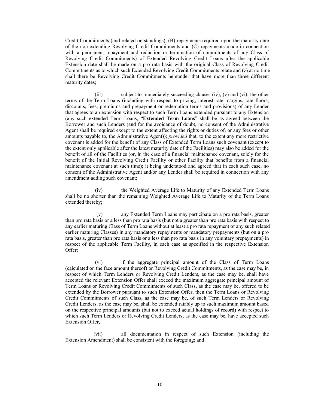 Credit Commitments (and related outstandings), (B) repayments required upon the maturity date of the non-extending Revolving Credit Commitments and (C) repayments made in connection with a permanent repayment and reduction or termination of commitments of any Class of Revolving Credit Commitments) of Extended Revolving Credit Loans after the applicable Extension date shall be made on a pro rata basis with the original Class of Revolving Credit Commitments as to which such Extended Revolving Credit Commitments relate and (z) at no time shall there be Revolving Credit Commitments hereunder that have more than three different maturity dates; (iii) subject to immediately succeeding clauses (iv), (v) and (vi), the other terms of the Term Loans (including with respect to pricing, interest rate margins, rate floors, discounts, fees, premiums and prepayment or redemption terms and provisions) of any Lender that agrees to an extension with respect to such Term Loans extended pursuant to any Extension (any such extended Term Loans, “Extended Term Loans” shall be as agreed between the Borrower and such Lenders (and for the avoidance of doubt, no consent of the Administrative Agent shall be required except to the extent affecting the rights or duties of, or any fees or other amounts payable to, the Administrative Agent)); provided that, to the extent any more restrictive covenant is added for the benefit of any Class of Extended Term Loans such covenant (except to the extent only applicable after the latest maturity date of the Facilities) may also be added for the benefit of all of the Facilities (or, in the case of a financial maintenance covenant, solely for the benefit of the Initial Revolving Credit Facility or other Facility that benefits from a financial maintenance covenant at such time); it being understood and agreed that in each such case, no consent of the Administrative Agent and/or any Lender shall be required in connection with any amendment adding such covenant; (iv) the Weighted Average Life to Maturity of any Extended Term Loans shall be no shorter than the remaining Weighted Average Life to Maturity of the Term Loans extended thereby; (v) any Extended Term Loans may participate on a pro rata basis, greater than pro rata basis or a less than pro rata basis (but not a greater than pro rata basis with respect to any earlier maturing Class of Term Loans without at least a pro rata repayment of any such related earlier maturing Classes) in any mandatory repayments or mandatory prepayments (but on a pro rata basis, greater than pro rata basis or a less than pro rata basis in any voluntary prepayments) in respect of the applicable Term Facility, in each case as specified in the respective Extension Offer; (vi) if the aggregate principal amount of the Class of Term Loans (calculated on the face amount thereof) or Revolving Credit Commitments, as the case may be, in respect of which Term Lenders or Revolving Credit Lenders, as the case may be, shall have accepted the relevant Extension Offer shall exceed the maximum aggregate principal amount of Term Loans or Revolving Credit Commitments of such Class, as the case may be, offered to be extended by the Borrower pursuant to such Extension Offer, then the Term Loans or Revolving Credit Commitments of such Class, as the case may be, of such Term Lenders or Revolving Credit Lenders, as the case may be, shall be extended ratably up to such maximum amount based on the respective principal amounts (but not to exceed actual holdings of record) with respect to which such Term Lenders or Revolving Credit Lenders, as the case may be, have accepted such Extension Offer, (vii) all documentation in respect of such Extension (including the Extension Amendment) shall be consistent with the foregoing; and 110