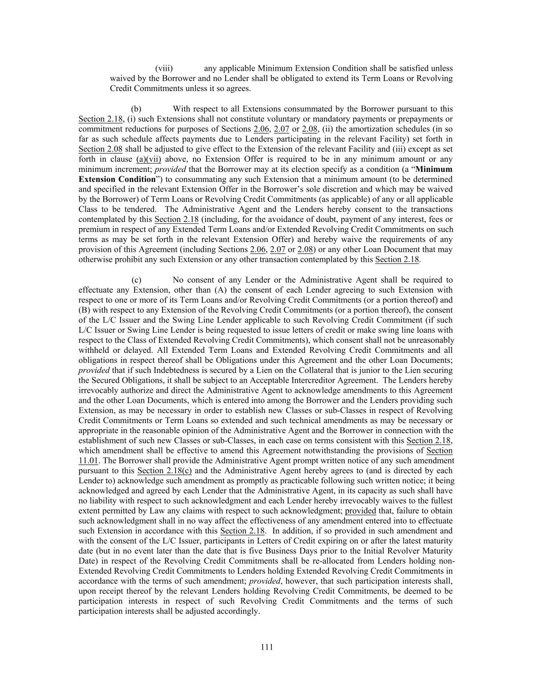 (viii) any applicable Minimum Extension Condition shall be satisfied unless waived by the Borrower and no Lender shall be obligated to extend its Term Loans or Revolving Credit Commitments unless it so agrees. (b) With respect to all Extensions consummated by the Borrower pursuant to this Section 2.18, (i) such Extensions shall not constitute voluntary or mandatory payments or prepayments or commitment reductions for purposes of Sections 2.06, 2.07 or 2.08, (ii) the amortization schedules (in so far as such schedule affects payments due to Lenders participating in the relevant Facility) set forth in Section 2.08 shall be adjusted to give effect to the Extension of the relevant Facility and (iii) except as set forth in clause (a) (vii) above, no Extension Offer is required to be in any minimum amount or any minimum increment; provided that the Borrower may at its election specify as a condition (a “Minimum Extension Condition”) to consummating any such Extension that a minimum amount (to be determined and specified in the relevant Extension Offer in the Borrower’s sole discretion and which may be waived by the Borrower) of Term Loans or Revolving Credit Commitments (as applicable) of any or all applicable Class to be tendered. The Administrative Agent and the Lenders hereby consent to the transactions contemplated by this Section 2.18 (including, for the avoidance of doubt, payment of any interest, fees or premium in respect of any Extended Term Loans and/or Extended Revolving Credit Commitments on such terms as may be set forth in the relevant Extension Offer) and hereby waive the requirements of any provision of this Agreement (including Sections 2.06, 2.07 or 2.08) or any other Loan Document that may otherwise prohibit any such Extension or any other transaction contemplated by this Section 2.18. (c) No consent of any Lender or the Administrative Agent shall be required to effectuate any Extension, other than (A) the consent of each Lender agreeing to such Extension with respect to one or more of its Term Loans and/or Revolving Credit Commitments (or a portion thereof) and (B) with respect to any Extension of the Revolving Credit Commitments (or a portion thereof), the consent of the L/C Issuer and the Swing Line Lender applicable to such Revolving Credit Commitment (if such L/C Issuer or Swing Line Lender is being requested to issue letters of credit or make swing line loans with respect to the Class of Extended Revolving Credit Commitments), which consent shall not be unreasonably withheld or delayed. All Extended Term Loans and Extended Revolving Credit Commitments and all obligations in respect thereof shall be Obligations under this Agreement and the other Loan Documents; provided that if such Indebtedness is secured by a Lien on the Collateral that is junior to the Lien securing the Secured Obligations, it shall be subject to an Acceptable Intercreditor Agreement. The Lenders hereby irrevocably authorize and direct the Administrative Agent to acknowledge amendments to this Agreement and the other Loan Documents, which is entered into among the Borrower and the Lenders providing such Extension, as may be necessary in order to establish new Classes or sub-Classes in respect of Revolving Credit Commitments or Term Loans so extended and such technical amendments as may be necessary or appropriate in the reasonable opinion of the Administrative Agent and the Borrower in connection with the establishment of such new Classes or sub-Classes, in each case on terms consistent with this Section 2.18, which amendment shall be effective to amend this Agreement notwithstanding the provisions of Section 11.01. The Borrower shall provide the Administrative Agent prompt written notice of any such amendment pursuant to this Section 2.18(c) and the Administrative Agent hereby agrees to (and is directed by each Lender to) acknowledge such amendment as promptly as practicable following such written notice; it being acknowledged and agreed by each Lender that the Administrative Agent, in its capacity as such shall have no liability with respect to such acknowledgment and each Lender hereby irrevocably waives to the fullest extent permitted by Law any claims with respect to such acknowledgment; provided that, failure to obtain such acknowledgment shall in no way affect the effectiveness of any amendment entered into to effectuate such Extension in accordance with this Section 2.18. In addition, if so provided in such amendment and with the consent of the L/C Issuer, participants in Letters of Credit expiring on or after the latest maturity date (but in no event later than the date that is five Business Days prior to the Initial Revolver Maturity Date) in respect of the Revolving Credit Commitments shall be re-allocated from Lenders holding non- Extended Revolving Credit Commitments to Lenders holding Extended Revolving Credit Commitments in accordance with the terms of such amendment; provided, however, that such participation interests shall, upon receipt thereof by the relevant Lenders holding Revolving Credit Commitments, be deemed to be participation interests in respect of such Revolving Credit Commitments and the terms of such participation interests shall be adjusted accordingly. 111