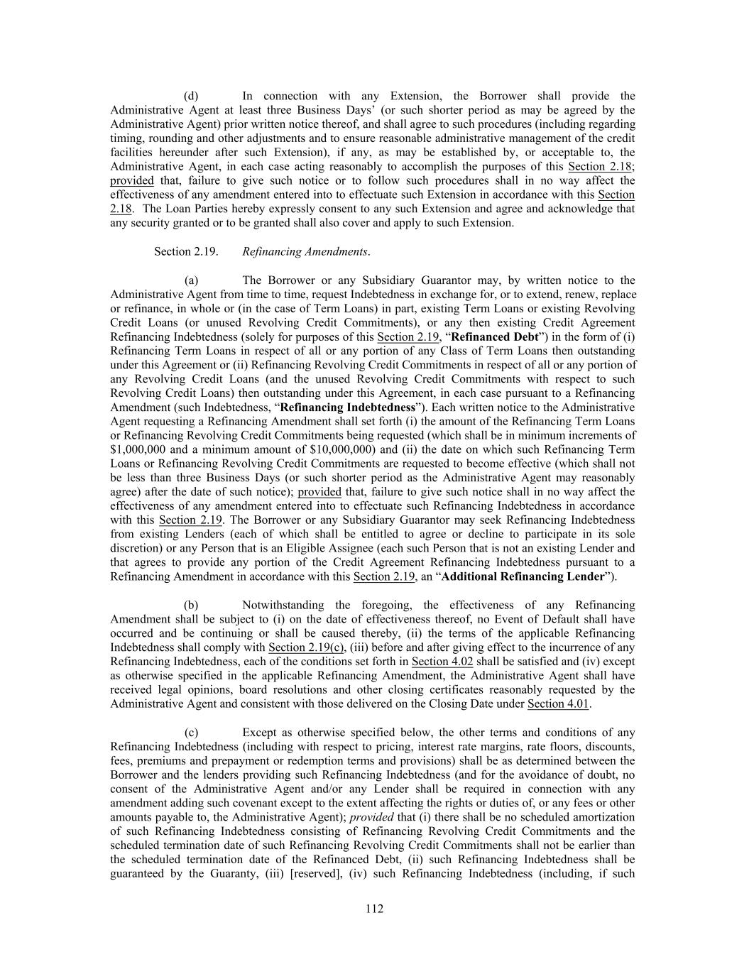(d) In connection with any Extension, the Borrower shall provide the Administrative Agent at least three Business Days’ (or such shorter period as may be agreed by the Administrative Agent) prior written notice thereof, and shall agree to such procedures (including regarding timing, rounding and other adjustments and to ensure reasonable administrative management of the credit facilities hereunder after such Extension), if any, as may be established by, or acceptable to, the Administrative Agent, in each case acting reasonably to accomplish the purposes of this Section 2.18; provided that, failure to give such notice or to follow such procedures shall in no way affect the effectiveness of any amendment entered into to effectuate such Extension in accordance with this Section 2.18. The Loan Parties hereby expressly consent to any such Extension and agree and acknowledge that any security granted or to be granted shall also cover and apply to such Extension. Section 2.19. Refinancing Amendments. (a) The Borrower or any Subsidiary Guarantor may, by written notice to the Administrative Agent from time to time, request Indebtedness in exchange for, or to extend, renew, replace or refinance, in whole or (in the case of Term Loans) in part, existing Term Loans or existing Revolving Credit Loans (or unused Revolving Credit Commitments), or any then existing Credit Agreement Refinancing Indebtedness (solely for purposes of this Section 2.19, “Refinanced Debt”) in the form of (i) Refinancing Term Loans in respect of all or any portion of any Class of Term Loans then outstanding under this Agreement or (ii) Refinancing Revolving Credit Commitments in respect of all or any portion of any Revolving Credit Loans (and the unused Revolving Credit Commitments with respect to such Revolving Credit Loans) then outstanding under this Agreement, in each case pursuant to a Refinancing Amendment (such Indebtedness, “Refinancing Indebtedness”). Each written notice to the Administrative Agent requesting a Refinancing Amendment shall set forth (i) the amount of the Refinancing Term Loans or Refinancing Revolving Credit Commitments being requested (which shall be in minimum increments of $1,000,000 and a minimum amount of $10,000,000) and (ii) the date on which such Refinancing Term Loans or Refinancing Revolving Credit Commitments are requested to become effective (which shall not be less than three Business Days (or such shorter period as the Administrative Agent may reasonably agree) after the date of such notice); provided that, failure to give such notice shall in no way affect the effectiveness of any amendment entered into to effectuate such Refinancing Indebtedness in accordance with this Section 2.19. The Borrower or any Subsidiary Guarantor may seek Refinancing Indebtedness from existing Lenders (each of which shall be entitled to agree or decline to participate in its sole discretion) or any Person that is an Eligible Assignee (each such Person that is not an existing Lender and that agrees to provide any portion of the Credit Agreement Refinancing Indebtedness pursuant to a Refinancing Amendment in accordance with this Section 2.19, an “Additional Refinancing Lender”). (b) Notwithstanding the foregoing, the effectiveness of any Refinancing Amendment shall be subject to (i) on the date of effectiveness thereof, no Event of Default shall have occurred and be continuing or shall be caused thereby, (ii) the terms of the applicable Refinancing Indebtedness shall comply with Section 2.19(c), (iii) before and after giving effect to the incurrence of any Refinancing Indebtedness, each of the conditions set forth in Section 4.02 shall be satisfied and (iv) except as otherwise specified in the applicable Refinancing Amendment, the Administrative Agent shall have received legal opinions, board resolutions and other closing certificates reasonably requested by the Administrative Agent and consistent with those delivered on the Closing Date under Section 4.01. (c) Except as otherwise specified below, the other terms and conditions of any Refinancing Indebtedness (including with respect to pricing, interest rate margins, rate floors, discounts, fees, premiums and prepayment or redemption terms and provisions) shall be as determined between the Borrower and the lenders providing such Refinancing Indebtedness (and for the avoidance of doubt, no consent of the Administrative Agent and/or any Lender shall be required in connection with any amendment adding such covenant except to the extent affecting the rights or duties of, or any fees or other amounts payable to, the Administrative Agent); provided that (i) there shall be no scheduled amortization of such Refinancing Indebtedness consisting of Refinancing Revolving Credit Commitments and the scheduled termination date of such Refinancing Revolving Credit Commitments shall not be earlier than the scheduled termination date of the Refinanced Debt, (ii) such Refinancing Indebtedness shall be guaranteed by the Guaranty, (iii) [reserved], (iv) such Refinancing Indebtedness (including, if such 112