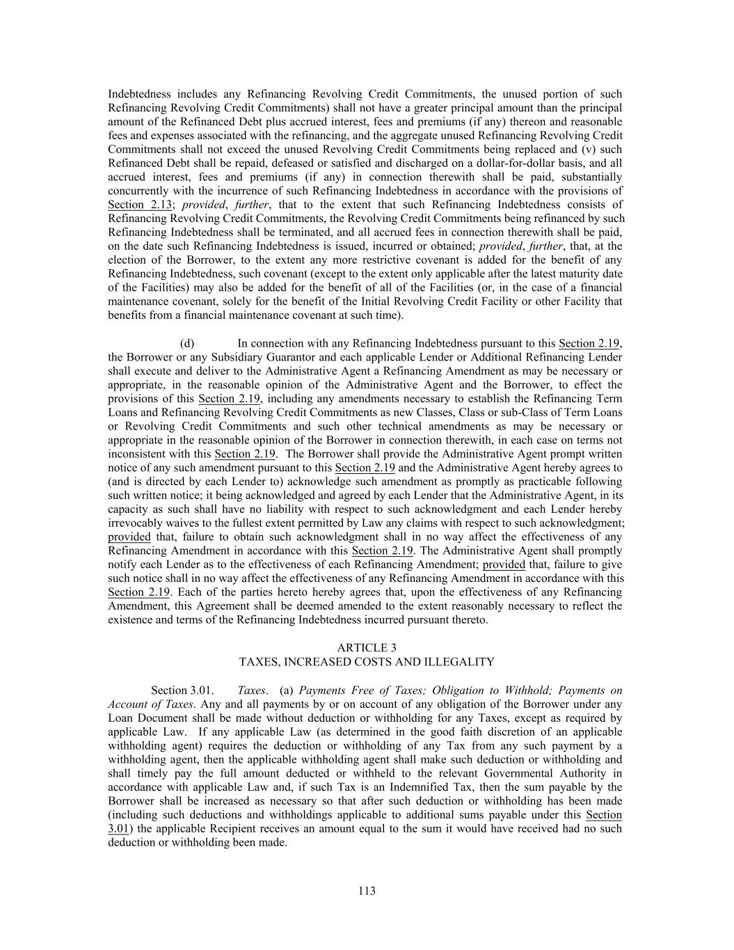 Indebtedness includes any Refinancing Revolving Credit Commitments, the unused portion of such Refinancing Revolving Credit Commitments) shall not have a greater principal amount than the principal amount of the Refinanced Debt plus accrued interest, fees and premiums (if any) thereon and reasonable fees and expenses associated with the refinancing, and the aggregate unused Refinancing Revolving Credit Commitments shall not exceed the unused Revolving Credit Commitments being replaced and (v) such Refinanced Debt shall be repaid, defeased or satisfied and discharged on a dollar-for-dollar basis, and all accrued interest, fees and premiums (if any) in connection therewith shall be paid, substantially concurrently with the incurrence of such Refinancing Indebtedness in accordance with the provisions of Section 2.13; provided, further, that to the extent that such Refinancing Indebtedness consists of Refinancing Revolving Credit Commitments, the Revolving Credit Commitments being refinanced by such Refinancing Indebtedness shall be terminated, and all accrued fees in connection therewith shall be paid, on the date such Refinancing Indebtedness is issued, incurred or obtained; provided, further, that, at the election of the Borrower, to the extent any more restrictive covenant is added for the benefit of any Refinancing Indebtedness, such covenant (except to the extent only applicable after the latest maturity date of the Facilities) may also be added for the benefit of all of the Facilities (or, in the case of a financial maintenance covenant, solely for the benefit of the Initial Revolving Credit Facility or other Facility that benefits from a financial maintenance covenant at such time). (d) In connection with any Refinancing Indebtedness pursuant to this Section 2.19, the Borrower or any Subsidiary Guarantor and each applicable Lender or Additional Refinancing Lender shall execute and deliver to the Administrative Agent a Refinancing Amendment as may be necessary or appropriate, in the reasonable opinion of the Administrative Agent and the Borrower, to effect the provisions of this Section 2.19, including any amendments necessary to establish the Refinancing Term Loans and Refinancing Revolving Credit Commitments as new Classes, Class or sub-Class of Term Loans or Revolving Credit Commitments and such other technical amendments as may be necessary or appropriate in the reasonable opinion of the Borrower in connection therewith, in each case on terms not inconsistent with this Section 2.19. The Borrower shall provide the Administrative Agent prompt written notice of any such amendment pursuant to this Section 2.19 and the Administrative Agent hereby agrees to (and is directed by each Lender to) acknowledge such amendment as promptly as practicable following such written notice; it being acknowledged and agreed by each Lender that the Administrative Agent, in its capacity as such shall have no liability with respect to such acknowledgment and each Lender hereby irrevocably waives to the fullest extent permitted by Law any claims with respect to such acknowledgment; provided that, failure to obtain such acknowledgment shall in no way affect the effectiveness of any Refinancing Amendment in accordance with this Section 2.19. The Administrative Agent shall promptly notify each Lender as to the effectiveness of each Refinancing Amendment; provided that, failure to give such notice shall in no way affect the effectiveness of any Refinancing Amendment in accordance with this Section 2.19. Each of the parties hereto hereby agrees that, upon the effectiveness of any Refinancing Amendment, this Agreement shall be deemed amended to the extent reasonably necessary to reflect the existence and terms of the Refinancing Indebtedness incurred pursuant thereto. ARTICLE 3 TAXES, INCREASED COSTS AND ILLEGALITY Section 3.01. Taxes. (a) Payments Free of Taxes; Obligation to Withhold; Payments on Account of Taxes. Any and all payments by or on account of any obligation of the Borrower under any Loan Document shall be made without deduction or withholding for any Taxes, except as required by applicable Law. If any applicable Law (as determined in the good faith discretion of an applicable withholding agent) requires the deduction or withholding of any Tax from any such payment by a withholding agent, then the applicable withholding agent shall make such deduction or withholding and shall timely pay the full amount deducted or withheld to the relevant Governmental Authority in accordance with applicable Law and, if such Tax is an Indemnified Tax, then the sum payable by the Borrower shall be increased as necessary so that after such deduction or withholding has been made (including such deductions and withholdings applicable to additional sums payable under this Section 3.01) the applicable Recipient receives an amount equal to the sum it would have received had no such deduction or withholding been made. 113