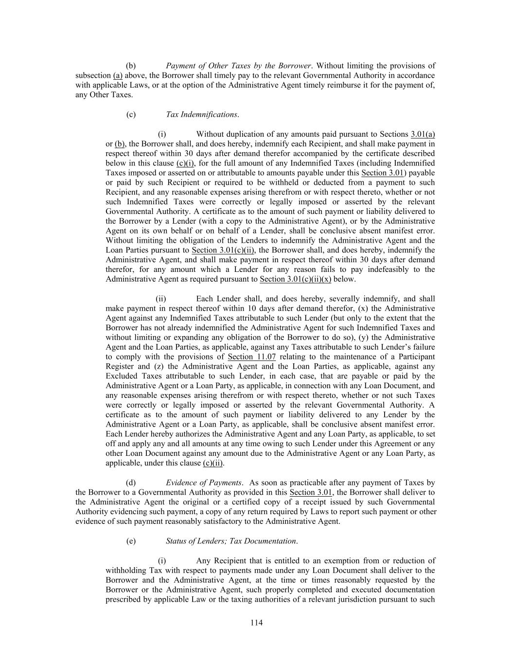 (b) Payment of Other Taxes by the Borrower. Without limiting the provisions of subsection (a) above, the Borrower shall timely pay to the relevant Governmental Authority in accordance with applicable Laws, or at the option of the Administrative Agent timely reimburse it for the payment of, any Other Taxes. (c) Tax Indemnifications. (i) Without duplication of any amounts paid pursuant to Sections 3.01(a) or (b), the Borrower shall, and does hereby, indemnify each Recipient, and shall make payment in respect thereof within 30 days after demand therefor accompanied by the certificate described below in this clause (c) (i), for the full amount of any Indemnified Taxes (including Indemnified Taxes imposed or asserted on or attributable to amounts payable under this Section 3.01) payable or paid by such Recipient or required to be withheld or deducted from a payment to such Recipient, and any reasonable expenses arising therefrom or with respect thereto, whether or not such Indemnified Taxes were correctly or legally imposed or asserted by the relevant Governmental Authority. A certificate as to the amount of such payment or liability delivered to the Borrower by a Lender (with a copy to the Administrative Agent), or by the Administrative Agent on its own behalf or on behalf of a Lender, shall be conclusive absent manifest error. Without limiting the obligation of the Lenders to indemnify the Administrative Agent and the Loan Parties pursuant to Section 3.01(c)(ii), the Borrower shall, and does hereby, indemnify the Administrative Agent, and shall make payment in respect thereof within 30 days after demand therefor, for any amount which a Lender for any reason fails to pay indefeasibly to the Administrative Agent as required pursuant to Section 3.01(c)(ii)(x) below. (ii) Each Lender shall, and does hereby, severally indemnify, and shall make payment in respect thereof within 10 days after demand therefor, (x) the Administrative Agent against any Indemnified Taxes attributable to such Lender (but only to the extent that the Borrower has not already indemnified the Administrative Agent for such Indemnified Taxes and without limiting or expanding any obligation of the Borrower to do so), (y) the Administrative Agent and the Loan Parties, as applicable, against any Taxes attributable to such Lender’s failure to comply with the provisions of Section 11.07 relating to the maintenance of a Participant Register and (z) the Administrative Agent and the Loan Parties, as applicable, against any Excluded Taxes attributable to such Lender, in each case, that are payable or paid by the Administrative Agent or a Loan Party, as applicable, in connection with any Loan Document, and any reasonable expenses arising therefrom or with respect thereto, whether or not such Taxes were correctly or legally imposed or asserted by the relevant Governmental Authority. A certificate as to the amount of such payment or liability delivered to any Lender by the Administrative Agent or a Loan Party, as applicable, shall be conclusive absent manifest error. Each Lender hereby authorizes the Administrative Agent and any Loan Party, as applicable, to set off and apply any and all amounts at any time owing to such Lender under this Agreement or any other Loan Document against any amount due to the Administrative Agent or any Loan Party, as applicable, under this clause (c) (ii). (d) Evidence of Payments. As soon as practicable after any payment of Taxes by the Borrower to a Governmental Authority as provided in this Section 3.01, the Borrower shall deliver to the Administrative Agent the original or a certified copy of a receipt issued by such Governmental Authority evidencing such payment, a copy of any return required by Laws to report such payment or other evidence of such payment reasonably satisfactory to the Administrative Agent. (e) Status of Lenders; Tax Documentation. (i) Any Recipient that is entitled to an exemption from or reduction of withholding Tax with respect to payments made under any Loan Document shall deliver to the Borrower and the Administrative Agent, at the time or times reasonably requested by the Borrower or the Administrative Agent, such properly completed and executed documentation prescribed by applicable Law or the taxing authorities of a relevant jurisdiction pursuant to such 114