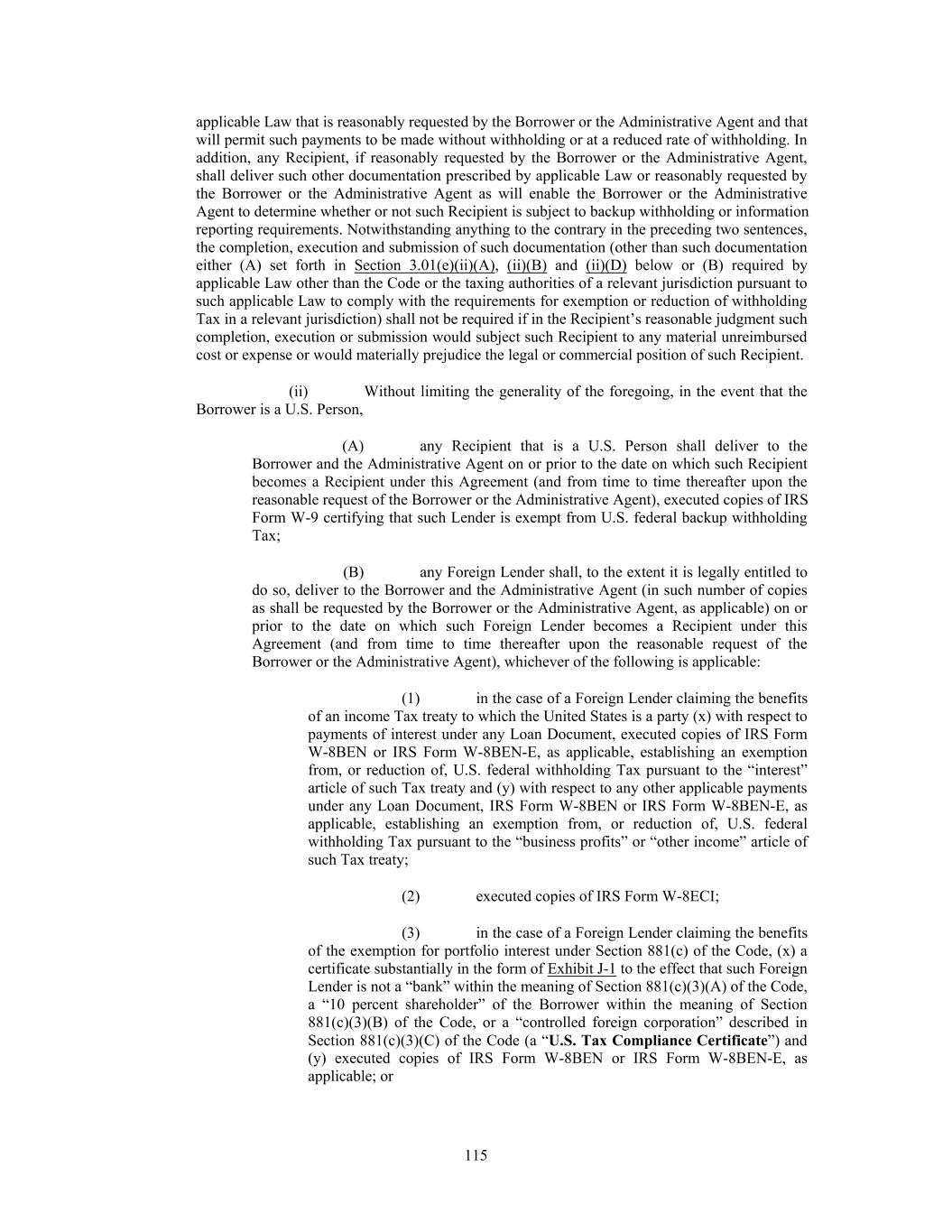 applicable Law that is reasonably requested by the Borrower or the Administrative Agent and that will permit such payments to be made without withholding or at a reduced rate of withholding. In addition, any Recipient, if reasonably requested by the Borrower or the Administrative Agent, shall deliver such other documentation prescribed by applicable Law or reasonably requested by the Borrower or the Administrative Agent as will enable the Borrower or the Administrative Agent to determine whether or not such Recipient is subject to backup withholding or information reporting requirements. Notwithstanding anything to the contrary in the preceding two sentences, the completion, execution and submission of such documentation (other than such documentation either (A) set forth in Section 3.01(e)(ii)(A), (ii) (B) and (ii) (D) below or (B) required by applicable Law other than the Code or the taxing authorities of a relevant jurisdiction pursuant to such applicable Law to comply with the requirements for exemption or reduction of withholding Tax in a relevant jurisdiction) shall not be required if in the Recipient’s reasonable judgment such completion, execution or submission would subject such Recipient to any material unreimbursed cost or expense or would materially prejudice the legal or commercial position of such Recipient. (ii) Without limiting the generality of the foregoing, in the event that the Borrower is a U.S. Person, (A) any Recipient that is a U.S. Person shall deliver to the Borrower and the Administrative Agent on or prior to the date on which such Recipient becomes a Recipient under this Agreement (and from time to time thereafter upon the reasonable request of the Borrower or the Administrative Agent), executed copies of IRS Form W-9 certifying that such Lender is exempt from U.S. federal backup withholding Tax; (B) any Foreign Lender shall, to the extent it is legally entitled to do so, deliver to the Borrower and the Administrative Agent (in such number of copies as shall be requested by the Borrower or the Administrative Agent, as applicable) on or prior to the date on which such Foreign Lender becomes a Recipient under this Agreement (and from time to time thereafter upon the reasonable request of the Borrower or the Administrative Agent), whichever of the following is applicable: (1) in the case of a Foreign Lender claiming the benefits of an income Tax treaty to which the United States is a party (x) with respect to payments of interest under any Loan Document, executed copies of IRS Form W-8BEN or IRS Form W-8BEN-E, as applicable, establishing an exemption from, or reduction of, U.S. federal withholding Tax pursuant to the “interest” article of such Tax treaty and (y) with respect to any other applicable payments under any Loan Document, IRS Form W-8BEN or IRS Form W-8BEN-E, as applicable, establishing an exemption from, or reduction of, U.S. federal withholding Tax pursuant to the “business profits” or “other income” article of such Tax treaty; (2) executed copies of IRS Form W-8ECI; (3) in the case of a Foreign Lender claiming the benefits of the exemption for portfolio interest under Section 881(c) of the Code, (x) a certificate substantially in the form of Exhibit J-1 to the effect that such Foreign Lender is not a “bank” within the meaning of Section 881(c)(3)(A) of the Code, a “10 percent shareholder” of the Borrower within the meaning of Section 881(c)(3)(B) of the Code, or a “controlled foreign corporation” described in Section 881(c)(3)(C) of the Code (a “U.S. Tax Compliance Certificate”) and (y) executed copies of IRS Form W-8BEN or IRS Form W-8BEN-E, as applicable; or 115