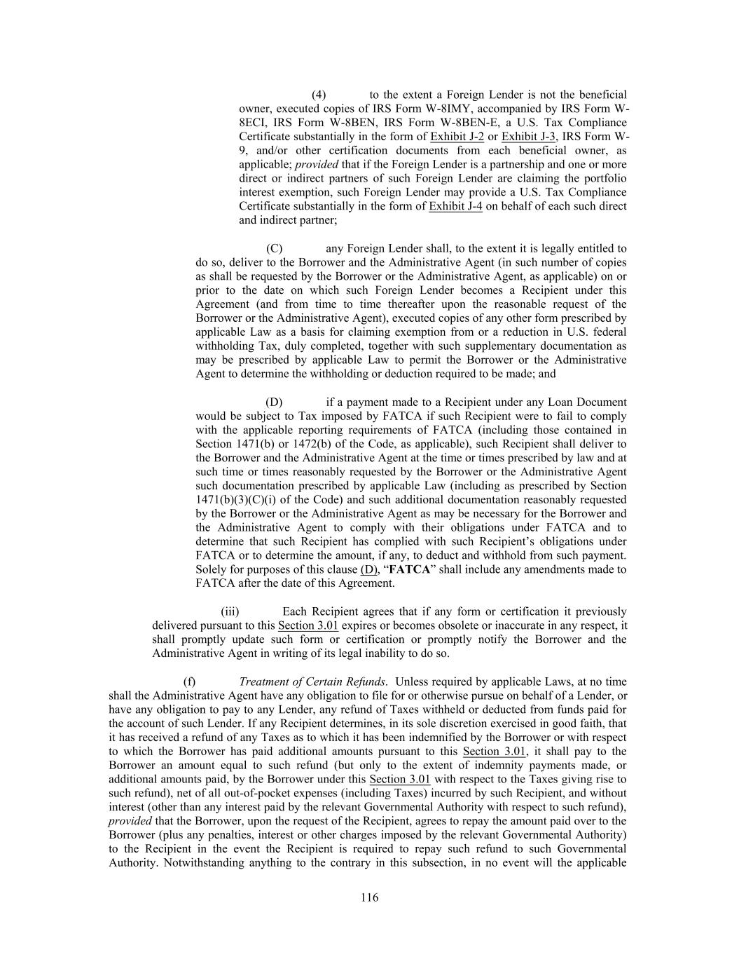 (4) to the extent a Foreign Lender is not the beneficial owner, executed copies of IRS Form W-8IMY, accompanied by IRS Form W- 8ECI, IRS Form W-8BEN, IRS Form W-8BEN-E, a U.S. Tax Compliance Certificate substantially in the form of Exhibit J-2 or Exhibit J-3, IRS Form W- 9, and/or other certification documents from each beneficial owner, as applicable; provided that if the Foreign Lender is a partnership and one or more direct or indirect partners of such Foreign Lender are claiming the portfolio interest exemption, such Foreign Lender may provide a U.S. Tax Compliance Certificate substantially in the form of Exhibit J-4 on behalf of each such direct and indirect partner; (C) any Foreign Lender shall, to the extent it is legally entitled to do so, deliver to the Borrower and the Administrative Agent (in such number of copies as shall be requested by the Borrower or the Administrative Agent, as applicable) on or prior to the date on which such Foreign Lender becomes a Recipient under this Agreement (and from time to time thereafter upon the reasonable request of the Borrower or the Administrative Agent), executed copies of any other form prescribed by applicable Law as a basis for claiming exemption from or a reduction in U.S. federal withholding Tax, duly completed, together with such supplementary documentation as may be prescribed by applicable Law to permit the Borrower or the Administrative Agent to determine the withholding or deduction required to be made; and (D) if a payment made to a Recipient under any Loan Document would be subject to Tax imposed by FATCA if such Recipient were to fail to comply with the applicable reporting requirements of FATCA (including those contained in Section 1471(b) or 1472(b) of the Code, as applicable), such Recipient shall deliver to the Borrower and the Administrative Agent at the time or times prescribed by law and at such time or times reasonably requested by the Borrower or the Administrative Agent such documentation prescribed by applicable Law (including as prescribed by Section 1471(b)(3)(C)(i) of the Code) and such additional documentation reasonably requested by the Borrower or the Administrative Agent as may be necessary for the Borrower and the Administrative Agent to comply with their obligations under FATCA and to determine that such Recipient has complied with such Recipient’s obligations under FATCA or to determine the amount, if any, to deduct and withhold from such payment. Solely for purposes of this clause (D), “FATCA” shall include any amendments made to FATCA after the date of this Agreement. (iii) Each Recipient agrees that if any form or certification it previously delivered pursuant to this Section 3.01 expires or becomes obsolete or inaccurate in any respect, it shall promptly update such form or certification or promptly notify the Borrower and the Administrative Agent in writing of its legal inability to do so. (f) Treatment of Certain Refunds. Unless required by applicable Laws, at no time shall the Administrative Agent have any obligation to file for or otherwise pursue on behalf of a Lender, or have any obligation to pay to any Lender, any refund of Taxes withheld or deducted from funds paid for the account of such Lender. If any Recipient determines, in its sole discretion exercised in good faith, that it has received a refund of any Taxes as to which it has been indemnified by the Borrower or with respect to which the Borrower has paid additional amounts pursuant to this Section 3.01, it shall pay to the Borrower an amount equal to such refund (but only to the extent of indemnity payments made, or additional amounts paid, by the Borrower under this Section 3.01 with respect to the Taxes giving rise to such refund), net of all out-of-pocket expenses (including Taxes) incurred by such Recipient, and without interest (other than any interest paid by the relevant Governmental Authority with respect to such refund), provided that the Borrower, upon the request of the Recipient, agrees to repay the amount paid over to the Borrower (plus any penalties, interest or other charges imposed by the relevant Governmental Authority) to the Recipient in the event the Recipient is required to repay such refund to such Governmental Authority. Notwithstanding anything to the contrary in this subsection, in no event will the applicable 116