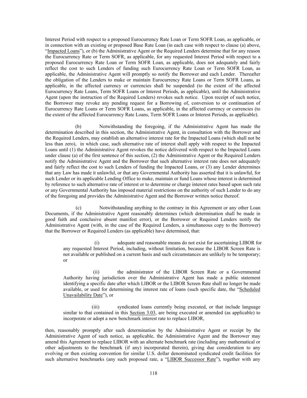 Interest Period with respect to a proposed Eurocurrency Rate Loan or Term SOFR Loan, as applicable, or in connection with an existing or proposed Base Rate Loan (in each case with respect to clause (a) above, “Impacted Loans”), or (b) the Administrative Agent or the Required Lenders determine that for any reason the Eurocurrency Rate or Term SOFR, as applicable, for any requested Interest Period with respect to a proposed Eurocurrency Rate Loan or Term SOFR Loan, as applicable, does not adequately and fairly reflect the cost to such Lenders of funding such Eurocurrency Rate Loan or Term SOFR Loan, as applicable, the Administrative Agent will promptly so notify the Borrower and each Lender. Thereafter the obligation of the Lenders to make or maintain Eurocurrency Rate Loans or Term SOFR Loans, as applicable, in the affected currency or currencies shall be suspended (to the extent of the affected Eurocurrency Rate Loans, Term SOFR Loans or Interest Periods, as applicable), until the Administrative Agent (upon the instruction of the Required Lenders) revokes such notice. Upon receipt of such notice, the Borrower may revoke any pending request for a Borrowing of, conversion to or continuation of Eurocurrency Rate Loans or Term SOFR Loans, as applicable, in the affected currency or currencies (to the extent of the affected Eurocurrency Rate Loans, Term SOFR Loans or Interest Periods, as applicable). (b) Notwithstanding the foregoing, if the Administrative Agent has made the determination described in this section, the Administrative Agent, in consultation with the Borrower and the Required Lenders, may establish an alternative interest rate for the Impacted Loans (which shall not be less than zero), in which case, such alternative rate of interest shall apply with respect to the Impacted Loans until (1) the Administrative Agent revokes the notice delivered with respect to the Impacted Loans under clause (a) of the first sentence of this section, (2) the Administrative Agent or the Required Lenders notify the Administrative Agent and the Borrower that such alternative interest rate does not adequately and fairly reflect the cost to such Lenders of funding the Impacted Loans, or (3) any Lender determines that any Law has made it unlawful, or that any Governmental Authority has asserted that it is unlawful, for such Lender or its applicable Lending Office to make, maintain or fund Loans whose interest is determined by reference to such alternative rate of interest or to determine or charge interest rates based upon such rate or any Governmental Authority has imposed material restrictions on the authority of such Lender to do any of the foregoing and provides the Administrative Agent and the Borrower written notice thereof. (c) Notwithstanding anything to the contrary in this Agreement or any other Loan Documents, if the Administrative Agent reasonably determines (which determination shall be made in good faith and conclusive absent manifest error), or the Borrower or Required Lenders notify the Administrative Agent (with, in the case of the Required Lenders, a simultaneous copy to the Borrower) that the Borrower or Required Lenders (as applicable) have determined, that: (i) adequate and reasonable means do not exist for ascertaining LIBOR for any requested Interest Period, including, without limitation, because the LIBOR Screen Rate is not available or published on a current basis and such circumstances are unlikely to be temporary; or (ii) the administrator of the LIBOR Screen Rate or a Governmental Authority having jurisdiction over the Administrative Agent has made a public statement identifying a specific date after which LIBOR or the LIBOR Screen Rate shall no longer be made available, or used for determining the interest rate of loans (such specific date, the “Scheduled Unavailability Date”), or (iii) syndicated loans currently being executed, or that include language similar to that contained in this Section 3.03, are being executed or amended (as applicable) to incorporate or adopt a new benchmark interest rate to replace LIBOR, then, reasonably promptly after such determination by the Administrative Agent or receipt by the Administrative Agent of such notice, as applicable, the Administrative Agent and the Borrower may amend this Agreement to replace LIBOR with an alternate benchmark rate (including any mathematical or other adjustments to the benchmark (if any) incorporated therein), giving due consideration to any evolving or then existing convention for similar U.S. dollar denominated syndicated credit facilities for such alternative benchmarks (any such proposed rate, a “LIBOR Successor Rate”), together with any 118