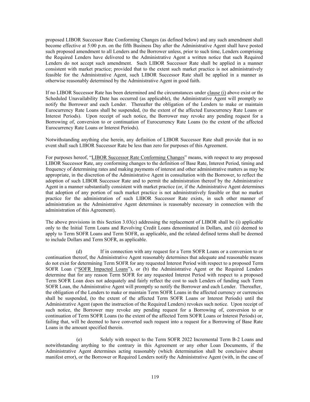 proposed LIBOR Successor Rate Conforming Changes (as defined below) and any such amendment shall become effective at 5:00 p.m. on the fifth Business Day after the Administrative Agent shall have posted such proposed amendment to all Lenders and the Borrower unless, prior to such time, Lenders comprising the Required Lenders have delivered to the Administrative Agent a written notice that such Required Lenders do not accept such amendment. Such LIBOR Successor Rate shall be applied in a manner consistent with market practice; provided that to the extent such market practice is not administratively feasible for the Administrative Agent, such LIBOR Successor Rate shall be applied in a manner as otherwise reasonably determined by the Administrative Agent in good faith. If no LIBOR Successor Rate has been determined and the circumstances under clause (i) above exist or the Scheduled Unavailability Date has occurred (as applicable), the Administrative Agent will promptly so notify the Borrower and each Lender. Thereafter the obligation of the Lenders to make or maintain Eurocurrency Rate Loans shall be suspended, (to the extent of the affected Eurocurrency Rate Loans or Interest Periods). Upon receipt of such notice, the Borrower may revoke any pending request for a Borrowing of, conversion to or continuation of Eurocurrency Rate Loans (to the extent of the affected Eurocurrency Rate Loans or Interest Periods). Notwithstanding anything else herein, any definition of LIBOR Successor Rate shall provide that in no event shall such LIBOR Successor Rate be less than zero for purposes of this Agreement. For purposes hereof, “LIBOR Successor Rate Conforming Changes” means, with respect to any proposed LIBOR Successor Rate, any conforming changes to the definition of Base Rate, Interest Period, timing and frequency of determining rates and making payments of interest and other administrative matters as may be appropriate, in the discretion of the Administrative Agent in consultation with the Borrower, to reflect the adoption of such LIBOR Successor Rate and to permit the administration thereof by the Administrative Agent in a manner substantially consistent with market practice (or, if the Administrative Agent determines that adoption of any portion of such market practice is not administratively feasible or that no market practice for the administration of such LIBOR Successor Rate exists, in such other manner of administration as the Administrative Agent determines is reasonably necessary in connection with the administration of this Agreement). The above provisions in this Section 3.03(c) addressing the replacement of LIBOR shall be (i) applicable only to the Initial Term Loans and Revolving Credit Loans denominated in Dollars, and (ii) deemed to apply to Term SOFR Loans and Term SOFR, as applicable, and the related defined terms shall be deemed to include Dollars and Term SOFR, as applicable. (d) If in connection with any request for a Term SOFR Loans or a conversion to or continuation thereof, the Administrative Agent reasonably determines that adequate and reasonable means do not exist for determining Term SOFR for any requested Interest Period with respect to a proposed Term SOFR Loan (“SOFR Impacted Loans”), or (b) the Administrative Agent or the Required Lenders determine that for any reason Term SOFR for any requested Interest Period with respect to a proposed Term SOFR Loan does not adequately and fairly reflect the cost to such Lenders of funding such Term SOFR Loan, the Administrative Agent will promptly so notify the Borrower and each Lender. Thereafter, the obligation of the Lenders to make or maintain Term SOFR Loans in the affected currency or currencies shall be suspended, (to the extent of the affected Term SOFR Loans or Interest Periods) until the Administrative Agent (upon the instruction of the Required Lenders) revokes such notice. Upon receipt of such notice, the Borrower may revoke any pending request for a Borrowing of, conversion to or continuation of Term SOFR Loans (to the extent of the affected Term SOFR Loans or Interest Periods) or, failing that, will be deemed to have converted such request into a request for a Borrowing of Base Rate Loans in the amount specified therein. (e) Solely with respect to the Term SOFR 2022 Incremental Term B-2 Loans and notwithstanding anything to the contrary in this Agreement or any other Loan Documents, if the Administrative Agent determines acting reasonably (which determination shall be conclusive absent manifest error), or the Borrower or Required Lenders notify the Administrative Agent (with, in the case of 119