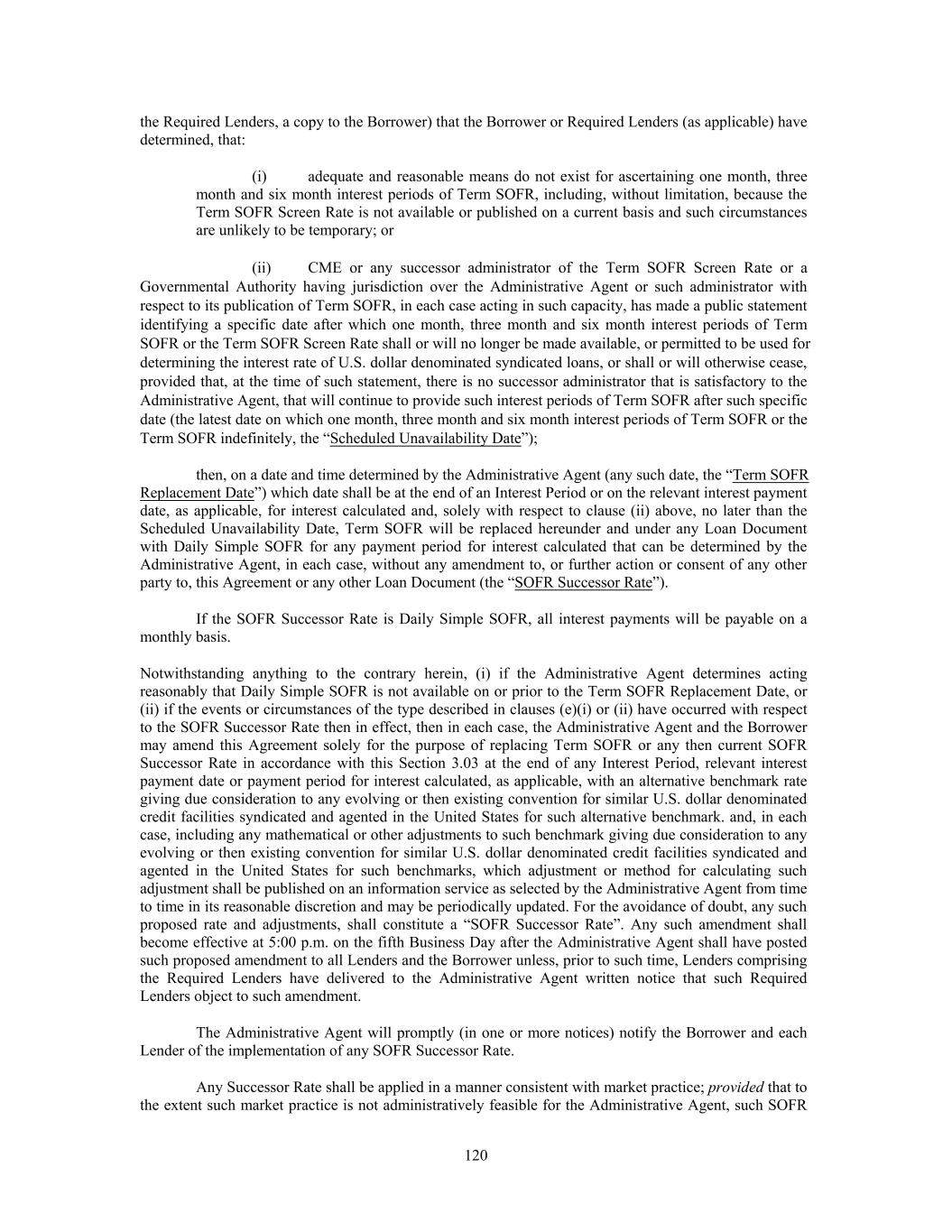 the Required Lenders, a copy to the Borrower) that the Borrower or Required Lenders (as applicable) have determined, that: (i) adequate and reasonable means do not exist for ascertaining one month, three month and six month interest periods of Term SOFR, including, without limitation, because the Term SOFR Screen Rate is not available or published on a current basis and such circumstances are unlikely to be temporary; or (ii) CME or any successor administrator of the Term SOFR Screen Rate or a Governmental Authority having jurisdiction over the Administrative Agent or such administrator with respect to its publication of Term SOFR, in each case acting in such capacity, has made a public statement identifying a specific date after which one month, three month and six month interest periods of Term SOFR or the Term SOFR Screen Rate shall or will no longer be made available, or permitted to be used for determining the interest rate of U.S. dollar denominated syndicated loans, or shall or will otherwise cease, provided that, at the time of such statement, there is no successor administrator that is satisfactory to the Administrative Agent, that will continue to provide such interest periods of Term SOFR after such specific date (the latest date on which one month, three month and six month interest periods of Term SOFR or the Term SOFR indefinitely, the “Scheduled Unavailability Date”); then, on a date and time determined by the Administrative Agent (any such date, the “Term SOFR Replacement Date”) which date shall be at the end of an Interest Period or on the relevant interest payment date, as applicable, for interest calculated and, solely with respect to clause (ii) above, no later than the Scheduled Unavailability Date, Term SOFR will be replaced hereunder and under any Loan Document with Daily Simple SOFR for any payment period for interest calculated that can be determined by the Administrative Agent, in each case, without any amendment to, or further action or consent of any other party to, this Agreement or any other Loan Document (the “SOFR Successor Rate”). If the SOFR Successor Rate is Daily Simple SOFR, all interest payments will be payable on a monthly basis. Notwithstanding anything to the contrary herein, (i) if the Administrative Agent determines acting reasonably that Daily Simple SOFR is not available on or prior to the Term SOFR Replacement Date, or (ii) if the events or circumstances of the type described in clauses (e)(i) or (ii) have occurred with respect to the SOFR Successor Rate then in effect, then in each case, the Administrative Agent and the Borrower may amend this Agreement solely for the purpose of replacing Term SOFR or any then current SOFR Successor Rate in accordance with this Section 3.03 at the end of any Interest Period, relevant interest payment date or payment period for interest calculated, as applicable, with an alternative benchmark rate giving due consideration to any evolving or then existing convention for similar U.S. dollar denominated credit facilities syndicated and agented in the United States for such alternative benchmark. and, in each case, including any mathematical or other adjustments to such benchmark giving due consideration to any evolving or then existing convention for similar U.S. dollar denominated credit facilities syndicated and agented in the United States for such benchmarks, which adjustment or method for calculating such adjustment shall be published on an information service as selected by the Administrative Agent from time to time in its reasonable discretion and may be periodically updated. For the avoidance of doubt, any such proposed rate and adjustments, shall constitute a “SOFR Successor Rate”. Any such amendment shall become effective at 5:00 p.m. on the fifth Business Day after the Administrative Agent shall have posted such proposed amendment to all Lenders and the Borrower unless, prior to such time, Lenders comprising the Required Lenders have delivered to the Administrative Agent written notice that such Required Lenders object to such amendment. The Administrative Agent will promptly (in one or more notices) notify the Borrower and each Lender of the implementation of any SOFR Successor Rate. Any Successor Rate shall be applied in a manner consistent with market practice; provided that to the extent such market practice is not administratively feasible for the Administrative Agent, such SOFR 120