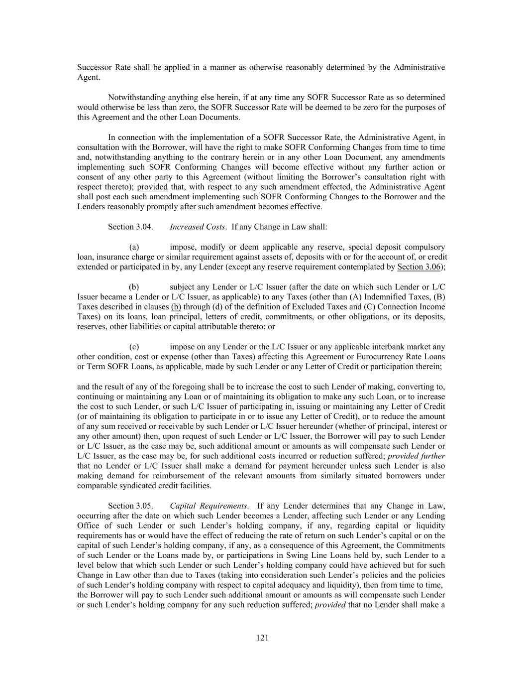 Successor Rate shall be applied in a manner as otherwise reasonably determined by the Administrative Agent. Notwithstanding anything else herein, if at any time any SOFR Successor Rate as so determined would otherwise be less than zero, the SOFR Successor Rate will be deemed to be zero for the purposes of this Agreement and the other Loan Documents. In connection with the implementation of a SOFR Successor Rate, the Administrative Agent, in consultation with the Borrower, will have the right to make SOFR Conforming Changes from time to time and, notwithstanding anything to the contrary herein or in any other Loan Document, any amendments implementing such SOFR Conforming Changes will become effective without any further action or consent of any other party to this Agreement (without limiting the Borrower’s consultation right with respect thereto); provided that, with respect to any such amendment effected, the Administrative Agent shall post each such amendment implementing such SOFR Conforming Changes to the Borrower and the Lenders reasonably promptly after such amendment becomes effective. Section 3.04. Increased Costs. If any Change in Law shall: (a) impose, modify or deem applicable any reserve, special deposit compulsory loan, insurance charge or similar requirement against assets of, deposits with or for the account of, or credit extended or participated in by, any Lender (except any reserve requirement contemplated by Section 3.06); (b) subject any Lender or L/C Issuer (after the date on which such Lender or L/C Issuer became a Lender or L/C Issuer, as applicable) to any Taxes (other than (A) Indemnified Taxes, (B) Taxes described in clauses (b) through (d) of the definition of Excluded Taxes and (C) Connection Income Taxes) on its loans, loan principal, letters of credit, commitments, or other obligations, or its deposits, reserves, other liabilities or capital attributable thereto; or (c) impose on any Lender or the L/C Issuer or any applicable interbank market any other condition, cost or expense (other than Taxes) affecting this Agreement or Eurocurrency Rate Loans or Term SOFR Loans, as applicable, made by such Lender or any Letter of Credit or participation therein; and the result of any of the foregoing shall be to increase the cost to such Lender of making, converting to, continuing or maintaining any Loan or of maintaining its obligation to make any such Loan, or to increase the cost to such Lender, or such L/C Issuer of participating in, issuing or maintaining any Letter of Credit (or of maintaining its obligation to participate in or to issue any Letter of Credit), or to reduce the amount of any sum received or receivable by such Lender or L/C Issuer hereunder (whether of principal, interest or any other amount) then, upon request of such Lender or L/C Issuer, the Borrower will pay to such Lender or L/C Issuer, as the case may be, such additional amount or amounts as will compensate such Lender or L/C Issuer, as the case may be, for such additional costs incurred or reduction suffered; provided further that no Lender or L/C Issuer shall make a demand for payment hereunder unless such Lender is also making demand for reimbursement of the relevant amounts from similarly situated borrowers under comparable syndicated credit facilities. Section 3.05. Capital Requirements. If any Lender determines that any Change in Law, occurring after the date on which such Lender becomes a Lender, affecting such Lender or any Lending Office of such Lender or such Lender’s holding company, if any, regarding capital or liquidity requirements has or would have the effect of reducing the rate of return on such Lender’s capital or on the capital of such Lender’s holding company, if any, as a consequence of this Agreement, the Commitments of such Lender or the Loans made by, or participations in Swing Line Loans held by, such Lender to a level below that which such Lender or such Lender’s holding company could have achieved but for such Change in Law other than due to Taxes (taking into consideration such Lender’s policies and the policies of such Lender’s holding company with respect to capital adequacy and liquidity), then from time to time, the Borrower will pay to such Lender such additional amount or amounts as will compensate such Lender or such Lender’s holding company for any such reduction suffered; provided that no Lender shall make a 121