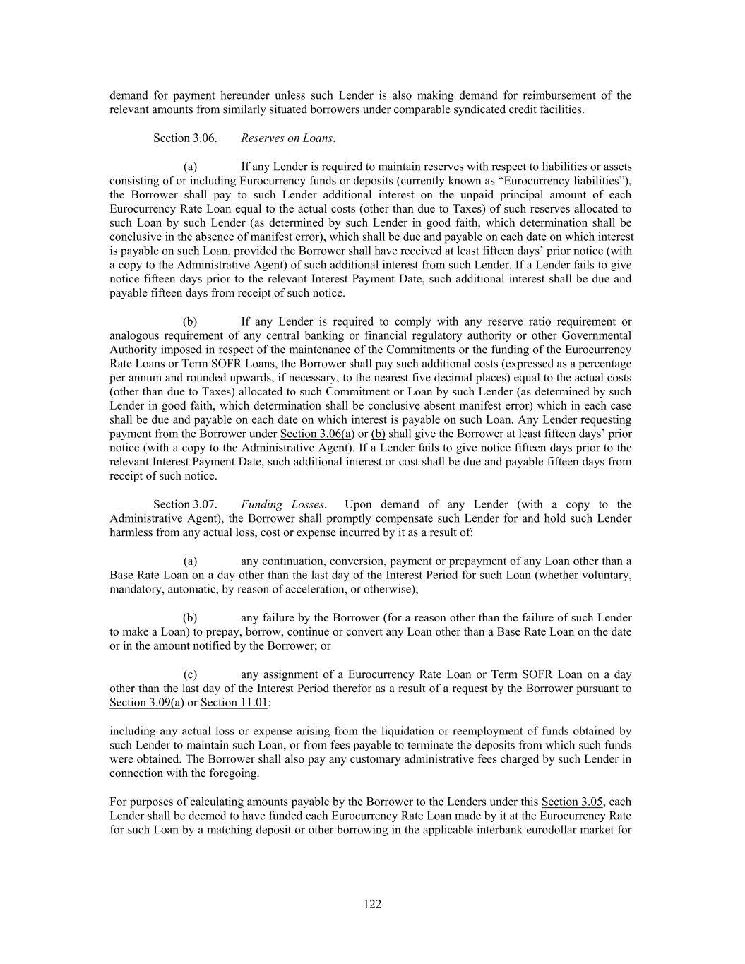 demand for payment hereunder unless such Lender is also making demand for reimbursement of the relevant amounts from similarly situated borrowers under comparable syndicated credit facilities. Section 3.06. Reserves on Loans. (a) If any Lender is required to maintain reserves with respect to liabilities or assets consisting of or including Eurocurrency funds or deposits (currently known as “Eurocurrency liabilities”), the Borrower shall pay to such Lender additional interest on the unpaid principal amount of each Eurocurrency Rate Loan equal to the actual costs (other than due to Taxes) of such reserves allocated to such Loan by such Lender (as determined by such Lender in good faith, which determination shall be conclusive in the absence of manifest error), which shall be due and payable on each date on which interest is payable on such Loan, provided the Borrower shall have received at least fifteen days’ prior notice (with a copy to the Administrative Agent) of such additional interest from such Lender. If a Lender fails to give notice fifteen days prior to the relevant Interest Payment Date, such additional interest shall be due and payable fifteen days from receipt of such notice. (b) If any Lender is required to comply with any reserve ratio requirement or analogous requirement of any central banking or financial regulatory authority or other Governmental Authority imposed in respect of the maintenance of the Commitments or the funding of the Eurocurrency Rate Loans or Term SOFR Loans, the Borrower shall pay such additional costs (expressed as a percentage per annum and rounded upwards, if necessary, to the nearest five decimal places) equal to the actual costs (other than due to Taxes) allocated to such Commitment or Loan by such Lender (as determined by such Lender in good faith, which determination shall be conclusive absent manifest error) which in each case shall be due and payable on each date on which interest is payable on such Loan. Any Lender requesting payment from the Borrower under Section 3.06(a) or (b) shall give the Borrower at least fifteen days’ prior notice (with a copy to the Administrative Agent). If a Lender fails to give notice fifteen days prior to the relevant Interest Payment Date, such additional interest or cost shall be due and payable fifteen days from receipt of such notice. Section 3.07. Funding Losses. Upon demand of any Lender (with a copy to the Administrative Agent), the Borrower shall promptly compensate such Lender for and hold such Lender harmless from any actual loss, cost or expense incurred by it as a result of: (a) any continuation, conversion, payment or prepayment of any Loan other than a Base Rate Loan on a day other than the last day of the Interest Period for such Loan (whether voluntary, mandatory, automatic, by reason of acceleration, or otherwise); (b) any failure by the Borrower (for a reason other than the failure of such Lender to make a Loan) to prepay, borrow, continue or convert any Loan other than a Base Rate Loan on the date or in the amount notified by the Borrower; or (c) any assignment of a Eurocurrency Rate Loan or Term SOFR Loan on a day other than the last day of the Interest Period therefor as a result of a request by the Borrower pursuant to Section 3.09(a) or Section 11.01; including any actual loss or expense arising from the liquidation or reemployment of funds obtained by such Lender to maintain such Loan, or from fees payable to terminate the deposits from which such funds were obtained. The Borrower shall also pay any customary administrative fees charged by such Lender in connection with the foregoing. For purposes of calculating amounts payable by the Borrower to the Lenders under this Section 3.05, each Lender shall be deemed to have funded each Eurocurrency Rate Loan made by it at the Eurocurrency Rate for such Loan by a matching deposit or other borrowing in the applicable interbank eurodollar market for 122
