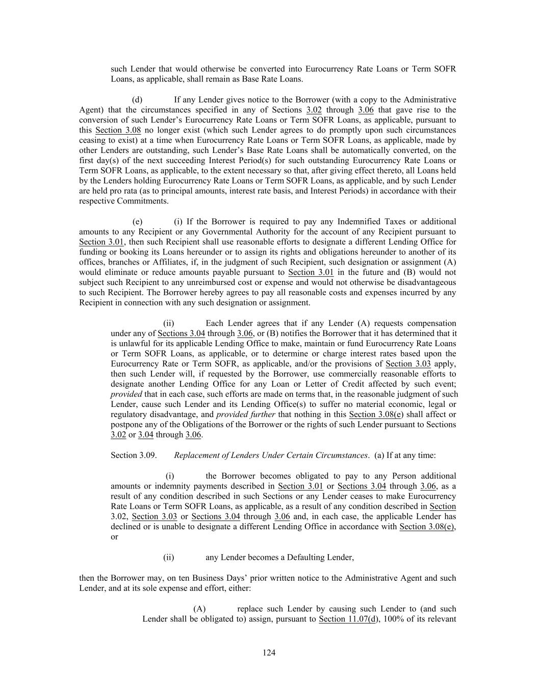 such Lender that would otherwise be converted into Eurocurrency Rate Loans or Term SOFR Loans, as applicable, shall remain as Base Rate Loans. (d) If any Lender gives notice to the Borrower (with a copy to the Administrative Agent) that the circumstances specified in any of Sections 3.02 through 3.06 that gave rise to the conversion of such Lender’s Eurocurrency Rate Loans or Term SOFR Loans, as applicable, pursuant to this Section 3.08 no longer exist (which such Lender agrees to do promptly upon such circumstances ceasing to exist) at a time when Eurocurrency Rate Loans or Term SOFR Loans, as applicable, made by other Lenders are outstanding, such Lender’s Base Rate Loans shall be automatically converted, on the first day(s) of the next succeeding Interest Period(s) for such outstanding Eurocurrency Rate Loans or Term SOFR Loans, as applicable, to the extent necessary so that, after giving effect thereto, all Loans held by the Lenders holding Eurocurrency Rate Loans or Term SOFR Loans, as applicable, and by such Lender are held pro rata (as to principal amounts, interest rate basis, and Interest Periods) in accordance with their respective Commitments. (e) (i) If the Borrower is required to pay any Indemnified Taxes or additional amounts to any Recipient or any Governmental Authority for the account of any Recipient pursuant to Section 3.01, then such Recipient shall use reasonable efforts to designate a different Lending Office for funding or booking its Loans hereunder or to assign its rights and obligations hereunder to another of its offices, branches or Affiliates, if, in the judgment of such Recipient, such designation or assignment (A) would eliminate or reduce amounts payable pursuant to Section 3.01 in the future and (B) would not subject such Recipient to any unreimbursed cost or expense and would not otherwise be disadvantageous to such Recipient. The Borrower hereby agrees to pay all reasonable costs and expenses incurred by any Recipient in connection with any such designation or assignment. (ii) Each Lender agrees that if any Lender (A) requests compensation under any of Sections 3.04 through 3.06, or (B) notifies the Borrower that it has determined that it is unlawful for its applicable Lending Office to make, maintain or fund Eurocurrency Rate Loans or Term SOFR Loans, as applicable, or to determine or charge interest rates based upon the Eurocurrency Rate or Term SOFR, as applicable, and/or the provisions of Section 3.03 apply, then such Lender will, if requested by the Borrower, use commercially reasonable efforts to designate another Lending Office for any Loan or Letter of Credit affected by such event; provided that in each case, such efforts are made on terms that, in the reasonable judgment of such Lender, cause such Lender and its Lending Office(s) to suffer no material economic, legal or regulatory disadvantage, and provided further that nothing in this Section 3.08(e) shall affect or postpone any of the Obligations of the Borrower or the rights of such Lender pursuant to Sections 3.02 or 3.04 through 3.06. Section 3.09. Replacement of Lenders Under Certain Circumstances. (a) If at any time: (i) the Borrower becomes obligated to pay to any Person additional amounts or indemnity payments described in Section 3.01 or Sections 3.04 through 3.06, as a result of any condition described in such Sections or any Lender ceases to make Eurocurrency Rate Loans or Term SOFR Loans, as applicable, as a result of any condition described in Section 3.02, Section 3.03 or Sections 3.04 through 3.06 and, in each case, the applicable Lender has declined or is unable to designate a different Lending Office in accordance with Section 3.08(e), or (ii) any Lender becomes a Defaulting Lender, then the Borrower may, on ten Business Days’ prior written notice to the Administrative Agent and such Lender, and at its sole expense and effort, either: (A) replace such Lender by causing such Lender to (and such Lender shall be obligated to) assign, pursuant to Section 11.07(d), 100% of its relevant 124