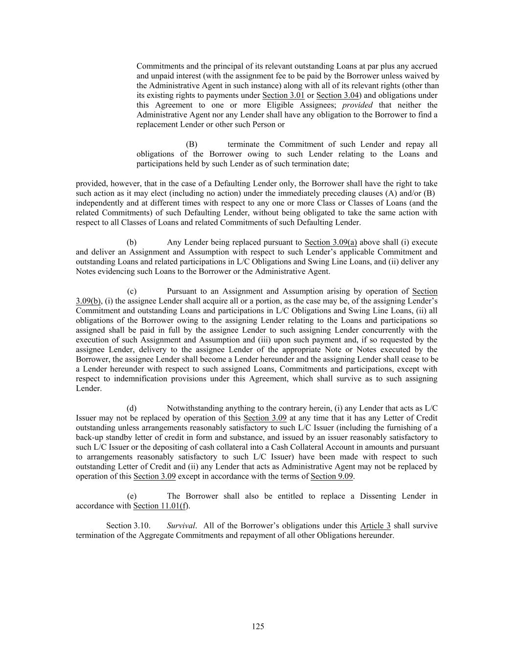 Commitments and the principal of its relevant outstanding Loans at par plus any accrued and unpaid interest (with the assignment fee to be paid by the Borrower unless waived by the Administrative Agent in such instance) along with all of its relevant rights (other than its existing rights to payments under Section 3.01 or Section 3.04) and obligations under this Agreement to one or more Eligible Assignees; provided that neither the Administrative Agent nor any Lender shall have any obligation to the Borrower to find a replacement Lender or other such Person or (B) terminate the Commitment of such Lender and repay all obligations of the Borrower owing to such Lender relating to the Loans and participations held by such Lender as of such termination date; provided, however, that in the case of a Defaulting Lender only, the Borrower shall have the right to take such action as it may elect (including no action) under the immediately preceding clauses (A) and/or (B) independently and at different times with respect to any one or more Class or Classes of Loans (and the related Commitments) of such Defaulting Lender, without being obligated to take the same action with respect to all Classes of Loans and related Commitments of such Defaulting Lender. (b) Any Lender being replaced pursuant to Section 3.09(a) above shall (i) execute and deliver an Assignment and Assumption with respect to such Lender’s applicable Commitment and outstanding Loans and related participations in L/C Obligations and Swing Line Loans, and (ii) deliver any Notes evidencing such Loans to the Borrower or the Administrative Agent. (c) Pursuant to an Assignment and Assumption arising by operation of Section 3.09(b), (i) the assignee Lender shall acquire all or a portion, as the case may be, of the assigning Lender’s Commitment and outstanding Loans and participations in L/C Obligations and Swing Line Loans, (ii) all obligations of the Borrower owing to the assigning Lender relating to the Loans and participations so assigned shall be paid in full by the assignee Lender to such assigning Lender concurrently with the execution of such Assignment and Assumption and (iii) upon such payment and, if so requested by the assignee Lender, delivery to the assignee Lender of the appropriate Note or Notes executed by the Borrower, the assignee Lender shall become a Lender hereunder and the assigning Lender shall cease to be a Lender hereunder with respect to such assigned Loans, Commitments and participations, except with respect to indemnification provisions under this Agreement, which shall survive as to such assigning Lender. (d) Notwithstanding anything to the contrary herein, (i) any Lender that acts as L/C Issuer may not be replaced by operation of this Section 3.09 at any time that it has any Letter of Credit outstanding unless arrangements reasonably satisfactory to such L/C Issuer (including the furnishing of a back-up standby letter of credit in form and substance, and issued by an issuer reasonably satisfactory to such L/C Issuer or the depositing of cash collateral into a Cash Collateral Account in amounts and pursuant to arrangements reasonably satisfactory to such L/C Issuer) have been made with respect to such outstanding Letter of Credit and (ii) any Lender that acts as Administrative Agent may not be replaced by operation of this Section 3.09 except in accordance with the terms of Section 9.09. (e) The Borrower shall also be entitled to replace a Dissenting Lender in accordance with Section 11.01(f). Section 3.10. Survival. All of the Borrower’s obligations under this Article 3 shall survive termination of the Aggregate Commitments and repayment of all other Obligations hereunder. 125