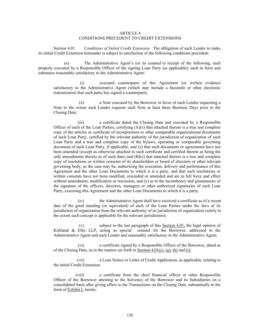 ARTICLE 4 CONDITIONS PRECEDENT TO CREDIT EXTENSIONS Section 4.01. Conditions of Initial Credit Extension. The obligation of each Lender to make its initial Credit Extension hereunder is subject to satisfaction of the following conditions precedent: (a) The Administrative Agent’s (or its counsel’s) receipt of the following, each properly executed by a Responsible Officer of the signing Loan Party (as applicable), each in form and substance reasonably satisfactory to the Administrative Agent: (i) executed counterparts of this Agreement (or written evidence satisfactory to the Administrative Agent (which may include a facsimile or other electronic transmission) that such party has signed a counterpart); (ii) a Note executed by the Borrower in favor of each Lender requesting a Note to the extent such Lender requests such Note at least three Business Days prior to the Closing Date; (iii) a certificate dated the Closing Date and executed by a Responsible Officer of each of the Loan Parties, certifying (A)(x) that attached thereto is a true and complete copy of the articles or certificate of incorporation or other comparable organizational documents of such Loan Party, certified by the relevant authority of the jurisdiction of organization of such Loan Party and a true and complete copy of the bylaws, operating or comparable governing document of such Loan Party, if applicable, and (y) that such documents or agreements have not been amended (except as otherwise attached to such certificate and certified therein as being the only amendments thereto as of such date) and (B)(x) that attached thereto is a true and complete copy of resolutions or written consents of its shareholders or board of directors or other relevant governing body, as the case may be, authorizing the execution, delivery and performance of this Agreement and the other Loan Documents to which it is a party, and that such resolutions or written consents have not been modified, rescinded or amended and are in full force and effect without amendment, modification or rescission, and (y) as to the incumbency and genuineness of the signature of the officers, directors, managers or other authorized signatories of each Loan Party, executing this Agreement and the other Loan Documents to which it is a party. (iv) the Administrative Agent shall have received a certificate as of a recent date of the good standing (or equivalent) of each of the Loan Parties under the laws of its jurisdiction of organization from the relevant authority of its jurisdiction of organization (solely to the extent such concept is applicable for the relevant jurisdiction); (v) subject to the last paragraph of this Section 4.01, the legal opinion of Kirkland & Ellis LLP, acting as special counsel for the Borrower, addressed to the Administrative Agent and each Lender and reasonably satisfactory to the Administrative Agent; (vi) a certificate signed by a Responsible Officer of the Borrower, dated as of the Closing Date, as to the matters set forth in Section 4.01(c), (g), (h) and (i); (vii) a Loan Notice or Letter of Credit Application, as applicable, relating to the initial Credit Extension; (viii) a certificate from the chief financial officer or other Responsible Officer of the Borrower attesting to the Solvency of the Borrower and its Subsidiaries on a consolidated basis after giving effect to the Transactions on the Closing Date, substantially in the form of Exhibit L hereto; 126