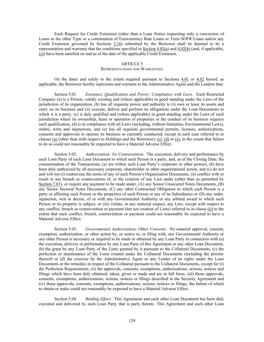 Each Request for Credit Extension (other than a Loan Notice requesting only a conversion of Loans to the other Type or a continuation of Eurocurrency Rate Loans or Term SOFR Loans and/or any Credit Extension governed by Sections 2.16) submitted by the Borrower shall be deemed to be a representation and warranty that the conditions specified in Section 4.02(a) and 4.02(b) (and, if applicable, (c)) have been satisfied on and as of the date of the applicable Credit Extension. ARTICLE 5 REPRESENTATIONS AND WARRANTIES On the dates and solely to the extent required pursuant to Sections 4.01 or 4.02 hereof, as applicable, the Borrower hereby represents and warrants to the Administrative Agent and the Lenders that: Section 5.01. Existence, Qualification and Power; Compliance with Laws. Each Restricted Company (a) is a Person, validly existing and (where applicable) in good standing under the Laws of the jurisdiction of its organization, (b) has all requisite power and authority to (i) own or lease its assets and carry on its business and (ii) execute, deliver and perform its obligations under the Loan Documents to which it is a party, (c) is duly qualified and (where applicable) in good standing under the Laws of each jurisdiction where its ownership, lease or operation of properties or the conduct of its business requires such qualification, (d) is in compliance with all Laws (including, without limitation, Environmental Laws), orders, writs and injunctions, and (e) has all requisite governmental permits, licenses, authorizations, consents and approvals to operate its business as currently conducted; except in each case referred to in clauses (a) (other than with respect to Holdings and the Borrower), (c), (d) or (e), to the extent that failure to do so could not reasonably be expected to have a Material Adverse Effect. Section 5.02. Authorization; No Contravention. The execution, delivery and performance by each Loan Party of each Loan Document to which such Person is a party, and, as of the Closing Date, the consummation of the Transactions, (a) are within such Loan Party’s corporate or other powers, (b) have been duly authorized by all necessary corporate, shareholder or other organizational action, and (c) do not and will not (i) contravene the terms of any of such Person’s Organization Documents, (ii) conflict with or result in any breach or contravention of, or the creation of any Lien under (other than as permitted by Section 7.01), or require any payment to be made under, (A) any Senior Unsecured Notes Documents, (B) any Senior Secured Notes Documents, (C) any other Contractual Obligation to which such Person is a party or affecting such Person or the properties of such Person or any of its Subsidiaries or (D) any order, injunction, writ or decree, of or with any Governmental Authority or any arbitral award to which such Person or its property is subject, or (iii) violate, in any material respect, any Law; except with respect to any conflict, breach or contravention or payment (but not creation of Liens) referred to in clause (ii) to the extent that such conflict, breach, contravention or payment could not reasonably be expected to have a Material Adverse Effect. Section 5.03. Governmental Authorization; Other Consents. No material approval, consent, exemption, authorization, or other action by, or notice to, or filing with, any Governmental Authority or any other Person is necessary or required to be made or obtained by any Loan Party in connection with (a) the execution, delivery or performance by any Loan Party of this Agreement or any other Loan Document, (b) the grant by any Loan Party of the Liens granted by it pursuant to the Collateral Documents, (c) the perfection or maintenance of the Liens created under the Collateral Documents (including the priority thereof) or (d) the exercise by the Administrative Agent or any Lender of its rights under the Loan Documents or the remedies in respect of the Collateral pursuant to the Collateral Documents, except for (i) the Perfection Requirements, (ii) the approvals, consents, exemptions, authorizations, actions, notices and filings which have been duly obtained, taken, given or made and are in full force, (iii) those approvals, consents, exemptions, authorizations, actions, notices or filings described in the Security Agreement and (iv) those approvals, consents, exemptions, authorizations, actions, notices or filings, the failure of which to obtain or make could not reasonably be expected to have a Material Adverse Effect. Section 5.04. Binding Effect. This Agreement and each other Loan Document has been duly executed and delivered by each Loan Party that is party thereto. This Agreement and each other Loan 129