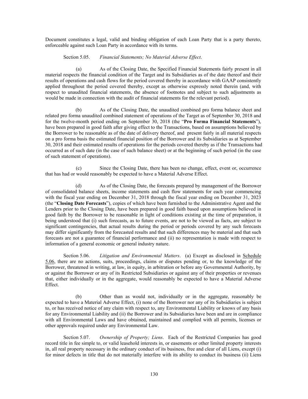 Document constitutes a legal, valid and binding obligation of each Loan Party that is a party thereto, enforceable against such Loan Party in accordance with its terms. Section 5.05. Financial Statements; No Material Adverse Effect. (a) As of the Closing Date, the Specified Financial Statements fairly present in all material respects the financial condition of the Target and its Subsidiaries as of the date thereof and their results of operations and cash flows for the period covered thereby in accordance with GAAP consistently applied throughout the period covered thereby, except as otherwise expressly noted therein (and, with respect to unaudited financial statements, the absence of footnotes and subject to such adjustments as would be made in connection with the audit of financial statements for the relevant period). (b) As of the Closing Date, the unaudited combined pro forma balance sheet and related pro forma unaudited combined statement of operations of the Target as of September 30, 2018 and for the twelve-month period ending on September 30, 2018 (the “Pro Forma Financial Statements”), have been prepared in good faith after giving effect to the Transactions, based on assumptions believed by the Borrower to be reasonable as of the date of delivery thereof, and present fairly in all material respects on a pro forma basis the estimated financial position of the Borrower and its Subsidiaries as at September 30, 2018 and their estimated results of operations for the periods covered thereby as if the Transactions had occurred as of such date (in the case of such balance sheet) or at the beginning of such period (in the case of such statement of operations). (c) Since the Closing Date, there has been no change, effect, event or, occurrence that has had or would reasonably be expected to have a Material Adverse Effect. (d) As of the Closing Date, the forecasts prepared by management of the Borrower of consolidated balance sheets, income statements and cash flow statements for each year commencing with the fiscal year ending on December 31, 2018 through the fiscal year ending on December 31, 2023 (the “Closing Date Forecasts”), copies of which have been furnished to the Administrative Agent and the Lenders prior to the Closing Date, have been prepared in good faith based upon assumptions believed in good faith by the Borrower to be reasonable in light of conditions existing at the time of preparation, it being understood that (i) such forecasts, as to future events, are not to be viewed as facts, are subject to significant contingencies, that actual results during the period or periods covered by any such forecasts may differ significantly from the forecasted results and that such differences may be material and that such forecasts are not a guarantee of financial performance and (ii) no representation is made with respect to information of a general economic or general industry nature. Section 5.06. Litigation and Environmental Matters. (a) Except as disclosed in Schedule 5.06, there are no actions, suits, proceedings, claims or disputes pending or, to the knowledge of the Borrower, threatened in writing, at law, in equity, in arbitration or before any Governmental Authority, by or against the Borrower or any of its Restricted Subsidiaries or against any of their properties or revenues that, either individually or in the aggregate, would reasonably be expected to have a Material Adverse Effect. (b) Other than as would not, individually or in the aggregate, reasonably be expected to have a Material Adverse Effect, (i) none of the Borrower nor any of its Subsidiaries is subject to, or has received notice of any claim with respect to, any Environmental Liability or knows of any basis for any Environmental Liability and (ii) the Borrower and its Subsidiaries have been and are in compliance with all Environmental Laws and have obtained, maintained and complied with all permits, licenses or other approvals required under any Environmental Law. Section 5.07. Ownership of Property; Liens. Each of the Restricted Companies has good record title in fee simple to, or valid leasehold interests in, or easements or other limited property interests in, all real property necessary in the ordinary conduct of its business, free and clear of all Liens, except (i) for minor defects in title that do not materially interfere with its ability to conduct its business (ii) Liens 130