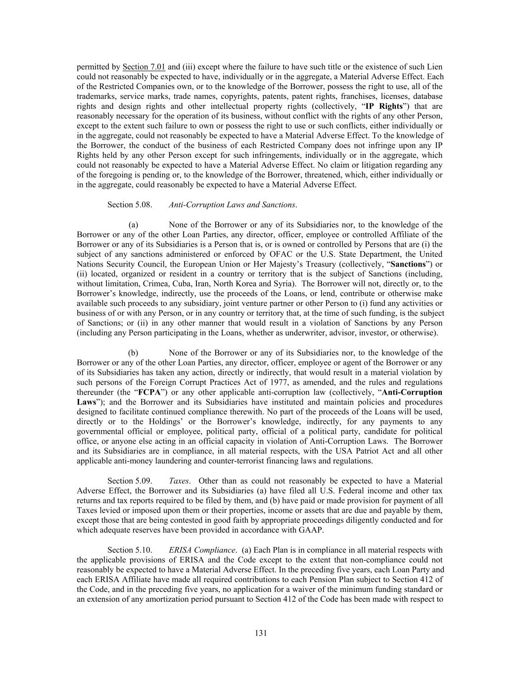 permitted by Section 7.01 and (iii) except where the failure to have such title or the existence of such Lien could not reasonably be expected to have, individually or in the aggregate, a Material Adverse Effect. Each of the Restricted Companies own, or to the knowledge of the Borrower, possess the right to use, all of the trademarks, service marks, trade names, copyrights, patents, patent rights, franchises, licenses, database rights and design rights and other intellectual property rights (collectively, “IP Rights”) that are reasonably necessary for the operation of its business, without conflict with the rights of any other Person, except to the extent such failure to own or possess the right to use or such conflicts, either individually or in the aggregate, could not reasonably be expected to have a Material Adverse Effect. To the knowledge of the Borrower, the conduct of the business of each Restricted Company does not infringe upon any IP Rights held by any other Person except for such infringements, individually or in the aggregate, which could not reasonably be expected to have a Material Adverse Effect. No claim or litigation regarding any of the foregoing is pending or, to the knowledge of the Borrower, threatened, which, either individually or in the aggregate, could reasonably be expected to have a Material Adverse Effect. Section 5.08. Anti-Corruption Laws and Sanctions. (a) None of the Borrower or any of its Subsidiaries nor, to the knowledge of the Borrower or any of the other Loan Parties, any director, officer, employee or controlled Affiliate of the Borrower or any of its Subsidiaries is a Person that is, or is owned or controlled by Persons that are (i) the subject of any sanctions administered or enforced by OFAC or the U.S. State Department, the United Nations Security Council, the European Union or Her Majesty’s Treasury (collectively, “Sanctions”) or (ii) located, organized or resident in a country or territory that is the subject of Sanctions (including, without limitation, Crimea, Cuba, Iran, North Korea and Syria). The Borrower will not, directly or, to the Borrower’s knowledge, indirectly, use the proceeds of the Loans, or lend, contribute or otherwise make available such proceeds to any subsidiary, joint venture partner or other Person to (i) fund any activities or business of or with any Person, or in any country or territory that, at the time of such funding, is the subject of Sanctions; or (ii) in any other manner that would result in a violation of Sanctions by any Person (including any Person participating in the Loans, whether as underwriter, advisor, investor, or otherwise). (b) None of the Borrower or any of its Subsidiaries nor, to the knowledge of the Borrower or any of the other Loan Parties, any director, officer, employee or agent of the Borrower or any of its Subsidiaries has taken any action, directly or indirectly, that would result in a material violation by such persons of the Foreign Corrupt Practices Act of 1977, as amended, and the rules and regulations thereunder (the “FCPA”) or any other applicable anti-corruption law (collectively, “Anti-Corruption Laws”); and the Borrower and its Subsidiaries have instituted and maintain policies and procedures designed to facilitate continued compliance therewith. No part of the proceeds of the Loans will be used, directly or to the Holdings’ or the Borrower’s knowledge, indirectly, for any payments to any governmental official or employee, political party, official of a political party, candidate for political office, or anyone else acting in an official capacity in violation of Anti-Corruption Laws. The Borrower and its Subsidiaries are in compliance, in all material respects, with the USA Patriot Act and all other applicable anti-money laundering and counter-terrorist financing laws and regulations. Section 5.09. Taxes. Other than as could not reasonably be expected to have a Material Adverse Effect, the Borrower and its Subsidiaries (a) have filed all U.S. Federal income and other tax returns and tax reports required to be filed by them, and (b) have paid or made provision for payment of all Taxes levied or imposed upon them or their properties, income or assets that are due and payable by them, except those that are being contested in good faith by appropriate proceedings diligently conducted and for which adequate reserves have been provided in accordance with GAAP. Section 5.10. ERISA Compliance. (a) Each Plan is in compliance in all material respects with the applicable provisions of ERISA and the Code except to the extent that non-compliance could not reasonably be expected to have a Material Adverse Effect. In the preceding five years, each Loan Party and each ERISA Affiliate have made all required contributions to each Pension Plan subject to Section 412 of the Code, and in the preceding five years, no application for a waiver of the minimum funding standard or an extension of any amortization period pursuant to Section 412 of the Code has been made with respect to 131