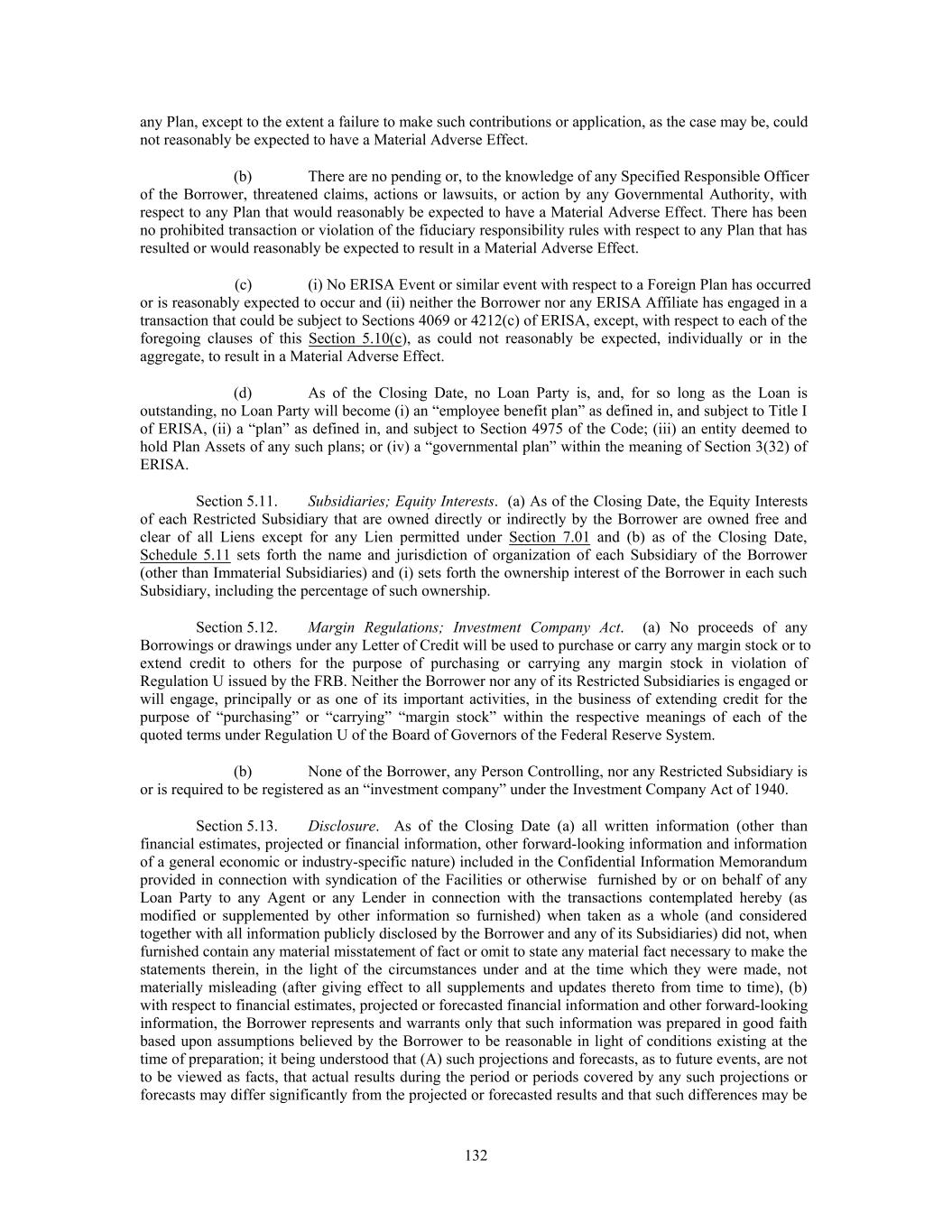 any Plan, except to the extent a failure to make such contributions or application, as the case may be, could not reasonably be expected to have a Material Adverse Effect. (b) There are no pending or, to the knowledge of any Specified Responsible Officer of the Borrower, threatened claims, actions or lawsuits, or action by any Governmental Authority, with respect to any Plan that would reasonably be expected to have a Material Adverse Effect. There has been no prohibited transaction or violation of the fiduciary responsibility rules with respect to any Plan that has resulted or would reasonably be expected to result in a Material Adverse Effect. (c) (i) No ERISA Event or similar event with respect to a Foreign Plan has occurred or is reasonably expected to occur and (ii) neither the Borrower nor any ERISA Affiliate has engaged in a transaction that could be subject to Sections 4069 or 4212(c) of ERISA, except, with respect to each of the foregoing clauses of this Section 5.10(c), as could not reasonably be expected, individually or in the aggregate, to result in a Material Adverse Effect. (d) As of the Closing Date, no Loan Party is, and, for so long as the Loan is outstanding, no Loan Party will become (i) an “employee benefit plan” as defined in, and subject to Title I of ERISA, (ii) a “plan” as defined in, and subject to Section 4975 of the Code; (iii) an entity deemed to hold Plan Assets of any such plans; or (iv) a “governmental plan” within the meaning of Section 3(32) of ERISA. Section 5.11. Subsidiaries; Equity Interests. (a) As of the Closing Date, the Equity Interests of each Restricted Subsidiary that are owned directly or indirectly by the Borrower are owned free and clear of all Liens except for any Lien permitted under Section 7.01 and (b) as of the Closing Date, Schedule 5.11 sets forth the name and jurisdiction of organization of each Subsidiary of the Borrower (other than Immaterial Subsidiaries) and (i) sets forth the ownership interest of the Borrower in each such Subsidiary, including the percentage of such ownership. Section 5.12. Margin Regulations; Investment Company Act. (a) No proceeds of any Borrowings or drawings under any Letter of Credit will be used to purchase or carry any margin stock or to extend credit to others for the purpose of purchasing or carrying any margin stock in violation of Regulation U issued by the FRB. Neither the Borrower nor any of its Restricted Subsidiaries is engaged or will engage, principally or as one of its important activities, in the business of extending credit for the purpose of “purchasing” or “carrying” “margin stock” within the respective meanings of each of the quoted terms under Regulation U of the Board of Governors of the Federal Reserve System. (b) None of the Borrower, any Person Controlling, nor any Restricted Subsidiary is or is required to be registered as an “investment company” under the Investment Company Act of 1940. Section 5.13. Disclosure. As of the Closing Date (a) all written information (other than financial estimates, projected or financial information, other forward-looking information and information of a general economic or industry-specific nature) included in the Confidential Information Memorandum provided in connection with syndication of the Facilities or otherwise furnished by or on behalf of any Loan Party to any Agent or any Lender in connection with the transactions contemplated hereby (as modified or supplemented by other information so furnished) when taken as a whole (and considered together with all information publicly disclosed by the Borrower and any of its Subsidiaries) did not, when furnished contain any material misstatement of fact or omit to state any material fact necessary to make the statements therein, in the light of the circumstances under and at the time which they were made, not materially misleading (after giving effect to all supplements and updates thereto from time to time), (b) with respect to financial estimates, projected or forecasted financial information and other forward-looking information, the Borrower represents and warrants only that such information was prepared in good faith based upon assumptions believed by the Borrower to be reasonable in light of conditions existing at the time of preparation; it being understood that (A) such projections and forecasts, as to future events, are not to be viewed as facts, that actual results during the period or periods covered by any such projections or forecasts may differ significantly from the projected or forecasted results and that such differences may be 132