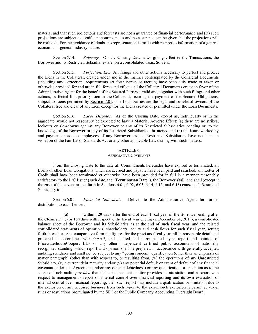 material and that such projections and forecasts are not a guarantee of financial performance and (B) such projections are subject to significant contingencies and no assurance can be given that the projections will be realized. For the avoidance of doubt, no representation is made with respect to information of a general economic or general industry nature. Section 5.14. Solvency. On the Closing Date, after giving effect to the Transactions, the Borrower and its Restricted Subsidiaries are, on a consolidated basis, Solvent. Section 5.15. Perfection, Etc. All filings and other actions necessary to perfect and protect the Liens in the Collateral, created under and in the manner contemplated by the Collateral Documents (including any Perfection Requirements set forth herein or therein) have been duly made or taken or otherwise provided for and are in full force and effect, and the Collateral Documents create in favor of the Administrative Agent for the benefit of the Secured Parties a valid and, together with such filings and other actions, perfected first priority Lien in the Collateral, securing the payment of the Secured Obligations, subject to Liens permitted by Section 7.01. The Loan Parties are the legal and beneficial owners of the Collateral free and clear of any Lien, except for the Liens created or permitted under the Loan Documents. Section 5.16. Labor Disputes. As of the Closing Date, except as, individually or in the aggregate, would not reasonably be expected to have a Material Adverse Effect: (a) there are no strikes, lockouts or slowdowns against any Borrower or any of its Restricted Subsidiaries pending or, to the knowledge of the Borrower or any of its Restricted Subsidiaries, threatened and (b) the hours worked by and payments made to employees of any Borrower and its Restricted Subsidiaries have not been in violation of the Fair Labor Standards Act or any other applicable Law dealing with such matters. ARTICLE 6 AFFIRMATIVE COVENANTS From the Closing Date to the date all Commitments hereunder have expired or terminated, all Loans or other Loan Obligations which are accrued and payable have been paid and satisfied, any Letter of Credit shall have been terminated or otherwise have been provided for in full in a manner reasonably satisfactory to the L/C Issuer (such date, the “Termination Date”), the Borrower shall, and shall (except in the case of the covenants set forth in Sections 6.01, 6.02, 6.03, 6.14, 6.15, and 6.18) cause each Restricted Subsidiary to: Section 6.01. Financial Statements. Deliver to the Administrative Agent for further distribution to each Lender: (a) within 120 days after the end of each fiscal year of the Borrower ending after the Closing Date (or 150 days with respect to the fiscal year ending on December 31, 2019), a consolidated balance sheet of the Borrower and its Subsidiaries as at the end of such fiscal year, and the related consolidated statements of operations, shareholders’ equity and cash flows for such fiscal year, setting forth in each case in comparative form the figures for the previous fiscal year, all in reasonable detail and prepared in accordance with GAAP, and audited and accompanied by a report and opinion of PricewaterhouseCoopers LLP or any other independent certified public accountant of nationally recognized standing, which report and opinion shall be prepared in accordance with generally accepted auditing standards and shall not be subject to any “going concern” qualification (other than an emphasis of matter paragraph) (other than with respect to, or resulting from, (w) the operations of any Unrestricted Subsidiary, (x) a current debt maturity and/or (y) any potential default or event of default of any financial covenant under this Agreement and/or any other Indebtedness) or any qualification or exception as to the scope of such audit; provided that if the independent auditor provides an attestation and a report with respect to management’s report on internal control over financial reporting and its own evaluation of internal control over financial reporting, then such report may include a qualification or limitation due to the exclusion of any acquired business from such report to the extent such exclusion is permitted under rules or regulations promulgated by the SEC or the Public Company Accounting Oversight Board; 133