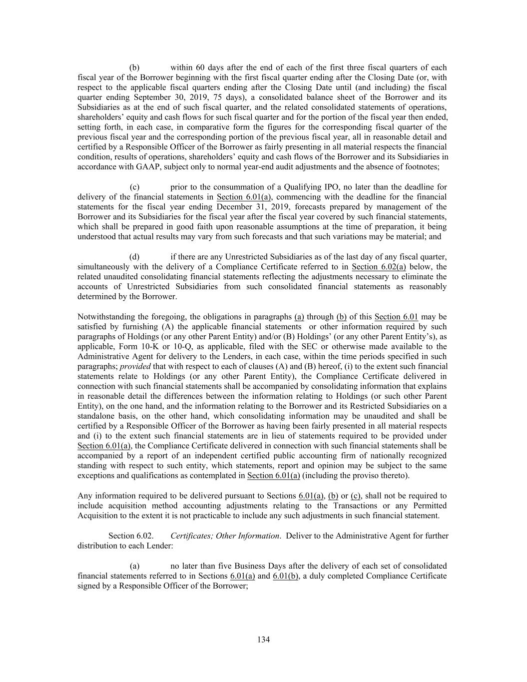(b) within 60 days after the end of each of the first three fiscal quarters of each fiscal year of the Borrower beginning with the first fiscal quarter ending after the Closing Date (or, with respect to the applicable fiscal quarters ending after the Closing Date until (and including) the fiscal quarter ending September 30, 2019, 75 days), a consolidated balance sheet of the Borrower and its Subsidiaries as at the end of such fiscal quarter, and the related consolidated statements of operations, shareholders’ equity and cash flows for such fiscal quarter and for the portion of the fiscal year then ended, setting forth, in each case, in comparative form the figures for the corresponding fiscal quarter of the previous fiscal year and the corresponding portion of the previous fiscal year, all in reasonable detail and certified by a Responsible Officer of the Borrower as fairly presenting in all material respects the financial condition, results of operations, shareholders’ equity and cash flows of the Borrower and its Subsidiaries in accordance with GAAP, subject only to normal year-end audit adjustments and the absence of footnotes; (c) prior to the consummation of a Qualifying IPO, no later than the deadline for delivery of the financial statements in Section 6.01(a), commencing with the deadline for the financial statements for the fiscal year ending December 31, 2019, forecasts prepared by management of the Borrower and its Subsidiaries for the fiscal year after the fiscal year covered by such financial statements, which shall be prepared in good faith upon reasonable assumptions at the time of preparation, it being understood that actual results may vary from such forecasts and that such variations may be material; and (d) if there are any Unrestricted Subsidiaries as of the last day of any fiscal quarter, simultaneously with the delivery of a Compliance Certificate referred to in Section 6.02(a) below, the related unaudited consolidating financial statements reflecting the adjustments necessary to eliminate the accounts of Unrestricted Subsidiaries from such consolidated financial statements as reasonably determined by the Borrower. Notwithstanding the foregoing, the obligations in paragraphs (a) through (b) of this Section 6.01 may be satisfied by furnishing (A) the applicable financial statements or other information required by such paragraphs of Holdings (or any other Parent Entity) and/or (B) Holdings’ (or any other Parent Entity’s), as applicable, Form 10-K or 10-Q, as applicable, filed with the SEC or otherwise made available to the Administrative Agent for delivery to the Lenders, in each case, within the time periods specified in such paragraphs; provided that with respect to each of clauses (A) and (B) hereof, (i) to the extent such financial statements relate to Holdings (or any other Parent Entity), the Compliance Certificate delivered in connection with such financial statements shall be accompanied by consolidating information that explains in reasonable detail the differences between the information relating to Holdings (or such other Parent Entity), on the one hand, and the information relating to the Borrower and its Restricted Subsidiaries on a standalone basis, on the other hand, which consolidating information may be unaudited and shall be certified by a Responsible Officer of the Borrower as having been fairly presented in all material respects and (i) to the extent such financial statements are in lieu of statements required to be provided under Section 6.01(a), the Compliance Certificate delivered in connection with such financial statements shall be accompanied by a report of an independent certified public accounting firm of nationally recognized standing with respect to such entity, which statements, report and opinion may be subject to the same exceptions and qualifications as contemplated in Section 6.01(a) (including the proviso thereto). Any information required to be delivered pursuant to Sections 6.01(a), (b) or (c), shall not be required to include acquisition method accounting adjustments relating to the Transactions or any Permitted Acquisition to the extent it is not practicable to include any such adjustments in such financial statement. Section 6.02. Certificates; Other Information. Deliver to the Administrative Agent for further distribution to each Lender: (a) no later than five Business Days after the delivery of each set of consolidated financial statements referred to in Sections 6.01(a) and 6.01(b), a duly completed Compliance Certificate signed by a Responsible Officer of the Borrower; 134