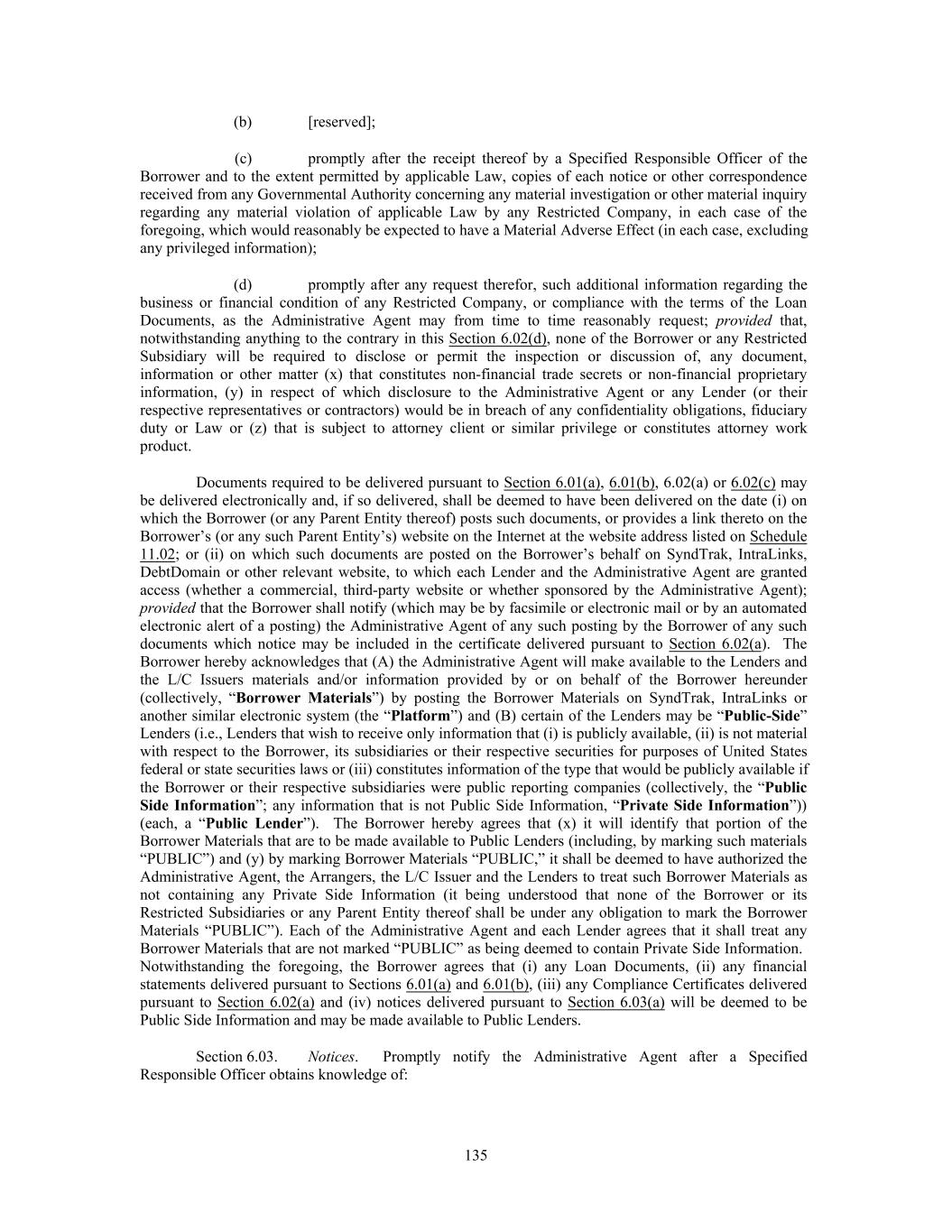 (b) [reserved]; (c) promptly after the receipt thereof by a Specified Responsible Officer of the Borrower and to the extent permitted by applicable Law, copies of each notice or other correspondence received from any Governmental Authority concerning any material investigation or other material inquiry regarding any material violation of applicable Law by any Restricted Company, in each case of the foregoing, which would reasonably be expected to have a Material Adverse Effect (in each case, excluding any privileged information); (d) promptly after any request therefor, such additional information regarding the business or financial condition of any Restricted Company, or compliance with the terms of the Loan Documents, as the Administrative Agent may from time to time reasonably request; provided that, notwithstanding anything to the contrary in this Section 6.02(d), none of the Borrower or any Restricted Subsidiary will be required to disclose or permit the inspection or discussion of, any document, information or other matter (x) that constitutes non-financial trade secrets or non-financial proprietary information, (y) in respect of which disclosure to the Administrative Agent or any Lender (or their respective representatives or contractors) would be in breach of any confidentiality obligations, fiduciary duty or Law or (z) that is subject to attorney client or similar privilege or constitutes attorney work product. Documents required to be delivered pursuant to Section 6.01(a), 6.01(b), 6.02(a) or 6.02(c) may be delivered electronically and, if so delivered, shall be deemed to have been delivered on the date (i) on which the Borrower (or any Parent Entity thereof) posts such documents, or provides a link thereto on the Borrower’s (or any such Parent Entity’s) website on the Internet at the website address listed on Schedule 11.02; or (ii) on which such documents are posted on the Borrower’s behalf on SyndTrak, IntraLinks, DebtDomain or other relevant website, to which each Lender and the Administrative Agent are granted access (whether a commercial, third-party website or whether sponsored by the Administrative Agent); provided that the Borrower shall notify (which may be by facsimile or electronic mail or by an automated electronic alert of a posting) the Administrative Agent of any such posting by the Borrower of any such documents which notice may be included in the certificate delivered pursuant to Section 6.02(a). The Borrower hereby acknowledges that (A) the Administrative Agent will make available to the Lenders and the L/C Issuers materials and/or information provided by or on behalf of the Borrower hereunder (collectively, “Borrower Materials”) by posting the Borrower Materials on SyndTrak, IntraLinks or another similar electronic system (the “Platform”) and (B) certain of the Lenders may be “Public-Side” Lenders (i.e., Lenders that wish to receive only information that (i) is publicly available, (ii) is not material with respect to the Borrower, its subsidiaries or their respective securities for purposes of United States federal or state securities laws or (iii) constitutes information of the type that would be publicly available if the Borrower or their respective subsidiaries were public reporting companies (collectively, the “Public Side Information”; any information that is not Public Side Information, “Private Side Information”)) (each, a “Public Lender”). The Borrower hereby agrees that (x) it will identify that portion of the Borrower Materials that are to be made available to Public Lenders (including, by marking such materials “PUBLIC”) and (y) by marking Borrower Materials “PUBLIC,” it shall be deemed to have authorized the Administrative Agent, the Arrangers, the L/C Issuer and the Lenders to treat such Borrower Materials as not containing any Private Side Information (it being understood that none of the Borrower or its Restricted Subsidiaries or any Parent Entity thereof shall be under any obligation to mark the Borrower Materials “PUBLIC”). Each of the Administrative Agent and each Lender agrees that it shall treat any Borrower Materials that are not marked “PUBLIC” as being deemed to contain Private Side Information. Notwithstanding the foregoing, the Borrower agrees that (i) any Loan Documents, (ii) any financial statements delivered pursuant to Sections 6.01(a) and 6.01(b), (iii) any Compliance Certificates delivered pursuant to Section 6.02(a) and (iv) notices delivered pursuant to Section 6.03(a) will be deemed to be Public Side Information and may be made available to Public Lenders. Section 6.03. Notices. Promptly notify the Administrative Agent after a Specified Responsible Officer obtains knowledge of: 135