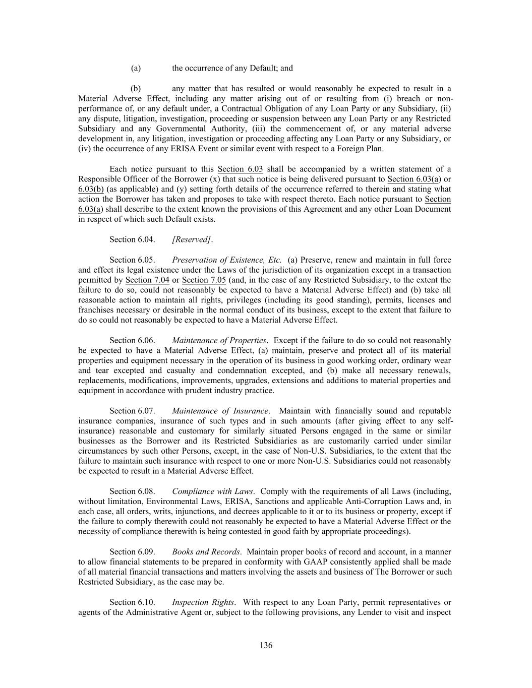 (a) the occurrence of any Default; and (b) any matter that has resulted or would reasonably be expected to result in a Material Adverse Effect, including any matter arising out of or resulting from (i) breach or non- performance of, or any default under, a Contractual Obligation of any Loan Party or any Subsidiary, (ii) any dispute, litigation, investigation, proceeding or suspension between any Loan Party or any Restricted Subsidiary and any Governmental Authority, (iii) the commencement of, or any material adverse development in, any litigation, investigation or proceeding affecting any Loan Party or any Subsidiary, or (iv) the occurrence of any ERISA Event or similar event with respect to a Foreign Plan. Each notice pursuant to this Section 6.03 shall be accompanied by a written statement of a Responsible Officer of the Borrower (x) that such notice is being delivered pursuant to Section 6.03(a) or 6.03(b) (as applicable) and (y) setting forth details of the occurrence referred to therein and stating what action the Borrower has taken and proposes to take with respect thereto. Each notice pursuant to Section 6.03(a) shall describe to the extent known the provisions of this Agreement and any other Loan Document in respect of which such Default exists. Section 6.04. [Reserved]. Section 6.05. Preservation of Existence, Etc. (a) Preserve, renew and maintain in full force and effect its legal existence under the Laws of the jurisdiction of its organization except in a transaction permitted by Section 7.04 or Section 7.05 (and, in the case of any Restricted Subsidiary, to the extent the failure to do so, could not reasonably be expected to have a Material Adverse Effect) and (b) take all reasonable action to maintain all rights, privileges (including its good standing), permits, licenses and franchises necessary or desirable in the normal conduct of its business, except to the extent that failure to do so could not reasonably be expected to have a Material Adverse Effect. Section 6.06. Maintenance of Properties. Except if the failure to do so could not reasonably be expected to have a Material Adverse Effect, (a) maintain, preserve and protect all of its material properties and equipment necessary in the operation of its business in good working order, ordinary wear and tear excepted and casualty and condemnation excepted, and (b) make all necessary renewals, replacements, modifications, improvements, upgrades, extensions and additions to material properties and equipment in accordance with prudent industry practice. Section 6.07. Maintenance of Insurance. Maintain with financially sound and reputable insurance companies, insurance of such types and in such amounts (after giving effect to any self- insurance) reasonable and customary for similarly situated Persons engaged in the same or similar businesses as the Borrower and its Restricted Subsidiaries as are customarily carried under similar circumstances by such other Persons, except, in the case of Non-U.S. Subsidiaries, to the extent that the failure to maintain such insurance with respect to one or more Non-U.S. Subsidiaries could not reasonably be expected to result in a Material Adverse Effect. Section 6.08. Compliance with Laws. Comply with the requirements of all Laws (including, without limitation, Environmental Laws, ERISA, Sanctions and applicable Anti-Corruption Laws and, in each case, all orders, writs, injunctions, and decrees applicable to it or to its business or property, except if the failure to comply therewith could not reasonably be expected to have a Material Adverse Effect or the necessity of compliance therewith is being contested in good faith by appropriate proceedings). Section 6.09. Books and Records. Maintain proper books of record and account, in a manner to allow financial statements to be prepared in conformity with GAAP consistently applied shall be made of all material financial transactions and matters involving the assets and business of The Borrower or such Restricted Subsidiary, as the case may be. Section 6.10. Inspection Rights. With respect to any Loan Party, permit representatives or agents of the Administrative Agent or, subject to the following provisions, any Lender to visit and inspect 136