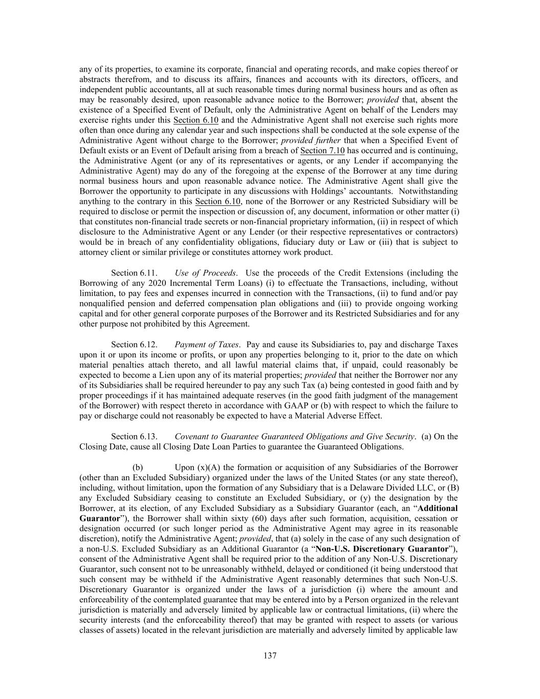any of its properties, to examine its corporate, financial and operating records, and make copies thereof or abstracts therefrom, and to discuss its affairs, finances and accounts with its directors, officers, and independent public accountants, all at such reasonable times during normal business hours and as often as may be reasonably desired, upon reasonable advance notice to the Borrower; provided that, absent the existence of a Specified Event of Default, only the Administrative Agent on behalf of the Lenders may exercise rights under this Section 6.10 and the Administrative Agent shall not exercise such rights more often than once during any calendar year and such inspections shall be conducted at the sole expense of the Administrative Agent without charge to the Borrower; provided further that when a Specified Event of Default exists or an Event of Default arising from a breach of Section 7.10 has occurred and is continuing, the Administrative Agent (or any of its representatives or agents, or any Lender if accompanying the Administrative Agent) may do any of the foregoing at the expense of the Borrower at any time during normal business hours and upon reasonable advance notice. The Administrative Agent shall give the Borrower the opportunity to participate in any discussions with Holdings’ accountants. Notwithstanding anything to the contrary in this Section 6.10, none of the Borrower or any Restricted Subsidiary will be required to disclose or permit the inspection or discussion of, any document, information or other matter (i) that constitutes non-financial trade secrets or non-financial proprietary information, (ii) in respect of which disclosure to the Administrative Agent or any Lender (or their respective representatives or contractors) would be in breach of any confidentiality obligations, fiduciary duty or Law or (iii) that is subject to attorney client or similar privilege or constitutes attorney work product. Section 6.11. Use of Proceeds. Use the proceeds of the Credit Extensions (including the Borrowing of any 2020 Incremental Term Loans) (i) to effectuate the Transactions, including, without limitation, to pay fees and expenses incurred in connection with the Transactions, (ii) to fund and/or pay nonqualified pension and deferred compensation plan obligations and (iii) to provide ongoing working capital and for other general corporate purposes of the Borrower and its Restricted Subsidiaries and for any other purpose not prohibited by this Agreement. Section 6.12. Payment of Taxes. Pay and cause its Subsidiaries to, pay and discharge Taxes upon it or upon its income or profits, or upon any properties belonging to it, prior to the date on which material penalties attach thereto, and all lawful material claims that, if unpaid, could reasonably be expected to become a Lien upon any of its material properties; provided that neither the Borrower nor any of its Subsidiaries shall be required hereunder to pay any such Tax (a) being contested in good faith and by proper proceedings if it has maintained adequate reserves (in the good faith judgment of the management of the Borrower) with respect thereto in accordance with GAAP or (b) with respect to which the failure to pay or discharge could not reasonably be expected to have a Material Adverse Effect. Section 6.13. Covenant to Guarantee Guaranteed Obligations and Give Security. (a) On the Closing Date, cause all Closing Date Loan Parties to guarantee the Guaranteed Obligations. (b) Upon (x)(A) the formation or acquisition of any Subsidiaries of the Borrower (other than an Excluded Subsidiary) organized under the laws of the United States (or any state thereof), including, without limitation, upon the formation of any Subsidiary that is a Delaware Divided LLC, or (B) any Excluded Subsidiary ceasing to constitute an Excluded Subsidiary, or (y) the designation by the Borrower, at its election, of any Excluded Subsidiary as a Subsidiary Guarantor (each, an “Additional Guarantor”), the Borrower shall within sixty (60) days after such formation, acquisition, cessation or designation occurred (or such longer period as the Administrative Agent may agree in its reasonable discretion), notify the Administrative Agent; provided, that (a) solely in the case of any such designation of a non-U.S. Excluded Subsidiary as an Additional Guarantor (a “Non-U.S. Discretionary Guarantor”), consent of the Administrative Agent shall be required prior to the addition of any Non-U.S. Discretionary Guarantor, such consent not to be unreasonably withheld, delayed or conditioned (it being understood that such consent may be withheld if the Administrative Agent reasonably determines that such Non-U.S. Discretionary Guarantor is organized under the laws of a jurisdiction (i) where the amount and enforceability of the contemplated guarantee that may be entered into by a Person organized in the relevant jurisdiction is materially and adversely limited by applicable law or contractual limitations, (ii) where the security interests (and the enforceability thereof) that may be granted with respect to assets (or various classes of assets) located in the relevant jurisdiction are materially and adversely limited by applicable law 137
