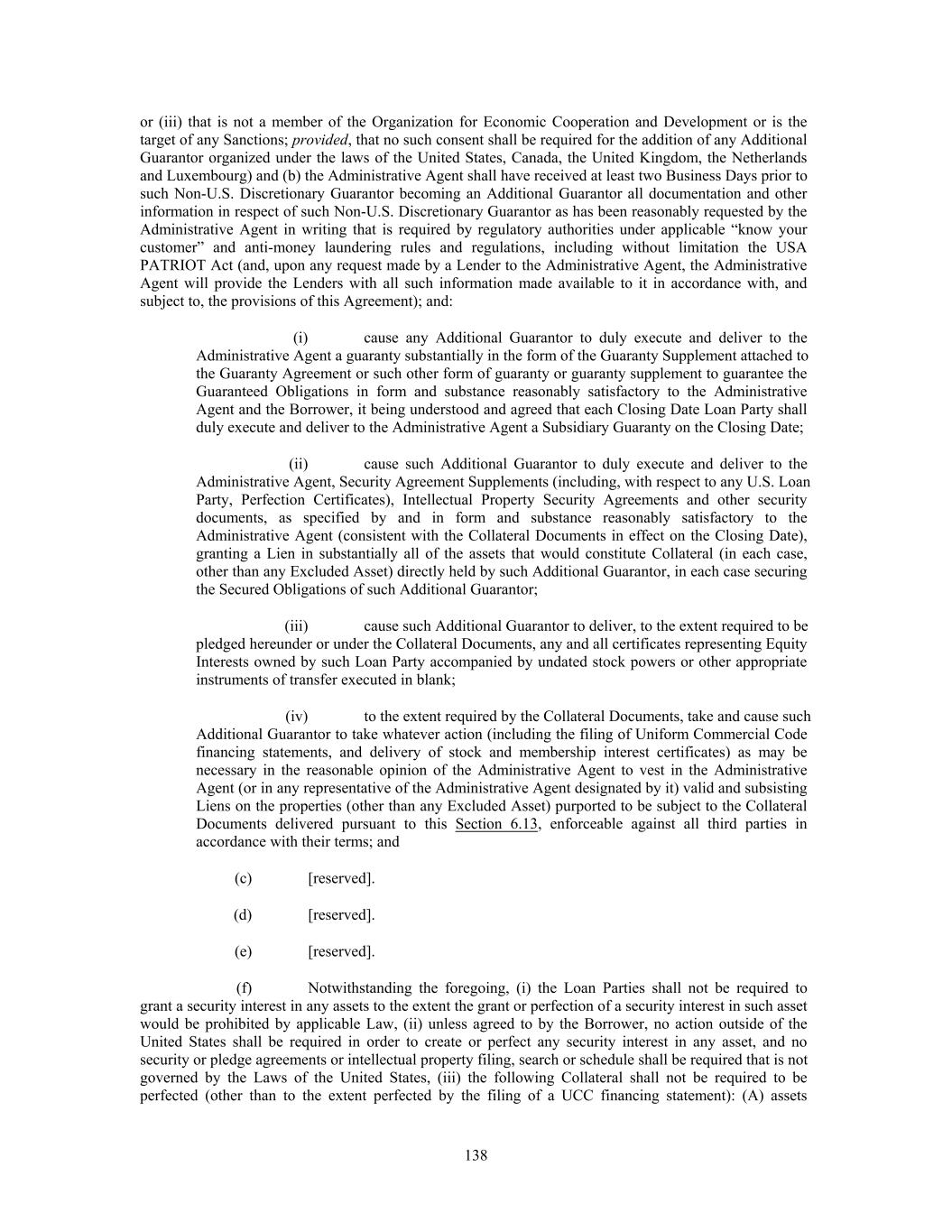 or (iii) that is not a member of the Organization for Economic Cooperation and Development or is the target of any Sanctions; provided, that no such consent shall be required for the addition of any Additional Guarantor organized under the laws of the United States, Canada, the United Kingdom, the Netherlands and Luxembourg) and (b) the Administrative Agent shall have received at least two Business Days prior to such Non-U.S. Discretionary Guarantor becoming an Additional Guarantor all documentation and other information in respect of such Non-U.S. Discretionary Guarantor as has been reasonably requested by the Administrative Agent in writing that is required by regulatory authorities under applicable “know your customer” and anti-money laundering rules and regulations, including without limitation the USA PATRIOT Act (and, upon any request made by a Lender to the Administrative Agent, the Administrative Agent will provide the Lenders with all such information made available to it in accordance with, and subject to, the provisions of this Agreement); and: (i) cause any Additional Guarantor to duly execute and deliver to the Administrative Agent a guaranty substantially in the form of the Guaranty Supplement attached to the Guaranty Agreement or such other form of guaranty or guaranty supplement to guarantee the Guaranteed Obligations in form and substance reasonably satisfactory to the Administrative Agent and the Borrower, it being understood and agreed that each Closing Date Loan Party shall duly execute and deliver to the Administrative Agent a Subsidiary Guaranty on the Closing Date; (ii) cause such Additional Guarantor to duly execute and deliver to the Administrative Agent, Security Agreement Supplements (including, with respect to any U.S. Loan Party, Perfection Certificates), Intellectual Property Security Agreements and other security documents, as specified by and in form and substance reasonably satisfactory to the Administrative Agent (consistent with the Collateral Documents in effect on the Closing Date), granting a Lien in substantially all of the assets that would constitute Collateral (in each case, other than any Excluded Asset) directly held by such Additional Guarantor, in each case securing the Secured Obligations of such Additional Guarantor; (iii) cause such Additional Guarantor to deliver, to the extent required to be pledged hereunder or under the Collateral Documents, any and all certificates representing Equity Interests owned by such Loan Party accompanied by undated stock powers or other appropriate instruments of transfer executed in blank; (iv) to the extent required by the Collateral Documents, take and cause such Additional Guarantor to take whatever action (including the filing of Uniform Commercial Code financing statements, and delivery of stock and membership interest certificates) as may be necessary in the reasonable opinion of the Administrative Agent to vest in the Administrative Agent (or in any representative of the Administrative Agent designated by it) valid and subsisting Liens on the properties (other than any Excluded Asset) purported to be subject to the Collateral Documents delivered pursuant to this Section 6.13, enforceable against all third parties in accordance with their terms; and (c) [reserved]. (d) [reserved]. (e) [reserved]. (f) Notwithstanding the foregoing, (i) the Loan Parties shall not be required to grant a security interest in any assets to the extent the grant or perfection of a security interest in such asset would be prohibited by applicable Law, (ii) unless agreed to by the Borrower, no action outside of the United States shall be required in order to create or perfect any security interest in any asset, and no security or pledge agreements or intellectual property filing, search or schedule shall be required that is not governed by the Laws of the United States, (iii) the following Collateral shall not be required to be perfected (other than to the extent perfected by the filing of a UCC financing statement): (A) assets 138