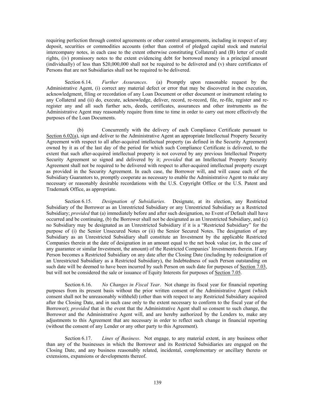 requiring perfection through control agreements or other control arrangements, including in respect of any deposit, securities or commodities accounts (other than control of pledged capital stock and material intercompany notes, in each case to the extent otherwise constituting Collateral) and (B) letter of credit rights, (iv) promissory notes to the extent evidencing debt for borrowed money in a principal amount (individually) of less than $20,000,000 shall not be required to be delivered and (v) share certificates of Persons that are not Subsidiaries shall not be required to be delivered. Section 6.14. Further Assurances. (a) Promptly upon reasonable request by the Administrative Agent, (i) correct any material defect or error that may be discovered in the execution, acknowledgment, filing or recordation of any Loan Document or other document or instrument relating to any Collateral and (ii) do, execute, acknowledge, deliver, record, re-record, file, re-file, register and re- register any and all such further acts, deeds, certificates, assurances and other instruments as the Administrative Agent may reasonably require from time to time in order to carry out more effectively the purposes of the Loan Documents. (b) Concurrently with the delivery of each Compliance Certificate pursuant to Section 6.02(a), sign and deliver to the Administrative Agent an appropriate Intellectual Property Security Agreement with respect to all after-acquired intellectual property (as defined in the Security Agreement) owned by it as of the last day of the period for which such Compliance Certificate is delivered, to the extent that such after-acquired intellectual property is not covered by any previous Intellectual Property Security Agreement so signed and delivered by it; provided that an Intellectual Property Security Agreement shall not be required to be delivered with respect to after-acquired intellectual property except as provided in the Security Agreement. In each case, the Borrower will, and will cause each of the Subsidiary Guarantors to, promptly cooperate as necessary to enable the Administrative Agent to make any necessary or reasonably desirable recordations with the U.S. Copyright Office or the U.S. Patent and Trademark Office, as appropriate. Section 6.15. Designation of Subsidiaries. Designate, at its election, any Restricted Subsidiary of the Borrower as an Unrestricted Subsidiary or any Unrestricted Subsidiary as a Restricted Subsidiary; provided that (a) immediately before and after such designation, no Event of Default shall have occurred and be continuing, (b) the Borrower shall not be designated as an Unrestricted Subsidiary, and (c) no Subsidiary may be designated as an Unrestricted Subsidiary if it is a “Restricted Subsidiary” for the purpose of (i) the Senior Unsecured Notes or (ii) the Senior Secured Notes. The designation of any Subsidiary as an Unrestricted Subsidiary shall constitute an Investment by the applicable Restricted Companies therein at the date of designation in an amount equal to the net book value (or, in the case of any guarantee or similar Investment, the amount) of the Restricted Companies’ Investments therein. If any Person becomes a Restricted Subsidiary on any date after the Closing Date (including by redesignation of an Unrestricted Subsidiary as a Restricted Subsidiary), the Indebtedness of such Person outstanding on such date will be deemed to have been incurred by such Person on such date for purposes of Section 7.03, but will not be considered the sale or issuance of Equity Interests for purposes of Section 7.05. Section 6.16. No Changes in Fiscal Year. Not change its fiscal year for financial reporting purposes from its present basis without the prior written consent of the Administrative Agent (which consent shall not be unreasonably withheld) (other than with respect to any Restricted Subsidiary acquired after the Closing Date, and in such case only to the extent necessary to conform to the fiscal year of the Borrower); provided that in the event that the Administrative Agent shall so consent to such change, the Borrower and the Administrative Agent will, and are hereby authorized by the Lenders to, make any adjustments to this Agreement that are necessary in order to reflect such change in financial reporting (without the consent of any Lender or any other party to this Agreement). Section 6.17. Lines of Business. Not engage, to any material extent, in any business other than any of the businesses in which the Borrower and its Restricted Subsidiaries are engaged on the Closing Date, and any business reasonably related, incidental, complementary or ancillary thereto or extensions, expansions or developments thereof. 139