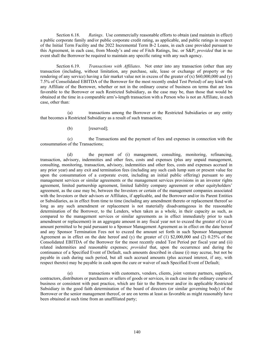 Section 6.18. Ratings. Use commercially reasonable efforts to obtain (and maintain in effect) a public corporate family and/or public corporate credit rating, as applicable, and public ratings in respect of the Initial Term Facility and the 2022 Incremental Term B-2 Loans, in each case provided pursuant to this Agreement, in each case, from Moody’s and one of Fitch Ratings, Inc. or S&P; provided that in no event shall the Borrower be required to maintain any specific rating with any such agency. Section 6.19. Transactions with Affiliates. Not enter into any transaction (other than any transaction (including, without limitation, any purchase, sale, lease or exchange of property or the rendering of any service) having a fair market value not in excess of the greater of (x) $60,000,000 and (y) 7.5% of Consolidated EBITDA of the Borrower for the most recently ended Test Period) of any kind with any Affiliate of the Borrower, whether or not in the ordinary course of business on terms that are less favorable to the Borrower or such Restricted Subsidiary, as the case may be, than those that would be obtained at the time in a comparable arm’s-length transaction with a Person who is not an Affiliate, in each case, other than: (a) transactions among the Borrower or the Restricted Subsidiaries or any entity that becomes a Restricted Subsidiary as a result of such transaction; (b) [reserved]; (c) the Transactions and the payment of fees and expenses in connection with the consummation of the Transactions; (d) the payment of (i) management, consulting, monitoring, refinancing, transaction, advisory, indemnities and other fees, costs and expenses (plus any unpaid management, consulting, monitoring, transaction, advisory, indemnities and other fees, costs and expenses accrued in any prior year) and any exit and termination fees (including any such cash lump sum or present value fee upon the consummation of a corporate event, including an initial public offering) pursuant to any management services or similar agreements or the management services provisions in an investor rights agreement, limited partnership agreement, limited liability company agreement or other equityholders’ agreement, as the case may be, between the Investors or certain of the management companies associated with the Investors or their advisors or Affiliates, if applicable, and the Borrower and/or its Parent Entities or Subsidiaries, as in effect from time to time (including any amendment thereto or replacement thereof so long as any such amendment or replacement is not materially disadvantageous in the reasonable determination of the Borrower, to the Lenders, when taken as a whole, in their capacity as such, as compared to the management services or similar agreements as in effect immediately prior to such amendment or replacement) in an aggregate amount in any fiscal year not to exceed the greater of (x) an amount permitted to be paid pursuant to a Sponsor Management Agreement as in effect on the date hereof and any Sponsor Termination Fees not to exceed the amount set forth in such Sponsor Management Agreement as in effect on the date hereof and (y) the greater of (1) $2,000,000 and (2) 0.25% of the Consolidated EBITDA of the Borrower for the most recently ended Test Period per fiscal year and (ii) related indemnities and reasonable expenses; provided that, upon the occurrence and during the continuance of a Specified Event of Default, such amounts described in clause (i) may accrue, but not be payable in cash during such period, but all such accrued amounts (plus accrued interest, if any, with respect thereto) may be payable in cash upon the cure or waiver of such Specified Event of Default; (e) transactions with customers, vendors, clients, joint venture partners, suppliers, contractors, distributors or purchasers or sellers of goods or services, in each case in the ordinary course of business or consistent with past practice, which are fair to the Borrower and/or its applicable Restricted Subsidiary in the good faith determination of the board of directors (or similar governing body) of the Borrower or the senior management thereof, or are on terms at least as favorable as might reasonably have been obtained at such time from an unaffiliated party; 140
