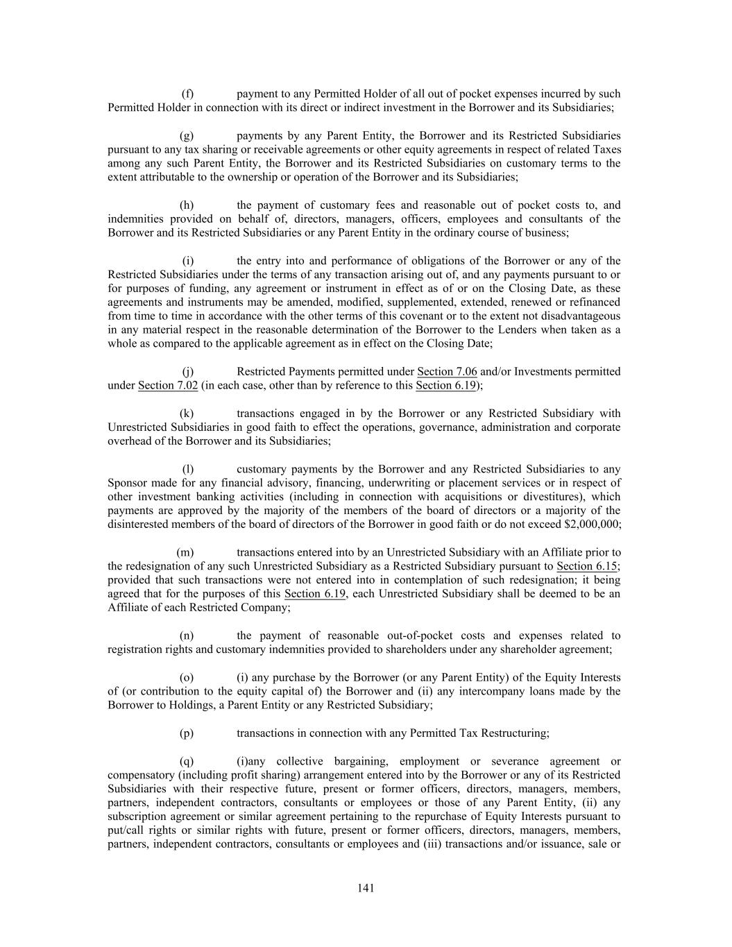 (f) payment to any Permitted Holder of all out of pocket expenses incurred by such Permitted Holder in connection with its direct or indirect investment in the Borrower and its Subsidiaries; (g) payments by any Parent Entity, the Borrower and its Restricted Subsidiaries pursuant to any tax sharing or receivable agreements or other equity agreements in respect of related Taxes among any such Parent Entity, the Borrower and its Restricted Subsidiaries on customary terms to the extent attributable to the ownership or operation of the Borrower and its Subsidiaries; (h) the payment of customary fees and reasonable out of pocket costs to, and indemnities provided on behalf of, directors, managers, officers, employees and consultants of the Borrower and its Restricted Subsidiaries or any Parent Entity in the ordinary course of business; (i) the entry into and performance of obligations of the Borrower or any of the Restricted Subsidiaries under the terms of any transaction arising out of, and any payments pursuant to or for purposes of funding, any agreement or instrument in effect as of or on the Closing Date, as these agreements and instruments may be amended, modified, supplemented, extended, renewed or refinanced from time to time in accordance with the other terms of this covenant or to the extent not disadvantageous in any material respect in the reasonable determination of the Borrower to the Lenders when taken as a whole as compared to the applicable agreement as in effect on the Closing Date; (j) Restricted Payments permitted under Section 7.06 and/or Investments permitted under Section 7.02 (in each case, other than by reference to this Section 6.19); (k) transactions engaged in by the Borrower or any Restricted Subsidiary with Unrestricted Subsidiaries in good faith to effect the operations, governance, administration and corporate overhead of the Borrower and its Subsidiaries; (l) customary payments by the Borrower and any Restricted Subsidiaries to any Sponsor made for any financial advisory, financing, underwriting or placement services or in respect of other investment banking activities (including in connection with acquisitions or divestitures), which payments are approved by the majority of the members of the board of directors or a majority of the disinterested members of the board of directors of the Borrower in good faith or do not exceed $2,000,000; (m) transactions entered into by an Unrestricted Subsidiary with an Affiliate prior to the redesignation of any such Unrestricted Subsidiary as a Restricted Subsidiary pursuant to Section 6.15; provided that such transactions were not entered into in contemplation of such redesignation; it being agreed that for the purposes of this Section 6.19, each Unrestricted Subsidiary shall be deemed to be an Affiliate of each Restricted Company; (n) the payment of reasonable out-of-pocket costs and expenses related to registration rights and customary indemnities provided to shareholders under any shareholder agreement; (o) (i) any purchase by the Borrower (or any Parent Entity) of the Equity Interests of (or contribution to the equity capital of) the Borrower and (ii) any intercompany loans made by the Borrower to Holdings, a Parent Entity or any Restricted Subsidiary; (p) transactions in connection with any Permitted Tax Restructuring; (q) (i)any collective bargaining, employment or severance agreement or compensatory (including profit sharing) arrangement entered into by the Borrower or any of its Restricted Subsidiaries with their respective future, present or former officers, directors, managers, members, partners, independent contractors, consultants or employees or those of any Parent Entity, (ii) any subscription agreement or similar agreement pertaining to the repurchase of Equity Interests pursuant to put/call rights or similar rights with future, present or former officers, directors, managers, members, partners, independent contractors, consultants or employees and (iii) transactions and/or issuance, sale or 141