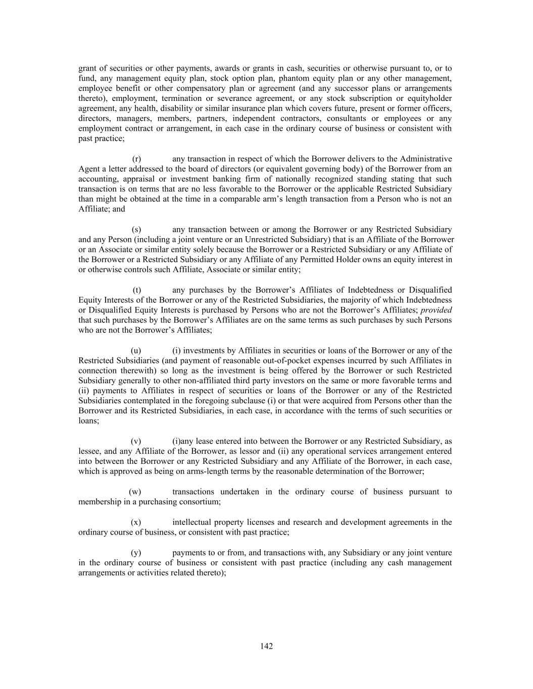 grant of securities or other payments, awards or grants in cash, securities or otherwise pursuant to, or to fund, any management equity plan, stock option plan, phantom equity plan or any other management, employee benefit or other compensatory plan or agreement (and any successor plans or arrangements thereto), employment, termination or severance agreement, or any stock subscription or equityholder agreement, any health, disability or similar insurance plan which covers future, present or former officers, directors, managers, members, partners, independent contractors, consultants or employees or any employment contract or arrangement, in each case in the ordinary course of business or consistent with past practice; (r) any transaction in respect of which the Borrower delivers to the Administrative Agent a letter addressed to the board of directors (or equivalent governing body) of the Borrower from an accounting, appraisal or investment banking firm of nationally recognized standing stating that such transaction is on terms that are no less favorable to the Borrower or the applicable Restricted Subsidiary than might be obtained at the time in a comparable arm’s length transaction from a Person who is not an Affiliate; and (s) any transaction between or among the Borrower or any Restricted Subsidiary and any Person (including a joint venture or an Unrestricted Subsidiary) that is an Affiliate of the Borrower or an Associate or similar entity solely because the Borrower or a Restricted Subsidiary or any Affiliate of the Borrower or a Restricted Subsidiary or any Affiliate of any Permitted Holder owns an equity interest in or otherwise controls such Affiliate, Associate or similar entity; (t) any purchases by the Borrower’s Affiliates of Indebtedness or Disqualified Equity Interests of the Borrower or any of the Restricted Subsidiaries, the majority of which Indebtedness or Disqualified Equity Interests is purchased by Persons who are not the Borrower’s Affiliates; provided that such purchases by the Borrower’s Affiliates are on the same terms as such purchases by such Persons who are not the Borrower’s Affiliates; (u) (i) investments by Affiliates in securities or loans of the Borrower or any of the Restricted Subsidiaries (and payment of reasonable out-of-pocket expenses incurred by such Affiliates in connection therewith) so long as the investment is being offered by the Borrower or such Restricted Subsidiary generally to other non-affiliated third party investors on the same or more favorable terms and (ii) payments to Affiliates in respect of securities or loans of the Borrower or any of the Restricted Subsidiaries contemplated in the foregoing subclause (i) or that were acquired from Persons other than the Borrower and its Restricted Subsidiaries, in each case, in accordance with the terms of such securities or loans; (v) (i)any lease entered into between the Borrower or any Restricted Subsidiary, as lessee, and any Affiliate of the Borrower, as lessor and (ii) any operational services arrangement entered into between the Borrower or any Restricted Subsidiary and any Affiliate of the Borrower, in each case, which is approved as being on arms-length terms by the reasonable determination of the Borrower; (w) transactions undertaken in the ordinary course of business pursuant to membership in a purchasing consortium; (x) intellectual property licenses and research and development agreements in the ordinary course of business, or consistent with past practice; (y) payments to or from, and transactions with, any Subsidiary or any joint venture in the ordinary course of business or consistent with past practice (including any cash management arrangements or activities related thereto); 142