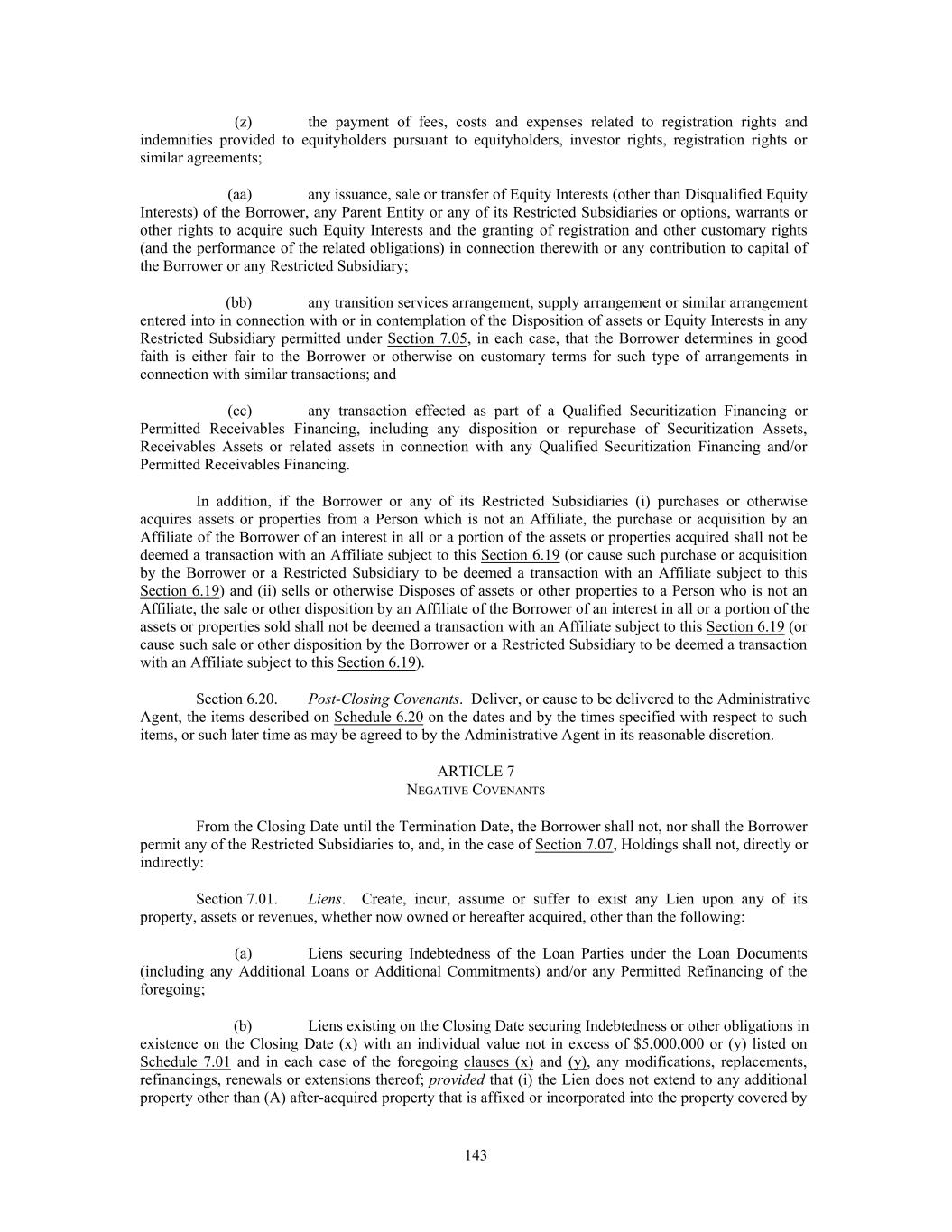 (z) the payment of fees, costs and expenses related to registration rights and indemnities provided to equityholders pursuant to equityholders, investor rights, registration rights or similar agreements; (aa) any issuance, sale or transfer of Equity Interests (other than Disqualified Equity Interests) of the Borrower, any Parent Entity or any of its Restricted Subsidiaries or options, warrants or other rights to acquire such Equity Interests and the granting of registration and other customary rights (and the performance of the related obligations) in connection therewith or any contribution to capital of the Borrower or any Restricted Subsidiary; (bb) any transition services arrangement, supply arrangement or similar arrangement entered into in connection with or in contemplation of the Disposition of assets or Equity Interests in any Restricted Subsidiary permitted under Section 7.05, in each case, that the Borrower determines in good faith is either fair to the Borrower or otherwise on customary terms for such type of arrangements in connection with similar transactions; and (cc) any transaction effected as part of a Qualified Securitization Financing or Permitted Receivables Financing, including any disposition or repurchase of Securitization Assets, Receivables Assets or related assets in connection with any Qualified Securitization Financing and/or Permitted Receivables Financing. In addition, if the Borrower or any of its Restricted Subsidiaries (i) purchases or otherwise acquires assets or properties from a Person which is not an Affiliate, the purchase or acquisition by an Affiliate of the Borrower of an interest in all or a portion of the assets or properties acquired shall not be deemed a transaction with an Affiliate subject to this Section 6.19 (or cause such purchase or acquisition by the Borrower or a Restricted Subsidiary to be deemed a transaction with an Affiliate subject to this Section 6.19) and (ii) sells or otherwise Disposes of assets or other properties to a Person who is not an Affiliate, the sale or other disposition by an Affiliate of the Borrower of an interest in all or a portion of the assets or properties sold shall not be deemed a transaction with an Affiliate subject to this Section 6.19 (or cause such sale or other disposition by the Borrower or a Restricted Subsidiary to be deemed a transaction with an Affiliate subject to this Section 6.19). Section 6.20. Post-Closing Covenants. Deliver, or cause to be delivered to the Administrative Agent, the items described on Schedule 6.20 on the dates and by the times specified with respect to such items, or such later time as may be agreed to by the Administrative Agent in its reasonable discretion. ARTICLE 7 NEGATIVE COVENANTS From the Closing Date until the Termination Date, the Borrower shall not, nor shall the Borrower permit any of the Restricted Subsidiaries to, and, in the case of Section 7.07, Holdings shall not, directly or indirectly: Section 7.01. Liens. Create, incur, assume or suffer to exist any Lien upon any of its property, assets or revenues, whether now owned or hereafter acquired, other than the following: (a) Liens securing Indebtedness of the Loan Parties under the Loan Documents (including any Additional Loans or Additional Commitments) and/or any Permitted Refinancing of the foregoing; (b) Liens existing on the Closing Date securing Indebtedness or other obligations in existence on the Closing Date (x) with an individual value not in excess of $5,000,000 or (y) listed on Schedule 7.01 and in each case of the foregoing clauses (x) and (y), any modifications, replacements, refinancings, renewals or extensions thereof; provided that (i) the Lien does not extend to any additional property other than (A) after-acquired property that is affixed or incorporated into the property covered by 143