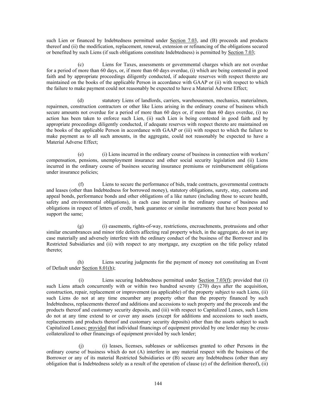 such Lien or financed by Indebtedness permitted under Section 7.03, and (B) proceeds and products thereof and (ii) the modification, replacement, renewal, extension or refinancing of the obligations secured or benefited by such Liens (if such obligations constitute Indebtedness) is permitted by Section 7.03; (c) Liens for Taxes, assessments or governmental charges which are not overdue for a period of more than 60 days, or, if more than 60 days overdue, (i) which are being contested in good faith and by appropriate proceedings diligently conducted, if adequate reserves with respect thereto are maintained on the books of the applicable Person in accordance with GAAP or (ii) with respect to which the failure to make payment could not reasonably be expected to have a Material Adverse Effect; (d) statutory Liens of landlords, carriers, warehousemen, mechanics, materialmen, repairmen, construction contractors or other like Liens arising in the ordinary course of business which secure amounts not overdue for a period of more than 60 days or, if more than 60 days overdue, (i) no action has been taken to enforce such Lien, (ii) such Lien is being contested in good faith and by appropriate proceedings diligently conducted, if adequate reserves with respect thereto are maintained on the books of the applicable Person in accordance with GAAP or (iii) with respect to which the failure to make payment as to all such amounts, in the aggregate, could not reasonably be expected to have a Material Adverse Effect; (e) (i) Liens incurred in the ordinary course of business in connection with workers’ compensation, pensions, unemployment insurance and other social security legislation and (ii) Liens incurred in the ordinary course of business securing insurance premiums or reimbursement obligations under insurance policies; (f) Liens to secure the performance of bids, trade contracts, governmental contracts and leases (other than Indebtedness for borrowed money), statutory obligations, surety, stay, customs and appeal bonds, performance bonds and other obligations of a like nature (including those to secure health, safety and environmental obligations), in each case incurred in the ordinary course of business and obligations in respect of letters of credit, bank guarantee or similar instruments that have been posted to support the same; (g) (i) easements, rights-of-way, restrictions, encroachments, protrusions and other similar encumbrances and minor title defects affecting real property which, in the aggregate, do not in any case materially and adversely interfere with the ordinary conduct of the business of the Borrower and its Restricted Subsidiaries and (ii) with respect to any mortgage, any exception on the title policy related thereto; (h) Liens securing judgments for the payment of money not constituting an Event of Default under Section 8.01(h); (i) Liens securing Indebtedness permitted under Section 7.03(f); provided that (i) such Liens attach concurrently with or within two hundred seventy (270) days after the acquisition, construction, repair, replacement or improvement (as applicable) of the property subject to such Liens, (ii) such Liens do not at any time encumber any property other than the property financed by such Indebtedness, replacements thereof and additions and accessions to such property and the proceeds and the products thereof and customary security deposits, and (iii) with respect to Capitalized Leases, such Liens do not at any time extend to or cover any assets (except for additions and accessions to such assets, replacements and products thereof and customary security deposits) other than the assets subject to such Capitalized Leases; provided that individual financings of equipment provided by one lender may be cross- collateralized to other financings of equipment provided by such lender; (j) (i) leases, licenses, subleases or sublicenses granted to other Persons in the ordinary course of business which do not (A) interfere in any material respect with the business of the Borrower or any of its material Restricted Subsidiaries or (B) secure any Indebtedness (other than any obligation that is Indebtedness solely as a result of the operation of clause (e) of the definition thereof), (ii) 144