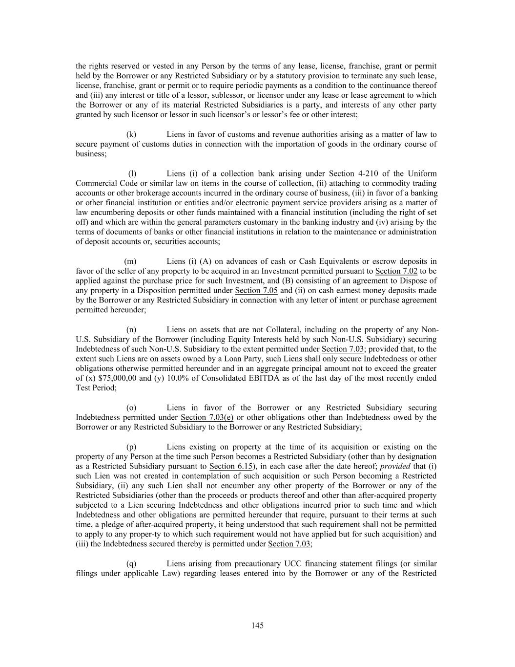 the rights reserved or vested in any Person by the terms of any lease, license, franchise, grant or permit held by the Borrower or any Restricted Subsidiary or by a statutory provision to terminate any such lease, license, franchise, grant or permit or to require periodic payments as a condition to the continuance thereof and (iii) any interest or title of a lessor, sublessor, or licensor under any lease or lease agreement to which the Borrower or any of its material Restricted Subsidiaries is a party, and interests of any other party granted by such licensor or lessor in such licensor’s or lessor’s fee or other interest; (k) Liens in favor of customs and revenue authorities arising as a matter of law to secure payment of customs duties in connection with the importation of goods in the ordinary course of business; (l) Liens (i) of a collection bank arising under Section 4-210 of the Uniform Commercial Code or similar law on items in the course of collection, (ii) attaching to commodity trading accounts or other brokerage accounts incurred in the ordinary course of business, (iii) in favor of a banking or other financial institution or entities and/or electronic payment service providers arising as a matter of law encumbering deposits or other funds maintained with a financial institution (including the right of set off) and which are within the general parameters customary in the banking industry and (iv) arising by the terms of documents of banks or other financial institutions in relation to the maintenance or administration of deposit accounts or, securities accounts; (m) Liens (i) (A) on advances of cash or Cash Equivalents or escrow deposits in favor of the seller of any property to be acquired in an Investment permitted pursuant to Section 7.02 to be applied against the purchase price for such Investment, and (B) consisting of an agreement to Dispose of any property in a Disposition permitted under Section 7.05 and (ii) on cash earnest money deposits made by the Borrower or any Restricted Subsidiary in connection with any letter of intent or purchase agreement permitted hereunder; (n) Liens on assets that are not Collateral, including on the property of any Non- U.S. Subsidiary of the Borrower (including Equity Interests held by such Non-U.S. Subsidiary) securing Indebtedness of such Non-U.S. Subsidiary to the extent permitted under Section 7.03; provided that, to the extent such Liens are on assets owned by a Loan Party, such Liens shall only secure Indebtedness or other obligations otherwise permitted hereunder and in an aggregate principal amount not to exceed the greater of (x) $75,000,00 and (y) 10.0% of Consolidated EBITDA as of the last day of the most recently ended Test Period; (o) Liens in favor of the Borrower or any Restricted Subsidiary securing Indebtedness permitted under Section 7.03(e) or other obligations other than Indebtedness owed by the Borrower or any Restricted Subsidiary to the Borrower or any Restricted Subsidiary; (p) Liens existing on property at the time of its acquisition or existing on the property of any Person at the time such Person becomes a Restricted Subsidiary (other than by designation as a Restricted Subsidiary pursuant to Section 6.15), in each case after the date hereof; provided that (i) such Lien was not created in contemplation of such acquisition or such Person becoming a Restricted Subsidiary, (ii) any such Lien shall not encumber any other property of the Borrower or any of the Restricted Subsidiaries (other than the proceeds or products thereof and other than after-acquired property subjected to a Lien securing Indebtedness and other obligations incurred prior to such time and which Indebtedness and other obligations are permitted hereunder that require, pursuant to their terms at such time, a pledge of after-acquired property, it being understood that such requirement shall not be permitted to apply to any proper-ty to which such requirement would not have applied but for such acquisition) and (iii) the Indebtedness secured thereby is permitted under Section 7.03; (q) Liens arising from precautionary UCC financing statement filings (or similar filings under applicable Law) regarding leases entered into by the Borrower or any of the Restricted 145