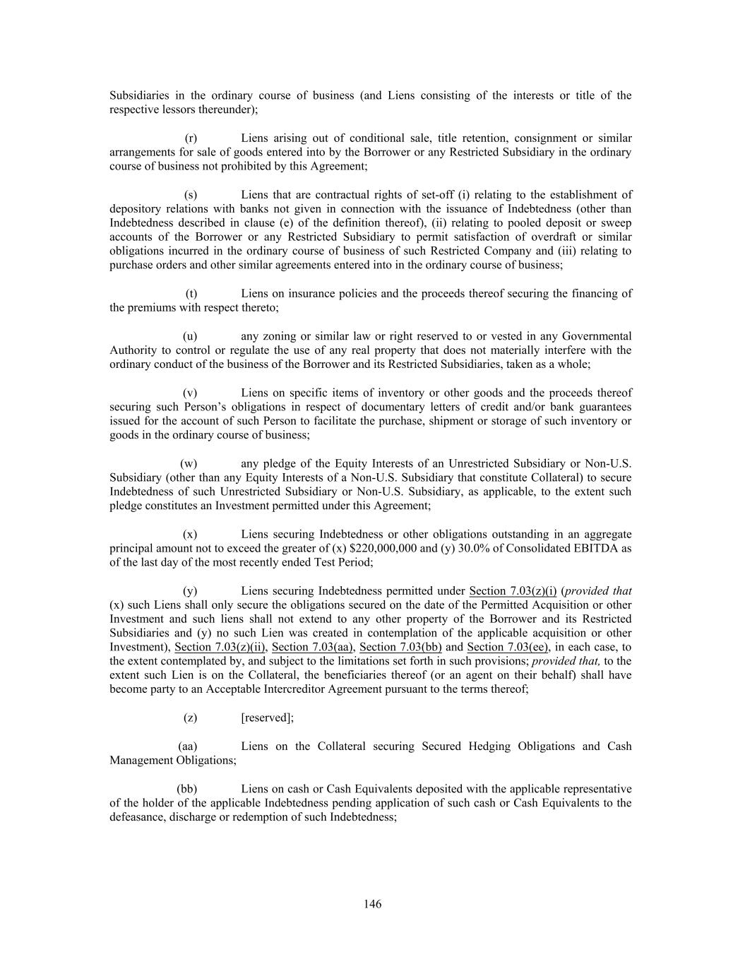 Subsidiaries in the ordinary course of business (and Liens consisting of the interests or title of the respective lessors thereunder); (r) Liens arising out of conditional sale, title retention, consignment or similar arrangements for sale of goods entered into by the Borrower or any Restricted Subsidiary in the ordinary course of business not prohibited by this Agreement; (s) Liens that are contractual rights of set-off (i) relating to the establishment of depository relations with banks not given in connection with the issuance of Indebtedness (other than Indebtedness described in clause (e) of the definition thereof), (ii) relating to pooled deposit or sweep accounts of the Borrower or any Restricted Subsidiary to permit satisfaction of overdraft or similar obligations incurred in the ordinary course of business of such Restricted Company and (iii) relating to purchase orders and other similar agreements entered into in the ordinary course of business; (t) Liens on insurance policies and the proceeds thereof securing the financing of the premiums with respect thereto; (u) any zoning or similar law or right reserved to or vested in any Governmental Authority to control or regulate the use of any real property that does not materially interfere with the ordinary conduct of the business of the Borrower and its Restricted Subsidiaries, taken as a whole; (v) Liens on specific items of inventory or other goods and the proceeds thereof securing such Person’s obligations in respect of documentary letters of credit and/or bank guarantees issued for the account of such Person to facilitate the purchase, shipment or storage of such inventory or goods in the ordinary course of business; (w) any pledge of the Equity Interests of an Unrestricted Subsidiary or Non-U.S. Subsidiary (other than any Equity Interests of a Non-U.S. Subsidiary that constitute Collateral) to secure Indebtedness of such Unrestricted Subsidiary or Non-U.S. Subsidiary, as applicable, to the extent such pledge constitutes an Investment permitted under this Agreement; (x) Liens securing Indebtedness or other obligations outstanding in an aggregate principal amount not to exceed the greater of (x) $220,000,000 and (y) 30.0% of Consolidated EBITDA as of the last day of the most recently ended Test Period; (y) Liens securing Indebtedness permitted under Section 7.03(z)(i) (provided that (x) such Liens shall only secure the obligations secured on the date of the Permitted Acquisition or other Investment and such liens shall not extend to any other property of the Borrower and its Restricted Subsidiaries and (y) no such Lien was created in contemplation of the applicable acquisition or other Investment), Section 7.03(z)(ii), Section 7.03(aa), Section 7.03(bb) and Section 7.03(ee), in each case, to the extent contemplated by, and subject to the limitations set forth in such provisions; provided that, to the extent such Lien is on the Collateral, the beneficiaries thereof (or an agent on their behalf) shall have become party to an Acceptable Intercreditor Agreement pursuant to the terms thereof; (z) [reserved]; (aa) Liens on the Collateral securing Secured Hedging Obligations and Cash Management Obligations; (bb) Liens on cash or Cash Equivalents deposited with the applicable representative of the holder of the applicable Indebtedness pending application of such cash or Cash Equivalents to the defeasance, discharge or redemption of such Indebtedness; 146