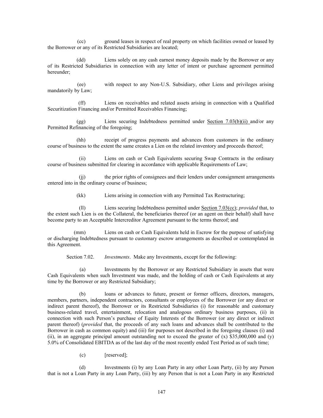 (cc) ground leases in respect of real property on which facilities owned or leased by the Borrower or any of its Restricted Subsidiaries are located; (dd) Liens solely on any cash earnest money deposits made by the Borrower or any of its Restricted Subsidiaries in connection with any letter of intent or purchase agreement permitted hereunder; (ee) with respect to any Non-U.S. Subsidiary, other Liens and privileges arising mandatorily by Law; (ff) Liens on receivables and related assets arising in connection with a Qualified Securitization Financing and/or Permitted Receivables Financing; (gg) Liens securing Indebtedness permitted under Section 7.03(b)(ii) and/or any Permitted Refinancing of the foregoing; (hh) receipt of progress payments and advances from customers in the ordinary course of business to the extent the same creates a Lien on the related inventory and proceeds thereof; (ii) Liens on cash or Cash Equivalents securing Swap Contracts in the ordinary course of business submitted for clearing in accordance with applicable Requirements of Law; (jj) the prior rights of consignees and their lenders under consignment arrangements entered into in the ordinary course of business; (kk) Liens arising in connection with any Permitted Tax Restructuring; (ll) Liens securing Indebtedness permitted under Section 7.03(cc); provided that, to the extent such Lien is on the Collateral, the beneficiaries thereof (or an agent on their behalf) shall have become party to an Acceptable Intercreditor Agreement pursuant to the terms thereof; and (mm) Liens on cash or Cash Equivalents held in Escrow for the purpose of satisfying or discharging Indebtedness pursuant to customary escrow arrangements as described or contemplated in this Agreement. Section 7.02. Investments. Make any Investments, except for the following: (a) Investments by the Borrower or any Restricted Subsidiary in assets that were Cash Equivalents when such Investment was made, and the holding of cash or Cash Equivalents at any time by the Borrower or any Restricted Subsidiary; (b) loans or advances to future, present or former officers, directors, managers, members, partners, independent contractors, consultants or employees of the Borrower (or any direct or indirect parent thereof), the Borrower or its Restricted Subsidiaries (i) for reasonable and customary business-related travel, entertainment, relocation and analogous ordinary business purposes, (ii) in connection with such Person’s purchase of Equity Interests of the Borrower (or any direct or indirect parent thereof) (provided that, the proceeds of any such loans and advances shall be contributed to the Borrower in cash as common equity) and (iii) for purposes not described in the foregoing clauses (i) and (ii), in an aggregate principal amount outstanding not to exceed the greater of (x) $35,000,000 and (y) 5.0% of Consolidated EBITDA as of the last day of the most recently ended Test Period as of such time; (c) [reserved]; (d) Investments (i) by any Loan Party in any other Loan Party, (ii) by any Person that is not a Loan Party in any Loan Party, (iii) by any Person that is not a Loan Party in any Restricted 147