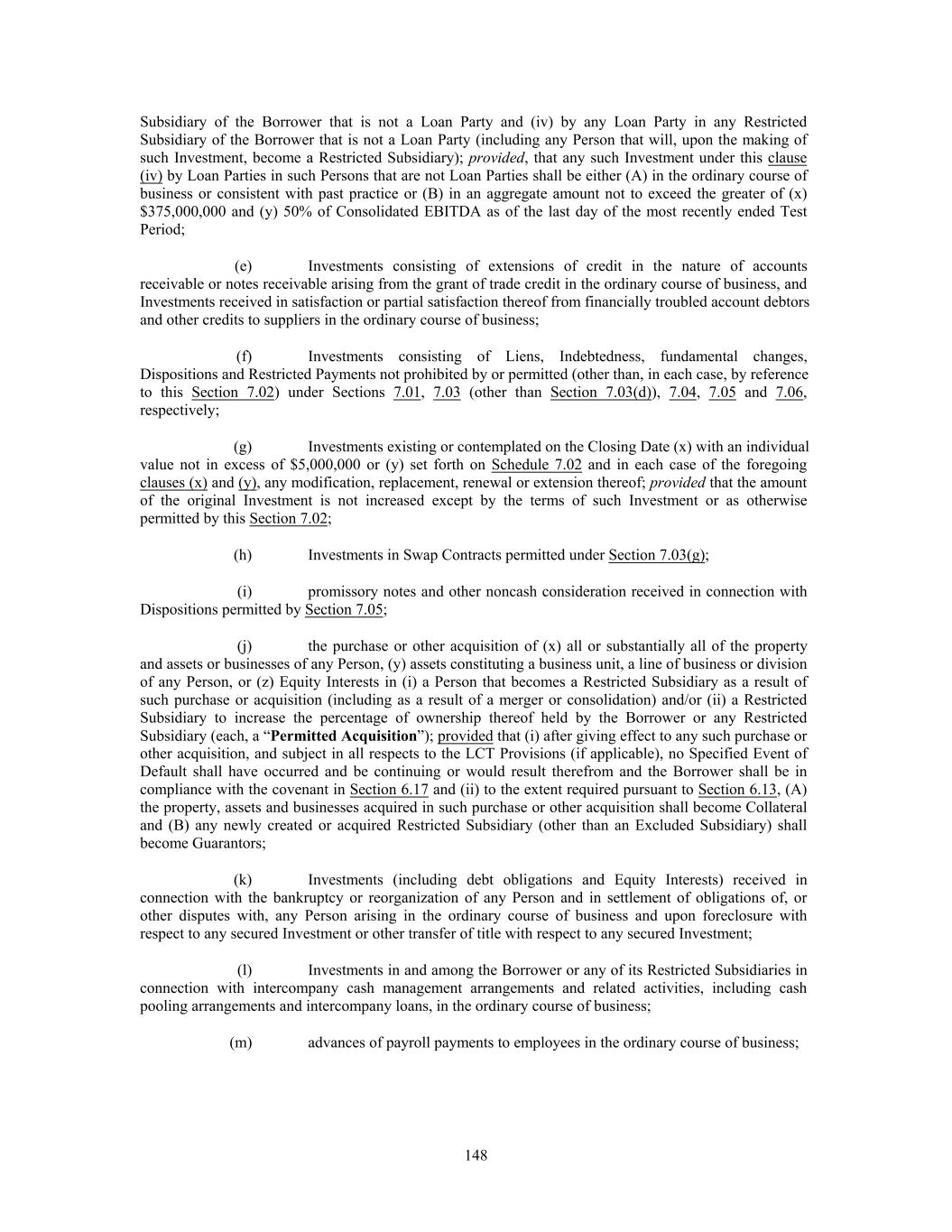 Subsidiary of the Borrower that is not a Loan Party and (iv) by any Loan Party in any Restricted Subsidiary of the Borrower that is not a Loan Party (including any Person that will, upon the making of such Investment, become a Restricted Subsidiary); provided, that any such Investment under this clause (iv) by Loan Parties in such Persons that are not Loan Parties shall be either (A) in the ordinary course of business or consistent with past practice or (B) in an aggregate amount not to exceed the greater of (x) $375,000,000 and (y) 50% of Consolidated EBITDA as of the last day of the most recently ended Test Period; (e) Investments consisting of extensions of credit in the nature of accounts receivable or notes receivable arising from the grant of trade credit in the ordinary course of business, and Investments received in satisfaction or partial satisfaction thereof from financially troubled account debtors and other credits to suppliers in the ordinary course of business; (f) Investments consisting of Liens, Indebtedness, fundamental changes, Dispositions and Restricted Payments not prohibited by or permitted (other than, in each case, by reference to this Section 7.02) under Sections 7.01, 7.03 (other than Section 7.03(d)), 7.04, 7.05 and 7.06, respectively; (g) Investments existing or contemplated on the Closing Date (x) with an individual value not in excess of $5,000,000 or (y) set forth on Schedule 7.02 and in each case of the foregoing clauses (x) and (y), any modification, replacement, renewal or extension thereof; provided that the amount of the original Investment is not increased except by the terms of such Investment or as otherwise permitted by this Section 7.02; (h) Investments in Swap Contracts permitted under Section 7.03(g); (i) promissory notes and other noncash consideration received in connection with Dispositions permitted by Section 7.05; (j) the purchase or other acquisition of (x) all or substantially all of the property and assets or businesses of any Person, (y) assets constituting a business unit, a line of business or division of any Person, or (z) Equity Interests in (i) a Person that becomes a Restricted Subsidiary as a result of such purchase or acquisition (including as a result of a merger or consolidation) and/or (ii) a Restricted Subsidiary to increase the percentage of ownership thereof held by the Borrower or any Restricted Subsidiary (each, a “Permitted Acquisition”); provided that (i) after giving effect to any such purchase or other acquisition, and subject in all respects to the LCT Provisions (if applicable), no Specified Event of Default shall have occurred and be continuing or would result therefrom and the Borrower shall be in compliance with the covenant in Section 6.17 and (ii) to the extent required pursuant to Section 6.13, (A) the property, assets and businesses acquired in such purchase or other acquisition shall become Collateral and (B) any newly created or acquired Restricted Subsidiary (other than an Excluded Subsidiary) shall become Guarantors; (k) Investments (including debt obligations and Equity Interests) received in connection with the bankruptcy or reorganization of any Person and in settlement of obligations of, or other disputes with, any Person arising in the ordinary course of business and upon foreclosure with respect to any secured Investment or other transfer of title with respect to any secured Investment; (l) Investments in and among the Borrower or any of its Restricted Subsidiaries in connection with intercompany cash management arrangements and related activities, including cash pooling arrangements and intercompany loans, in the ordinary course of business; (m) advances of payroll payments to employees in the ordinary course of business; 148